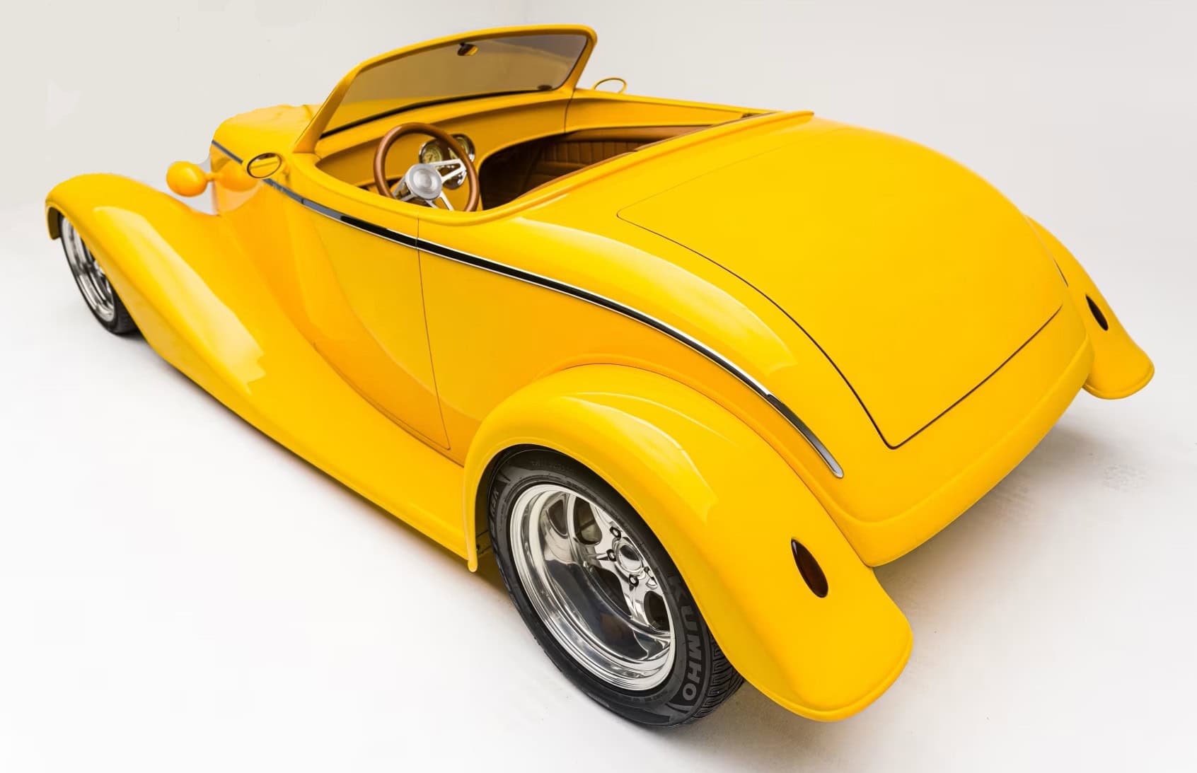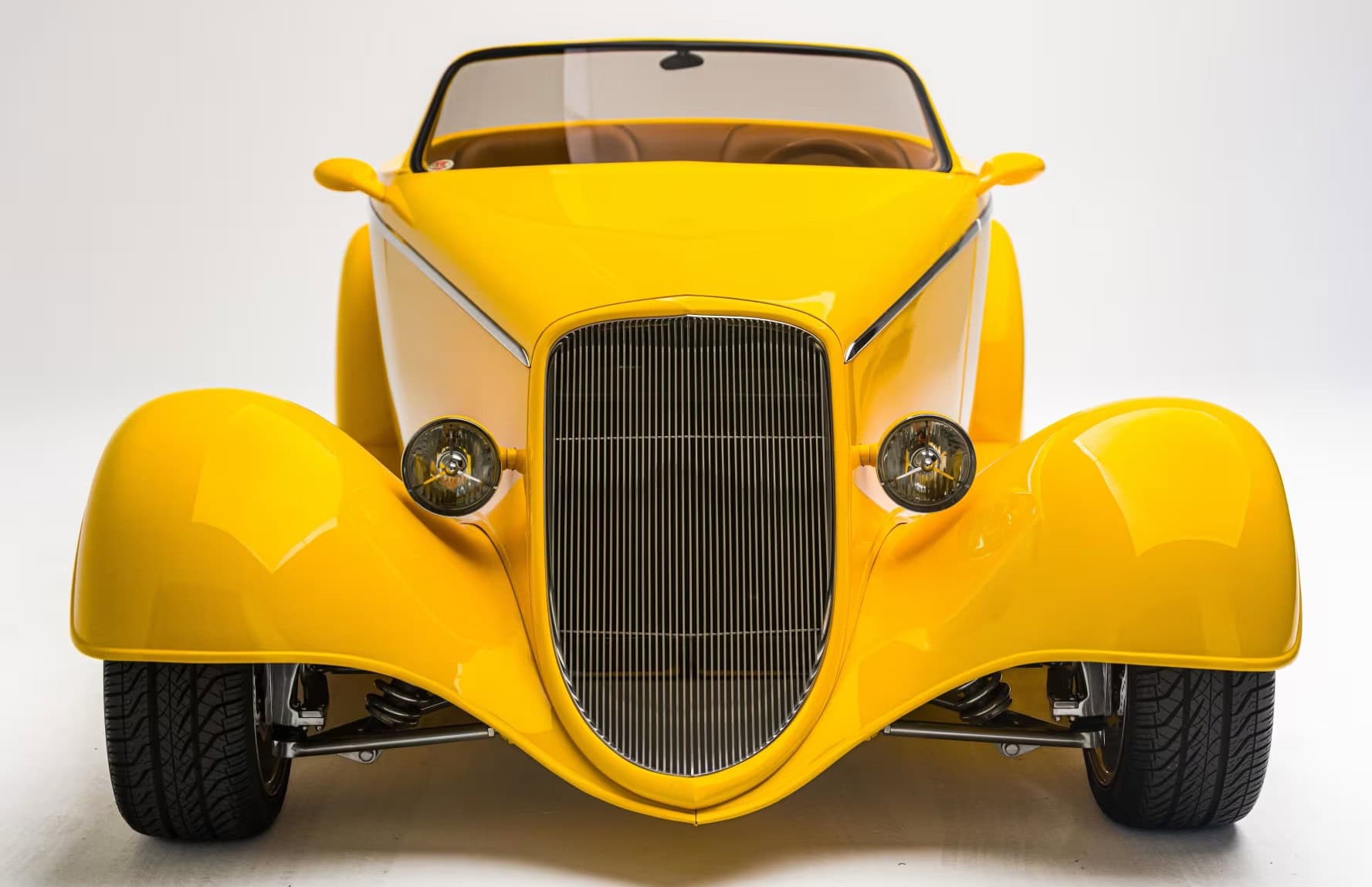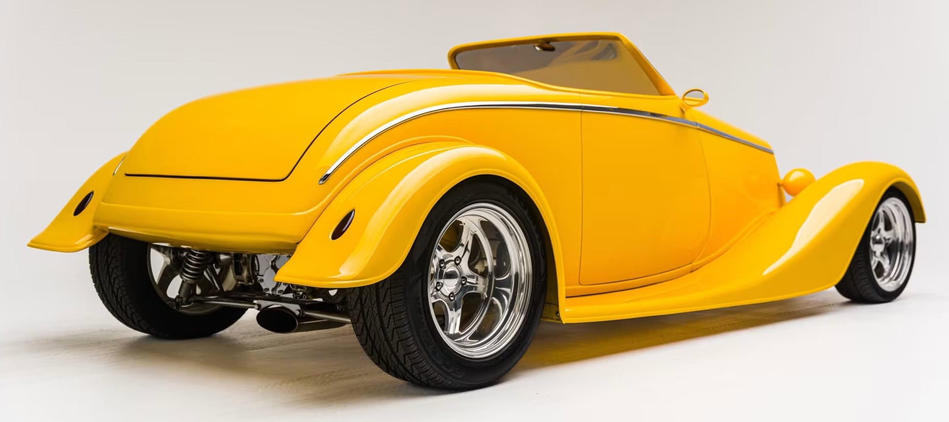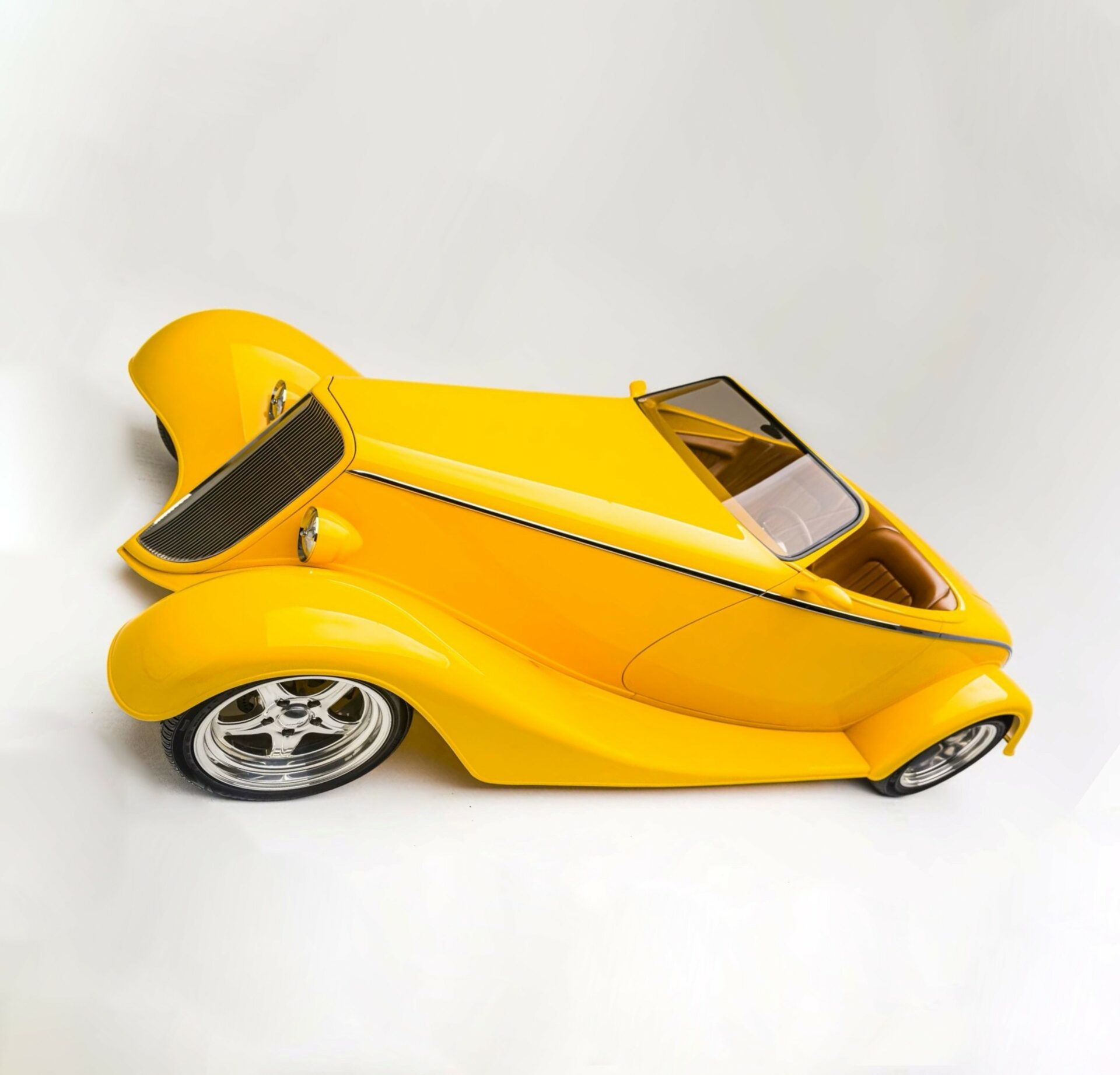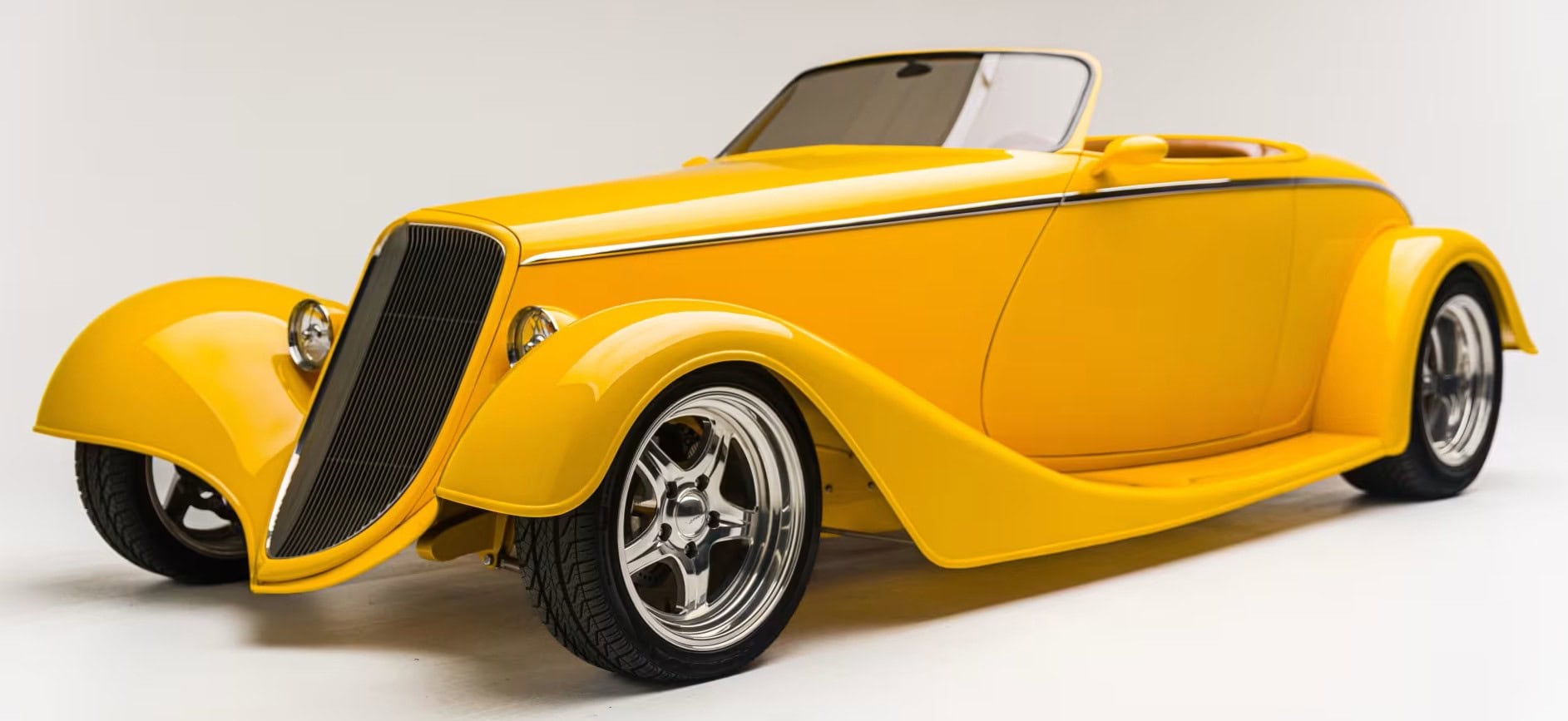 Cette construction présente une carrosserie Ford roadster 1933 sur mesure entièrement en acier, mais pas polie/lustrée mais recouverte de peinture PPG Yellow Chrome. Le concept dans la tête de Chip Foose était de réimaginer une ancienne Ford Street Rod construite dans le style européen, présentant donc des lignes simplistes avec des surfaces lissées, un pare-brise arrondi et fort penché vers l’arrière, avec seulement quelques touches brillantes comme la calandre avant, les garnitures latérales et les jantes. À l’intérieur, on trouve un intérieur entièrement personnalisé conçu par Chris Brown avec une sellerie cousue à la main par Gabe Lopez, ainsi que des jantes en aluminium en billettes d’alu uniques et divers panneaux personnalisés.