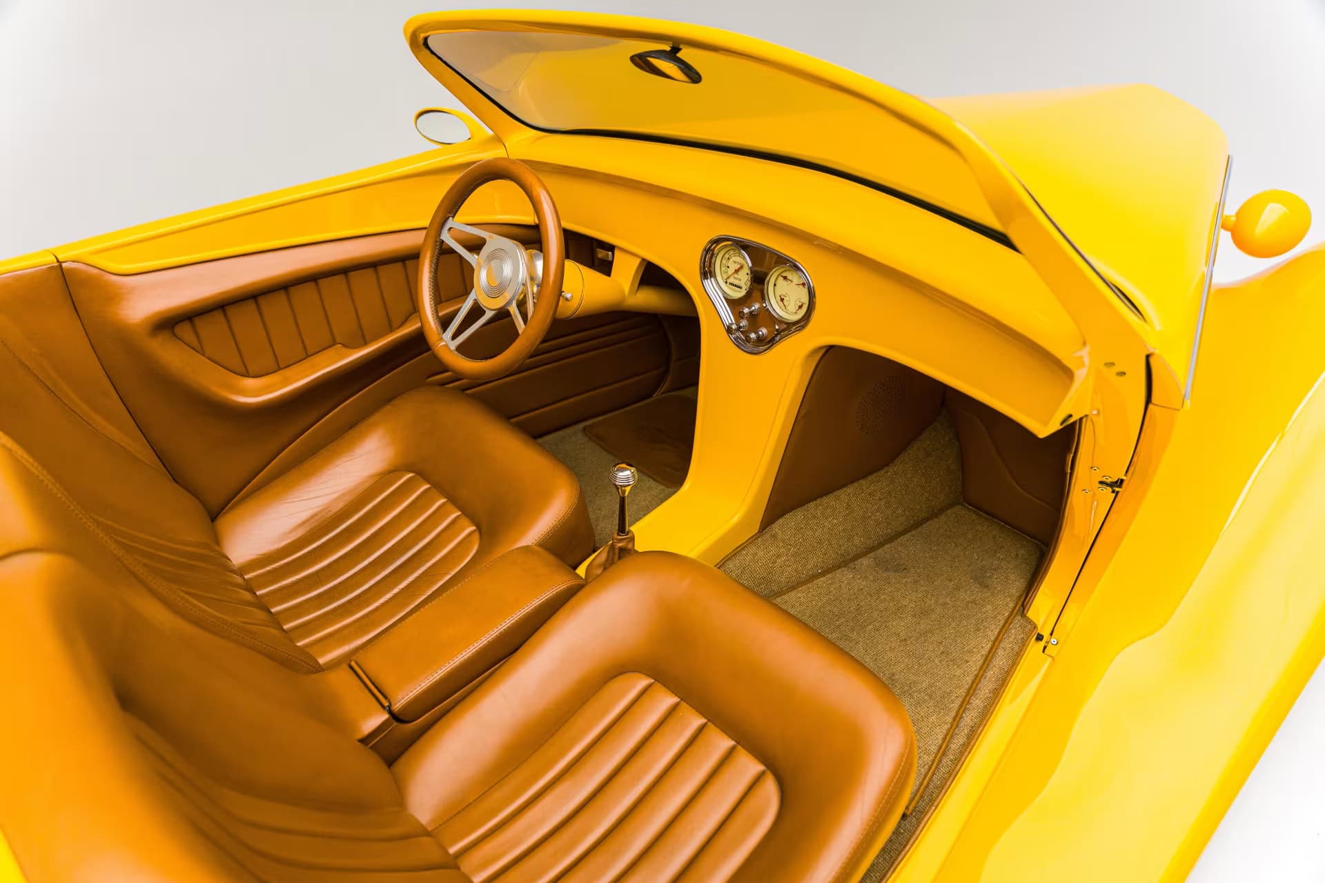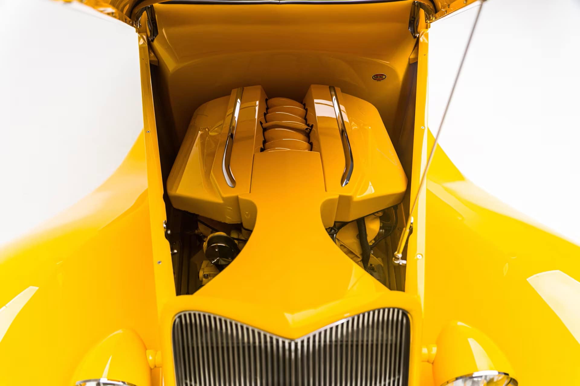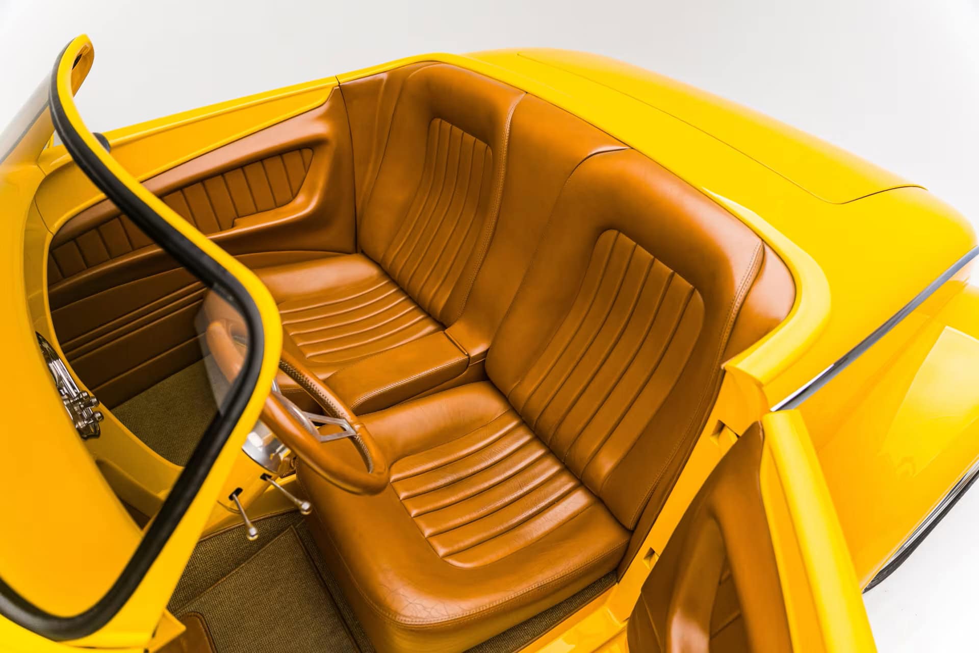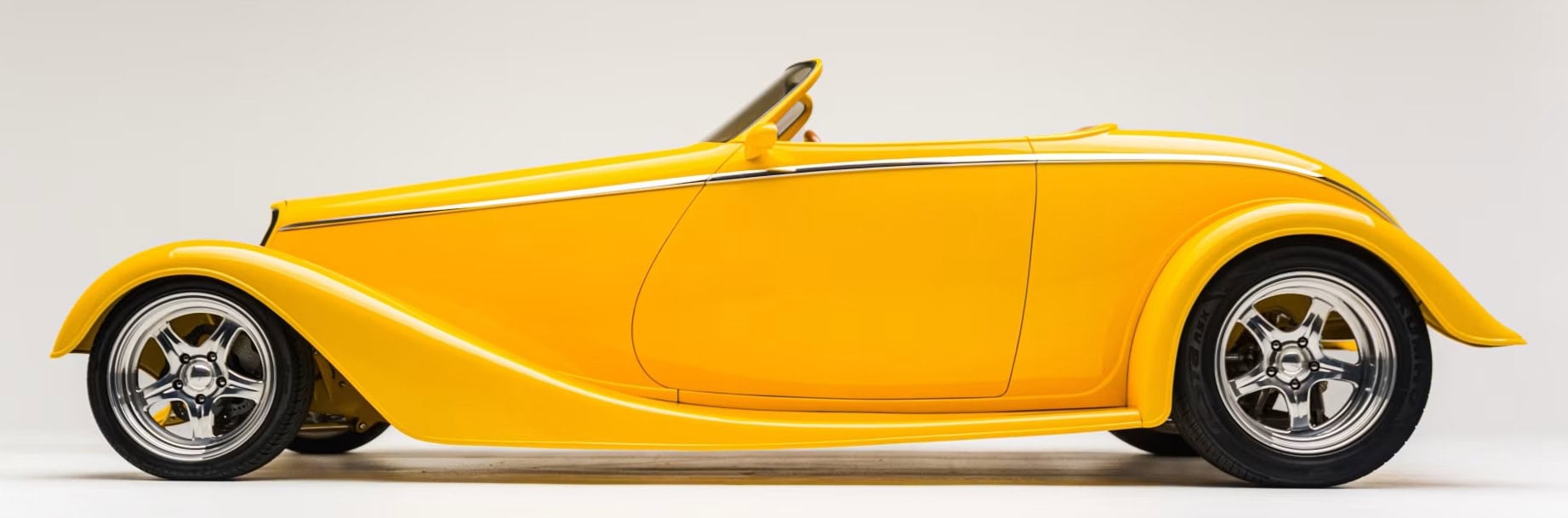 Cette construction présente une carrosserie Ford roadster 1933 sur mesure entièrement en acier, mais pas polie/lustrée mais recouverte de peinture PPG Yellow Chrome. Le concept dans la tête de Chip Foose était de réimaginer une ancienne Ford Street Rod construite dans le style européen, présentant donc des lignes simplistes avec des surfaces lissées, un pare-brise arrondi et fort penché vers l’arrière, avec seulement quelques touches brillantes comme la calandre avant, les garnitures latérales et les jantes. À l’intérieur, on trouve un intérieur entièrement personnalisé conçu par Chris Brown avec une sellerie cousue à la main par Gabe Lopez, ainsi que des jantes en aluminium en billettes d’alu uniques et divers panneaux personnalisés.