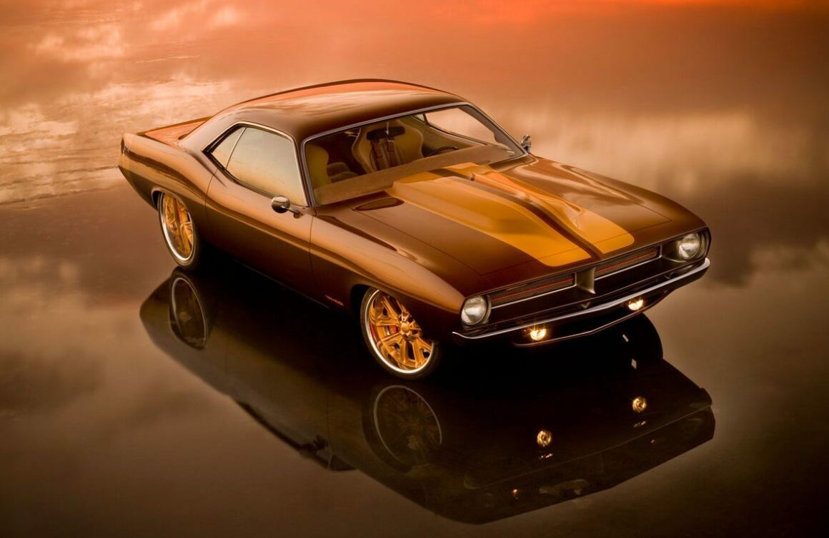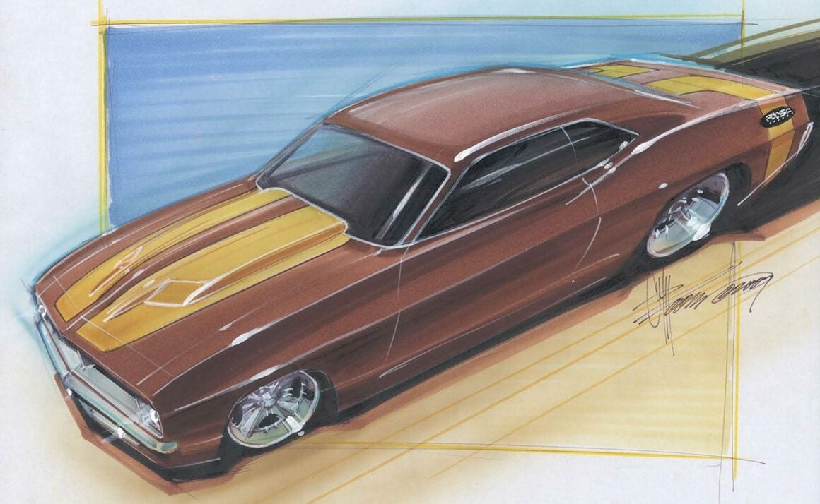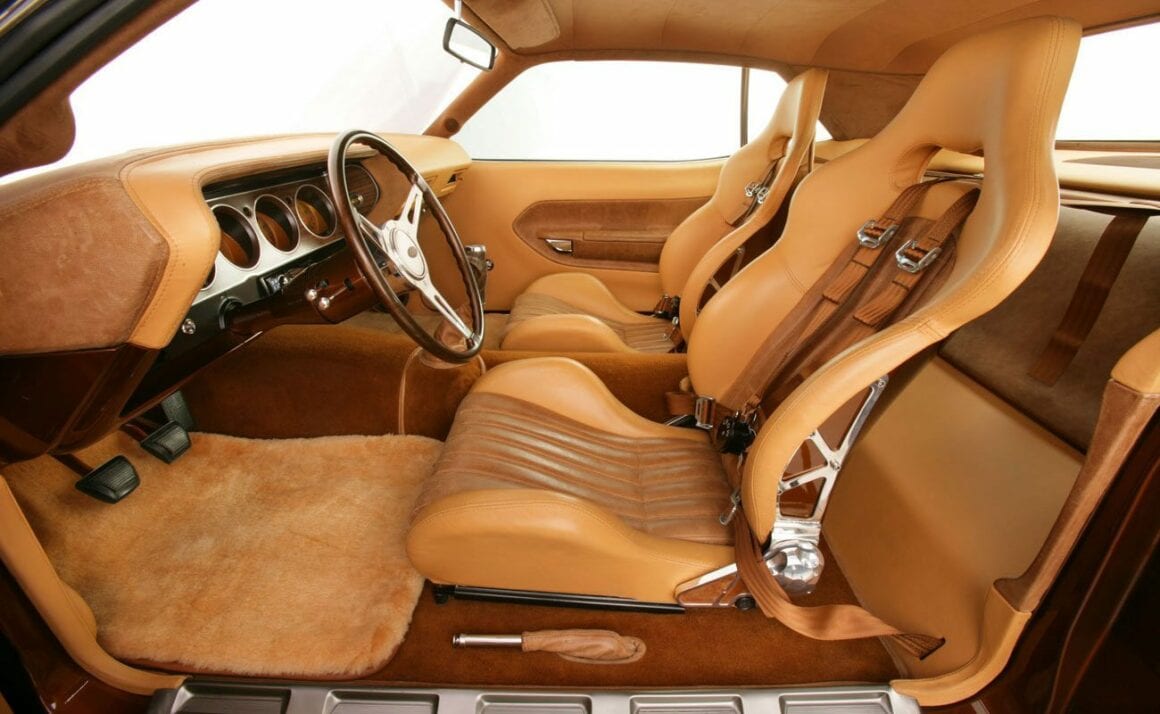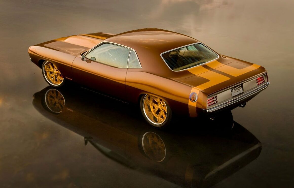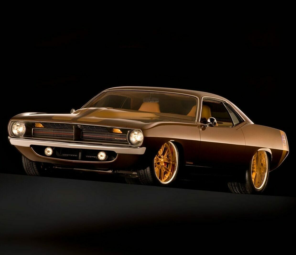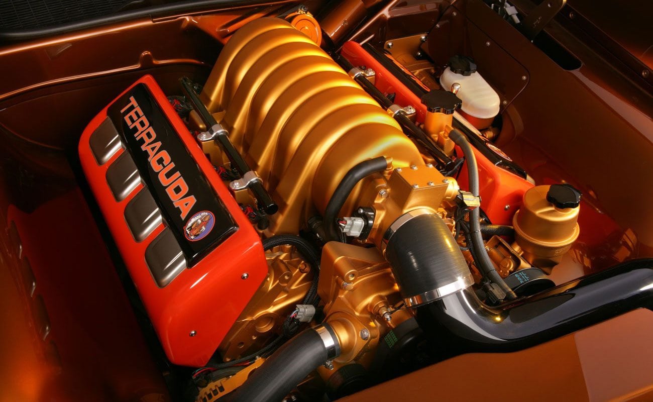Parmi les autres changements importants, citons le déplacement des roues avant de 3 pouces, l’utilisation de la suspension avant Corvette C5 et l’installation d’une partie arrière Ford de 9 pouces avec quatre bras. À l’intérieur, le véhicule a été transformé en deux places et du cuir d’usine Ferrari a été utilisé partout. Les éléments graphiques sont un hommage aux Mopar des années 1970. La couleur de base “brun racinette” et les rayures dorées sont accentuées par les roues en queue de poisson dorées. Il comprend même un logo de poisson Terracuda dans le style de l’insigne circulaire Super Bee.