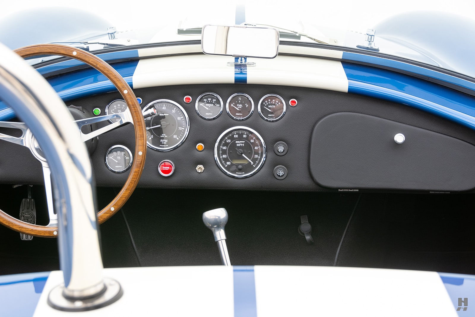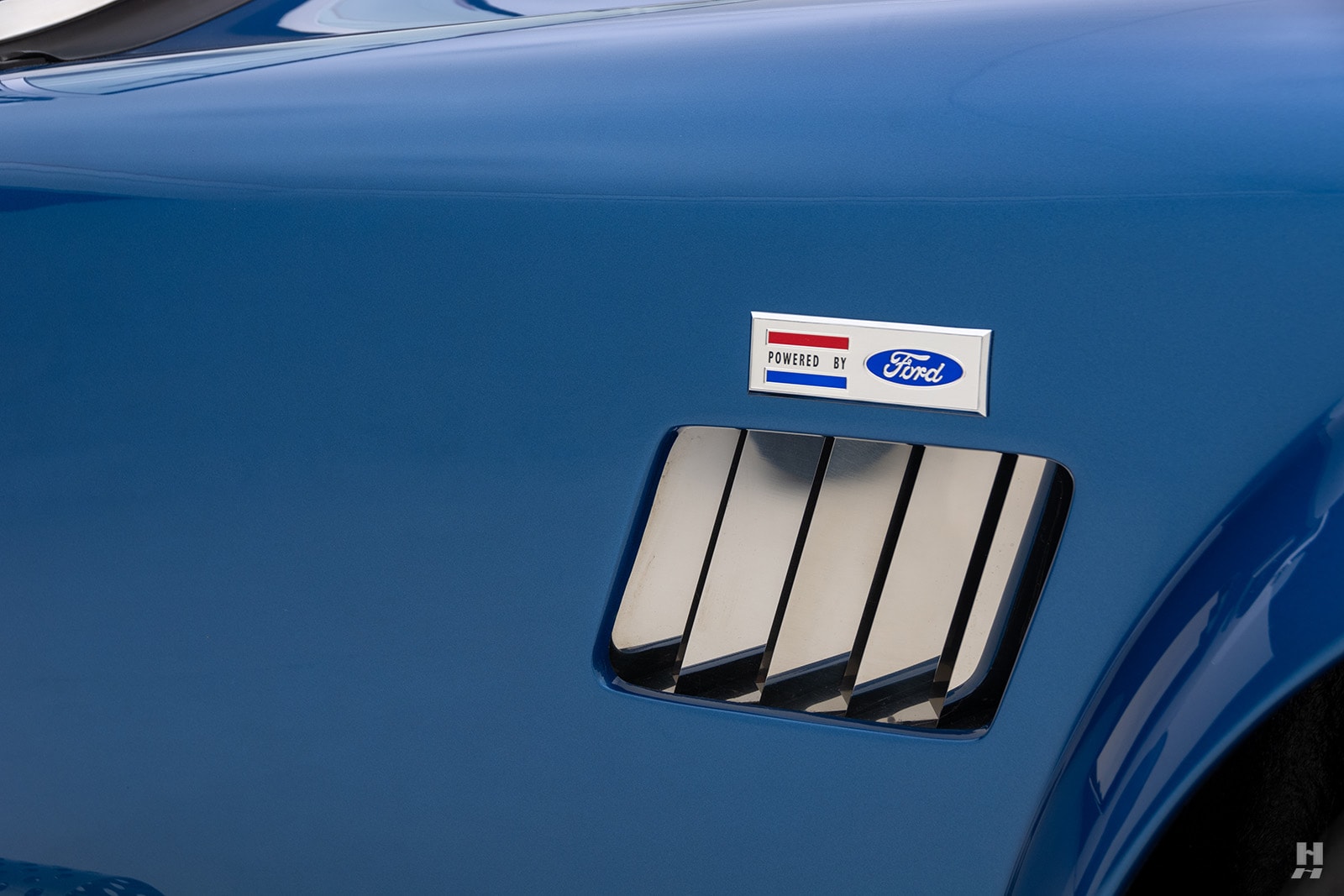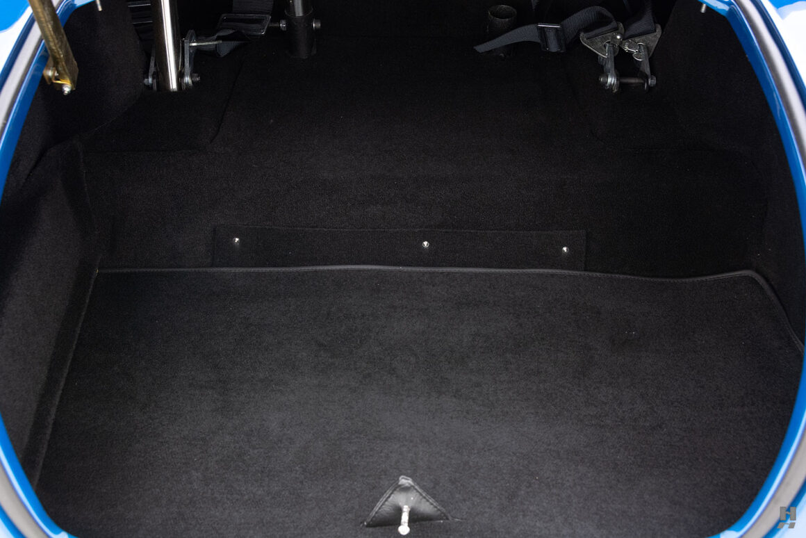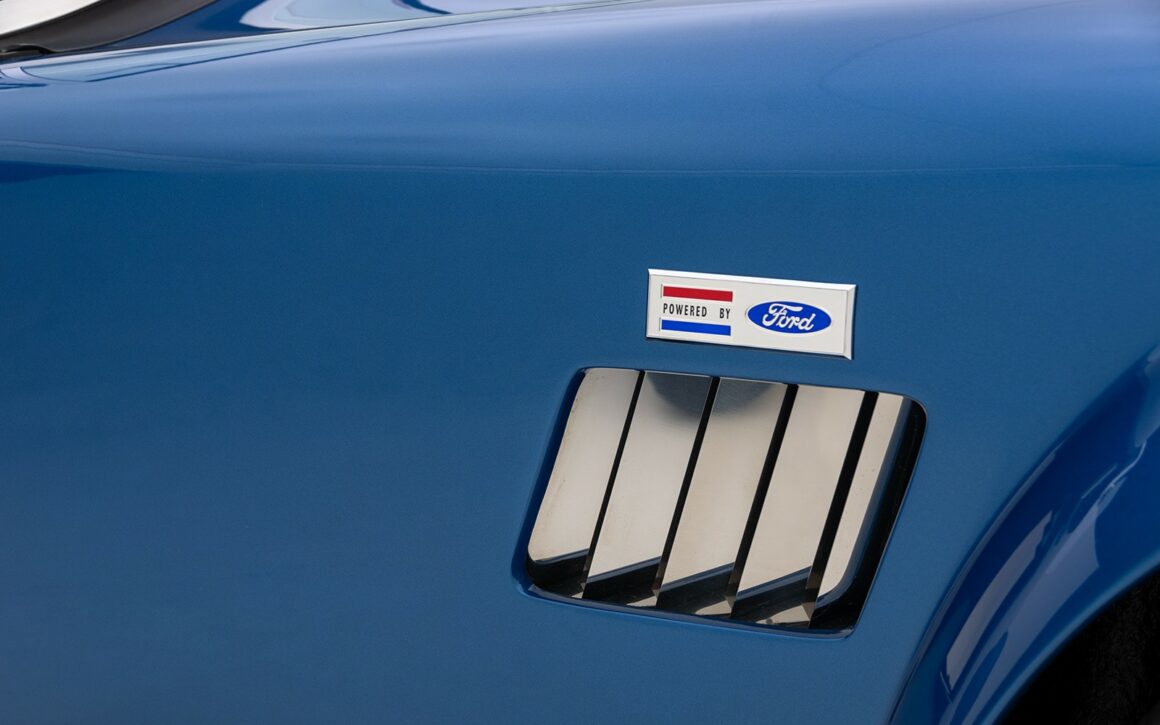 La bête est magnifiquement finie en bleu Guardsman avec des bandes racing Wimbledon White. Les options comprennent un différentiel de verrouillage de traction 3.55, un système “Big and Tall” améliorant l’espace du cockpit, la direction assistée, un film de protection-peinture intégrale, et un package “vintage”.