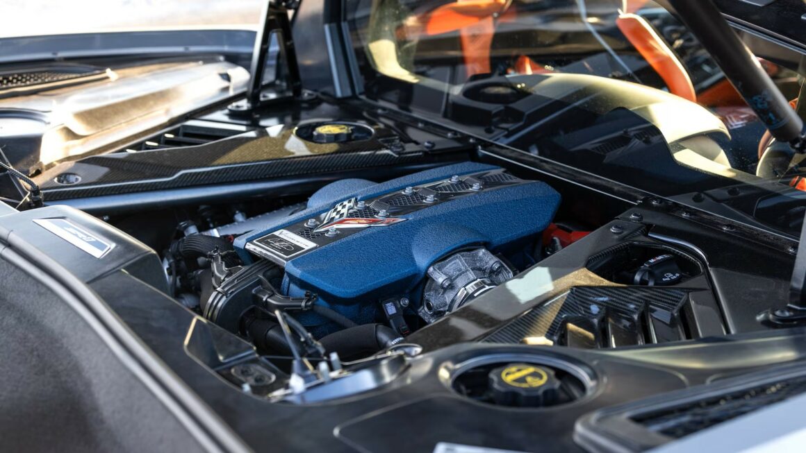 Les soupapes sont adéquatement de mêmes tailles, avec une architecture à double arbre à cames en tête et une injection directe. Le système de lubrification à carter sec est pratiquement le même, à l’exception de la lubrification turbo et de la septième étape supplémentaire de récupération d’huile de la ZR1. Mais le V8 LT7 améliore le jeu avec des pistons très bombés plutôt que simplement bombés et des bielles en titane plus courtes et redessinées, ce qui apporte un taux de compression inférieur de 9,8:1 contre 12,5:1. Son vilebrequin plat comporte plus de travail d’usinage sur ses contrepoids, et le moteur utilise arbres à cames et pièces moulées des culasses avec des chambres de combustion plus grandes et des voies d’admission et d’échappement plus courtes pour offrir un effet plus rapide au turbocompresseur.