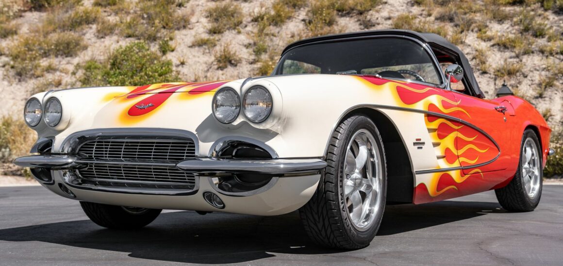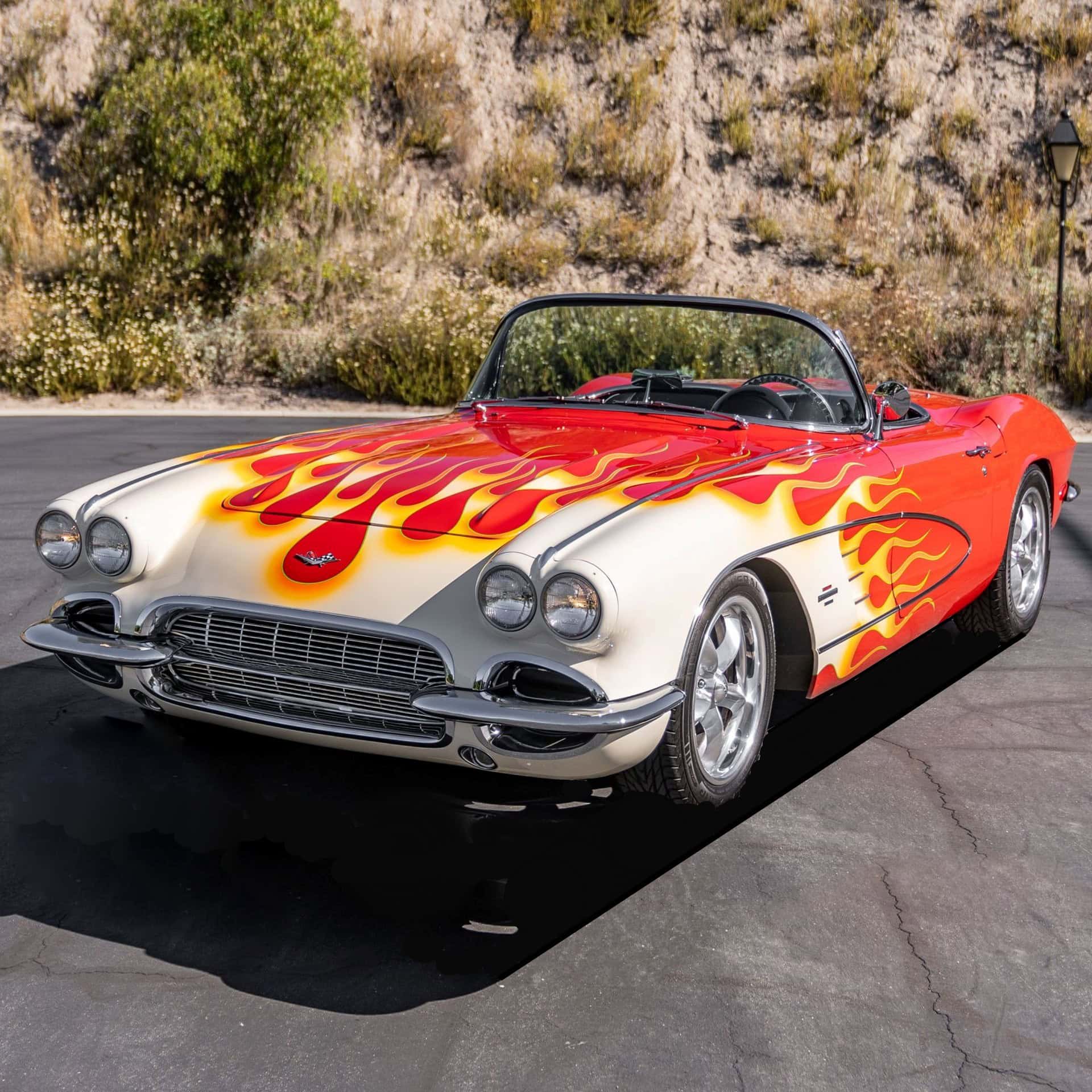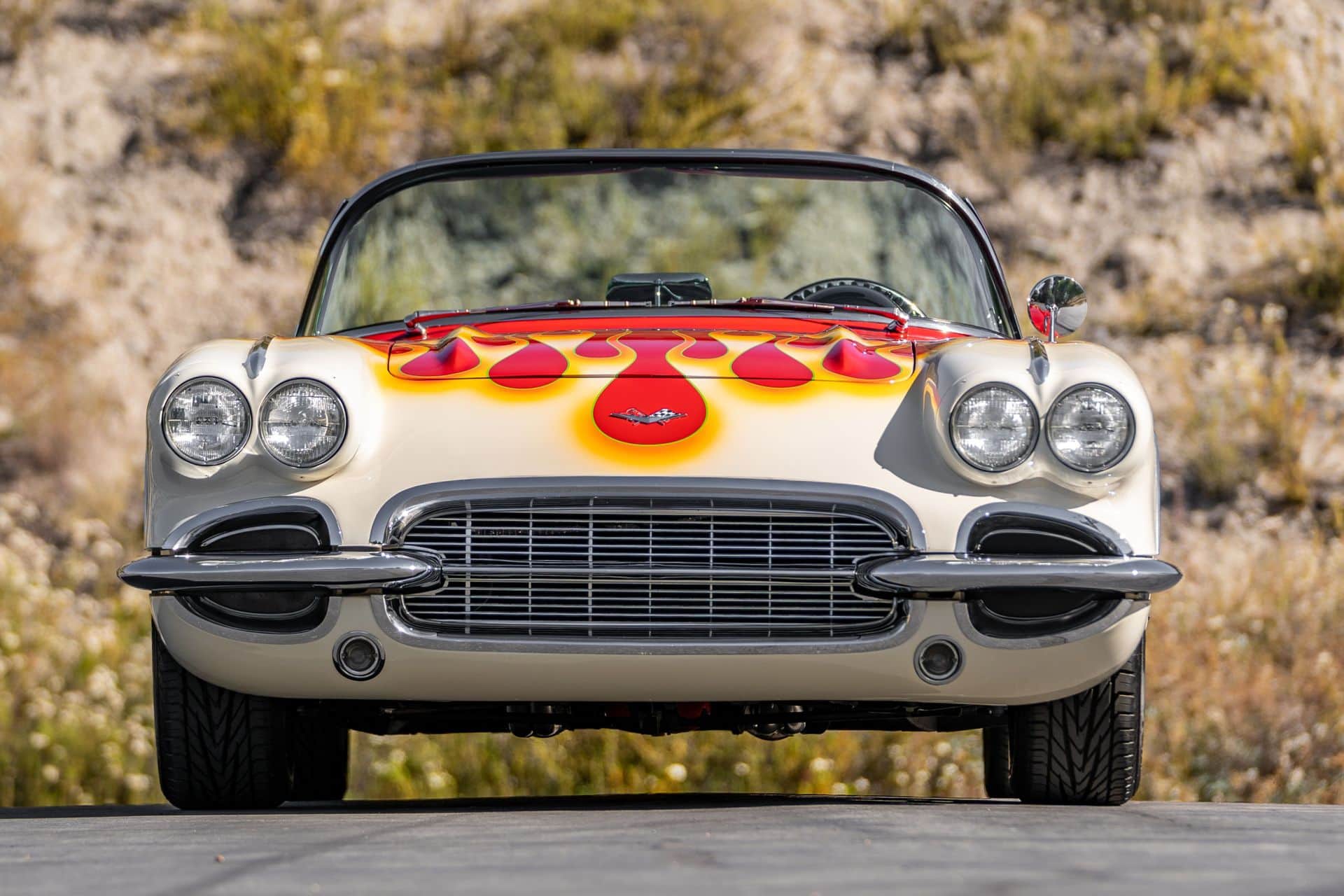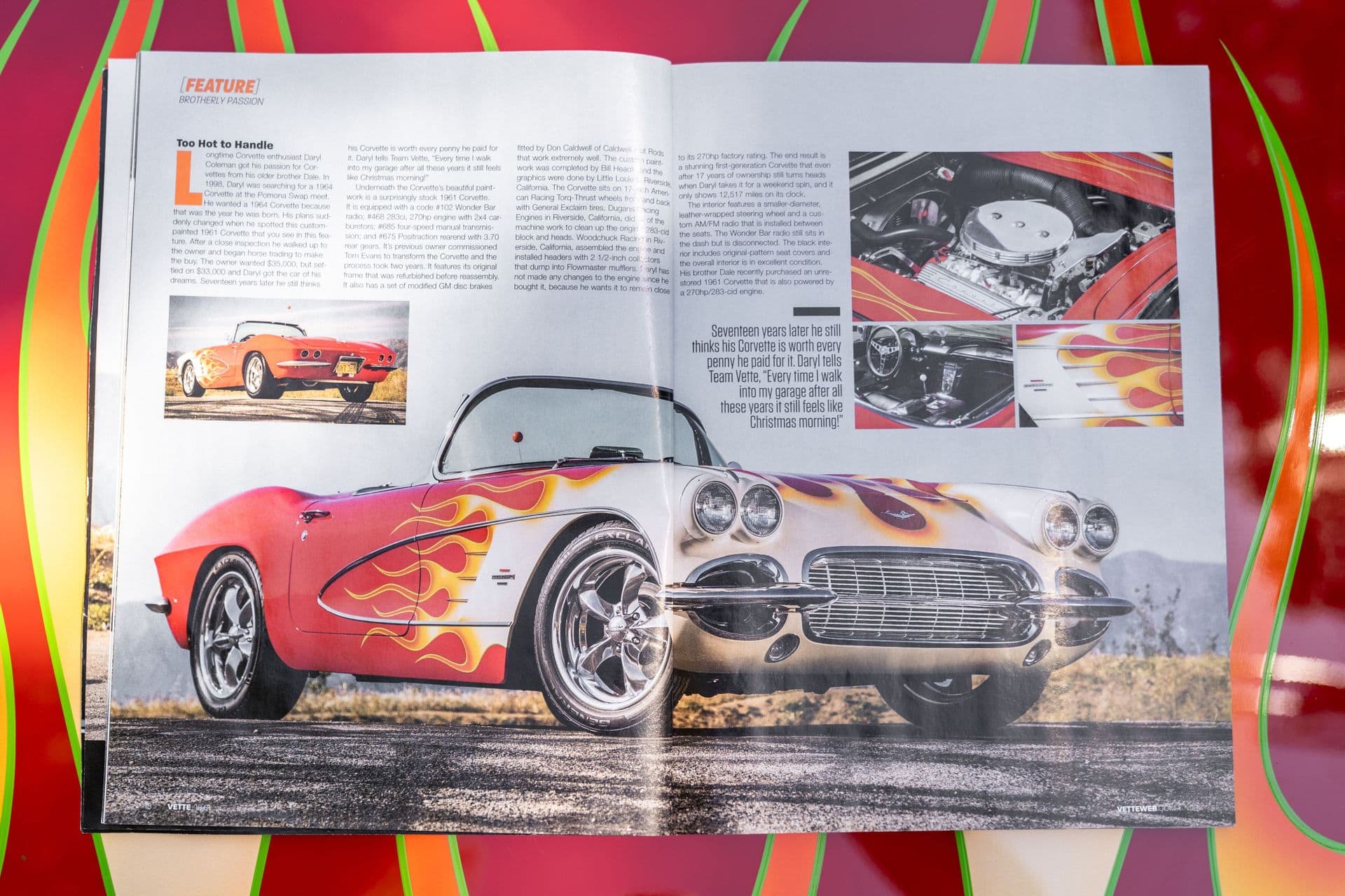 Daryl Coleman, le Cow-Boy propriétaire de la bête a donc pensé à “relooker” sa Corvette 1961 entièrement d’origine, mais il ne pouvait pas supporter l’idée de détruire et ruiner sa C1 aussi parfaite. La solution lui est venue en lisant Top Wheels qui faisait l’apologie des chromes et des flammes… Cela lui a donné l’idée de la faire peindre en Chromes&Flammes…