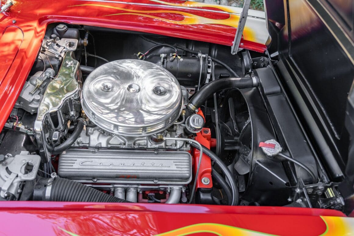 Pour faire simple, Alloway a laissé le bloc V8 bien en stock et ce fut le job d’une squaw nommée “Ensorceleuse au cœur pur qui aime chevaucher nue son étalon au clair de lune”… que de décider de la peinture chromes & flammes de la Corvette C1…Toutes les garnitures chromées sont restées d’origine, mais ont été rechromées et nettoyées par Dan’s Polishing d’Adamsville, Tennessee.