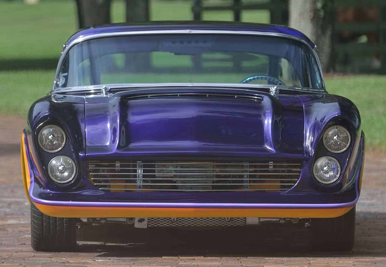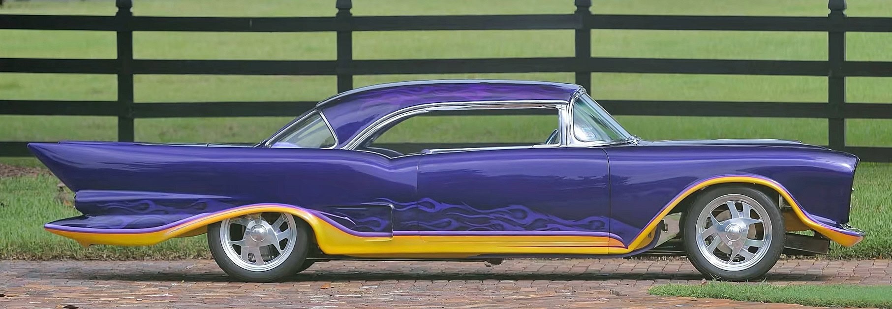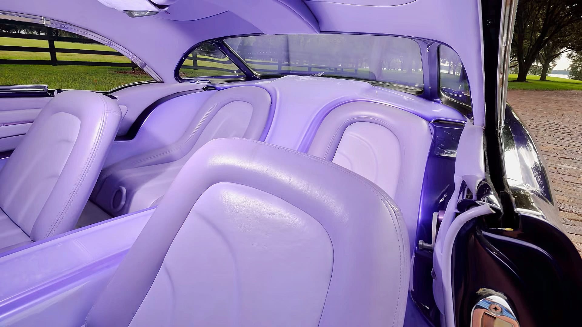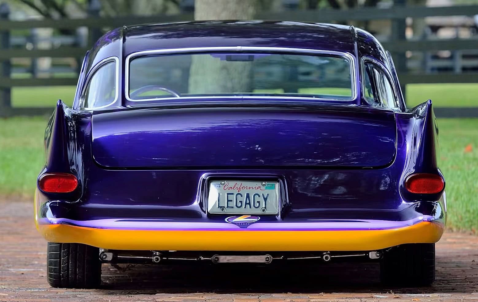 Une boîte de vitesses avec tringlerie “Hurst” actionne la transmission. À l’extérieur, je vous remarque que la ligne de toit a été abaissée de 8 cm, que les ailes avant l’ont été de 13 cm, et les arrières de 7cm. Les passages des roues arrières ont été élargis et leurs extrémités prolongées de 15 cm avec l’installation de feux (arrière) d’une Cadillac’59. Le coffre étant également été abaissé, mais de 20 cm. Les phares angulaires ont été adaptés et allongés en conséquence.
