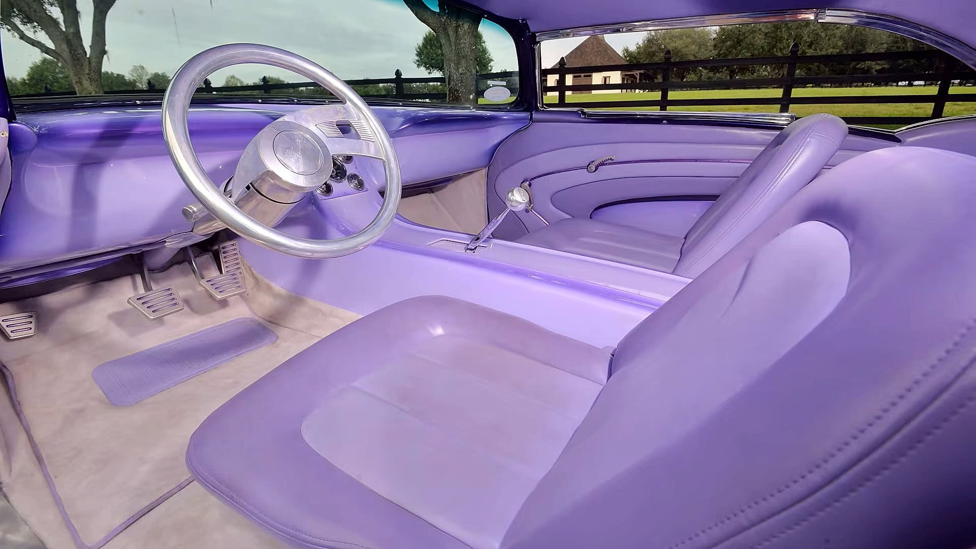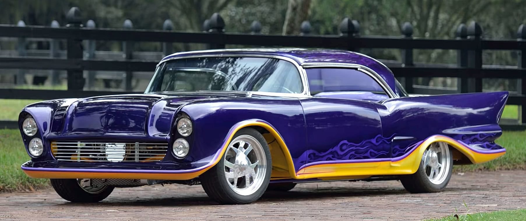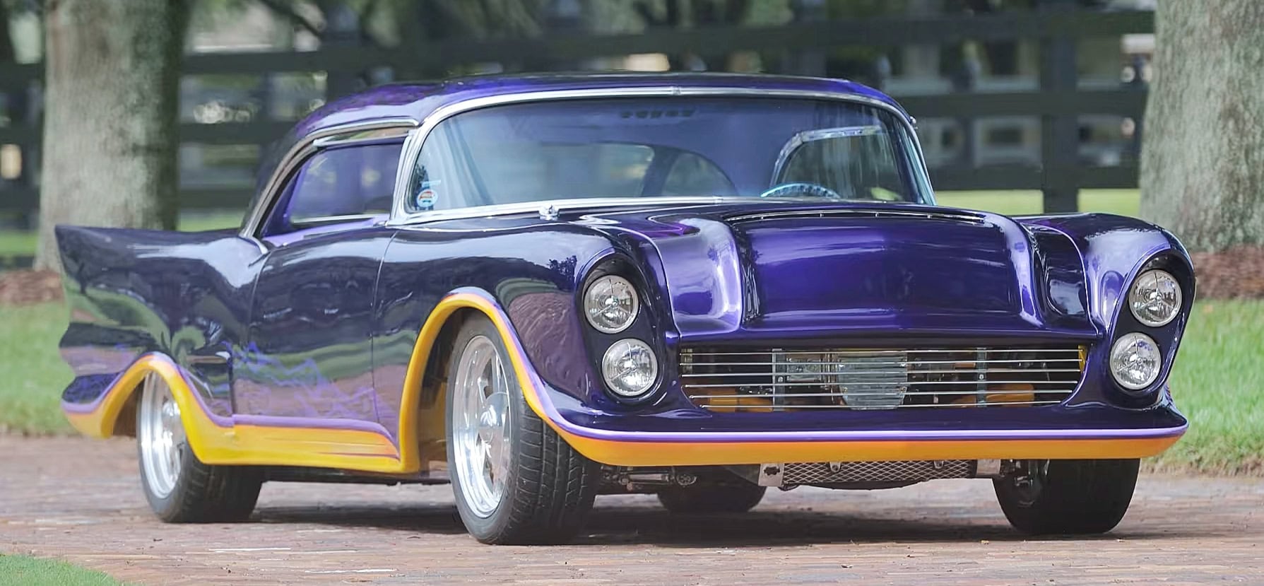 Une boîte de vitesses avec tringlerie “Hurst” actionne la transmission. À l’extérieur, je vous remarque que la ligne de toit a été abaissée de 8 cm, que les ailes avant l’ont été de 13 cm, et les arrières de 7cm. Les passages des roues arrières ont été élargis et leurs extrémités prolongées de 15 cm avec l’installation de feux (arrière) d’une Cadillac’59. Le coffre étant également été abaissé, mais de 20 cm. Les phares angulaires ont été adaptés et allongés en conséquence.