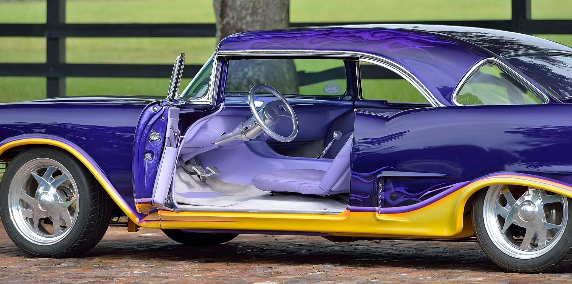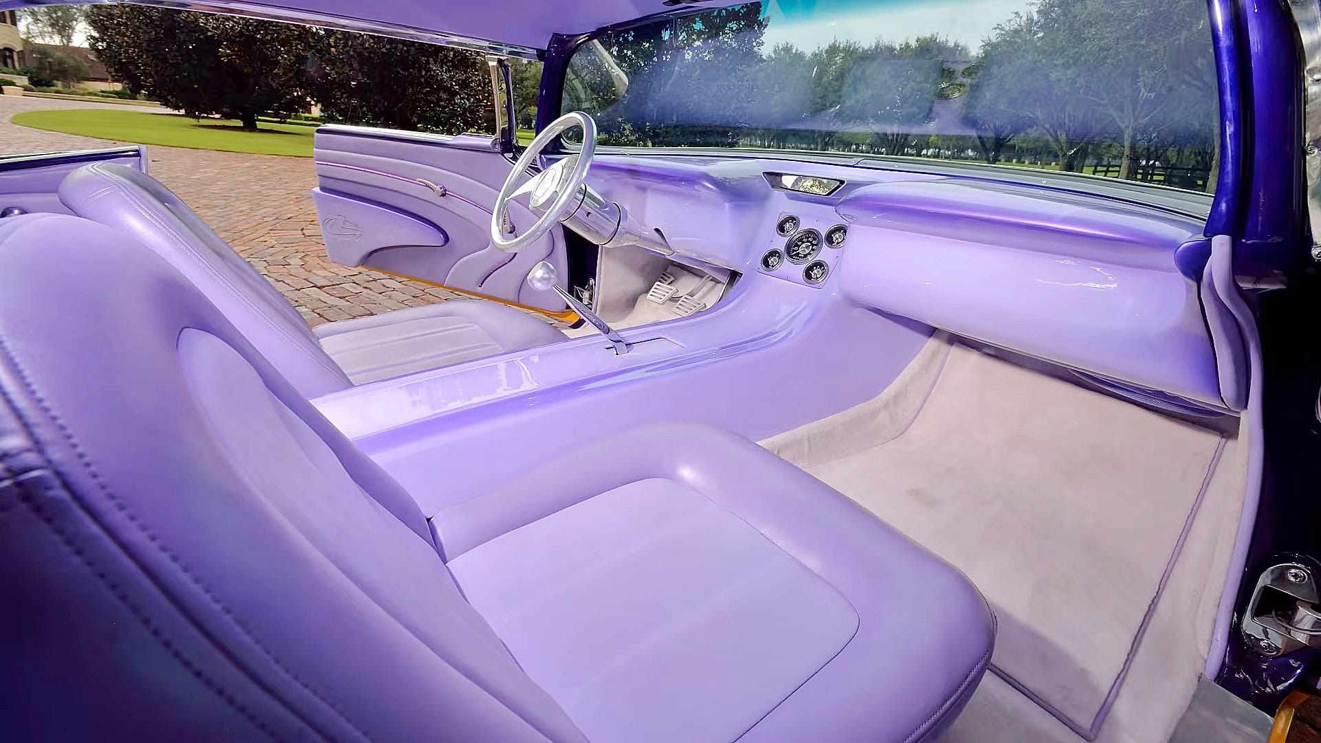 Est ainsi visé l’intérieur personnalisé bleu poudré “Pompadour”… La modification la plus moderne étant un ensemble de jantes “Colorado Custom” montés avec des pneus BF Goodrich Radial T/A. Même si la veste du club automobile n’était pas incluse dans la vente de la “Legagy” pour un million de $ (via Mecum auction), mais proposée “à part” pour 50.000$, avec deux malles de pièces et documents de chez Georges Barris mélés à ceux de Jim Consumano…