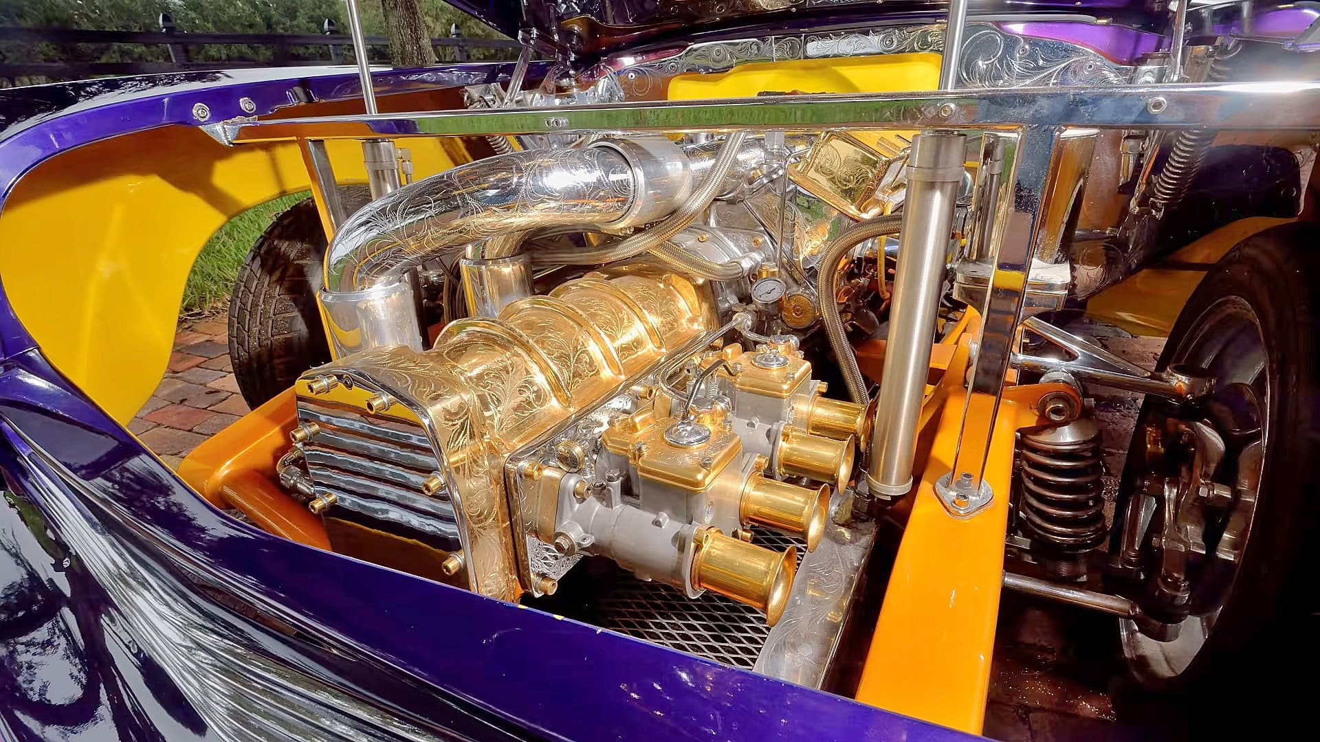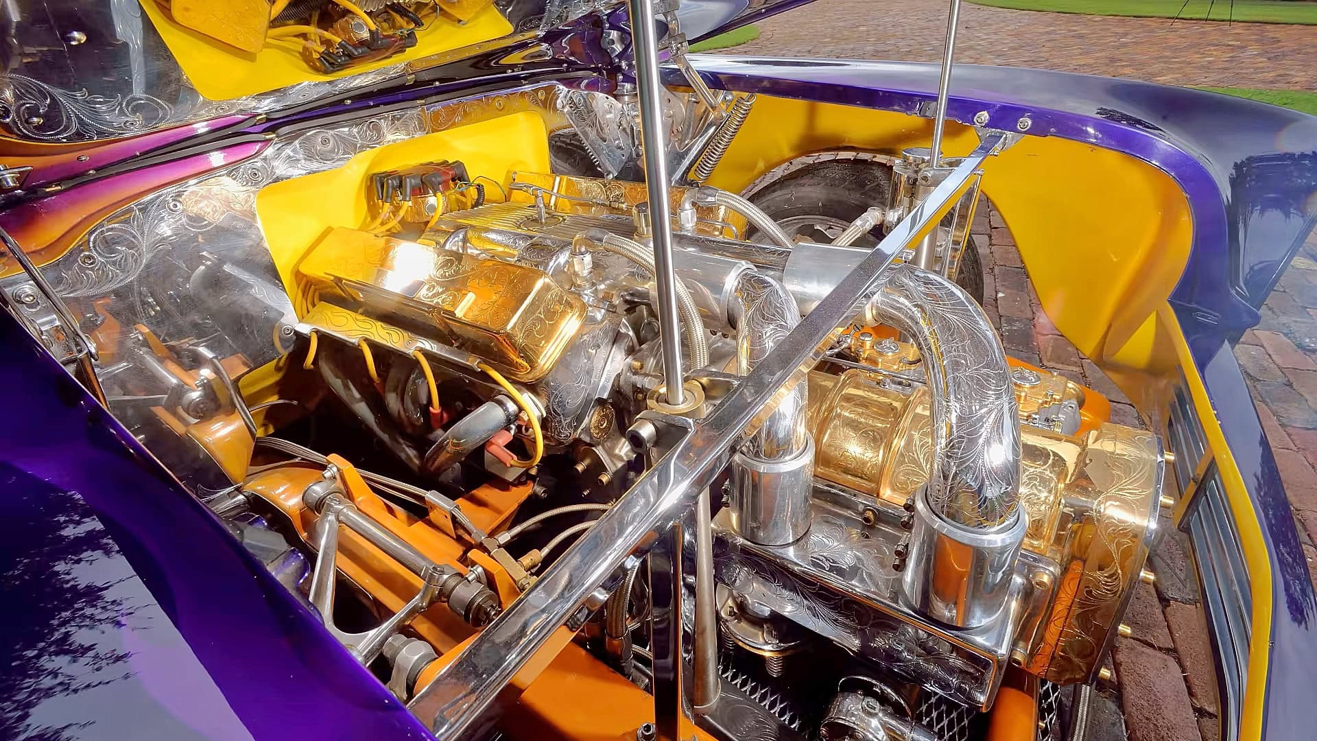 Ce genre de création plus qu’excentrique qu’excentrée, débute invariablement par un moteur plus surpuissant que nécessaire, en l’occurrence et en ce cas, un V8 ex-Corvette 327 CI (5,4 L) de 1962, donc également venant des Sixties, richement détaillé et équipé en son cas (désespéré) d’un compresseur 6-71 dit “volumétrique”. Ce bloc moteur arbore des carburateurs “à tirage latéral” d’époque, des dorures et des chromes, ainsi que des gravures réalisées à la main.