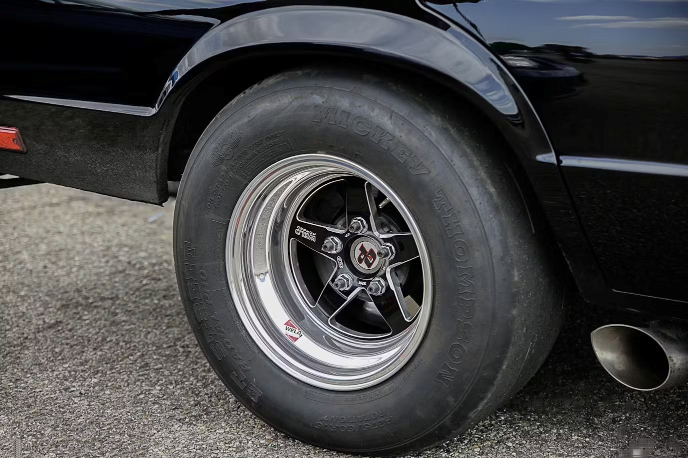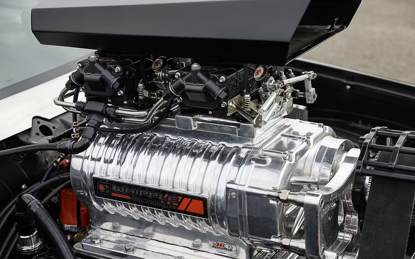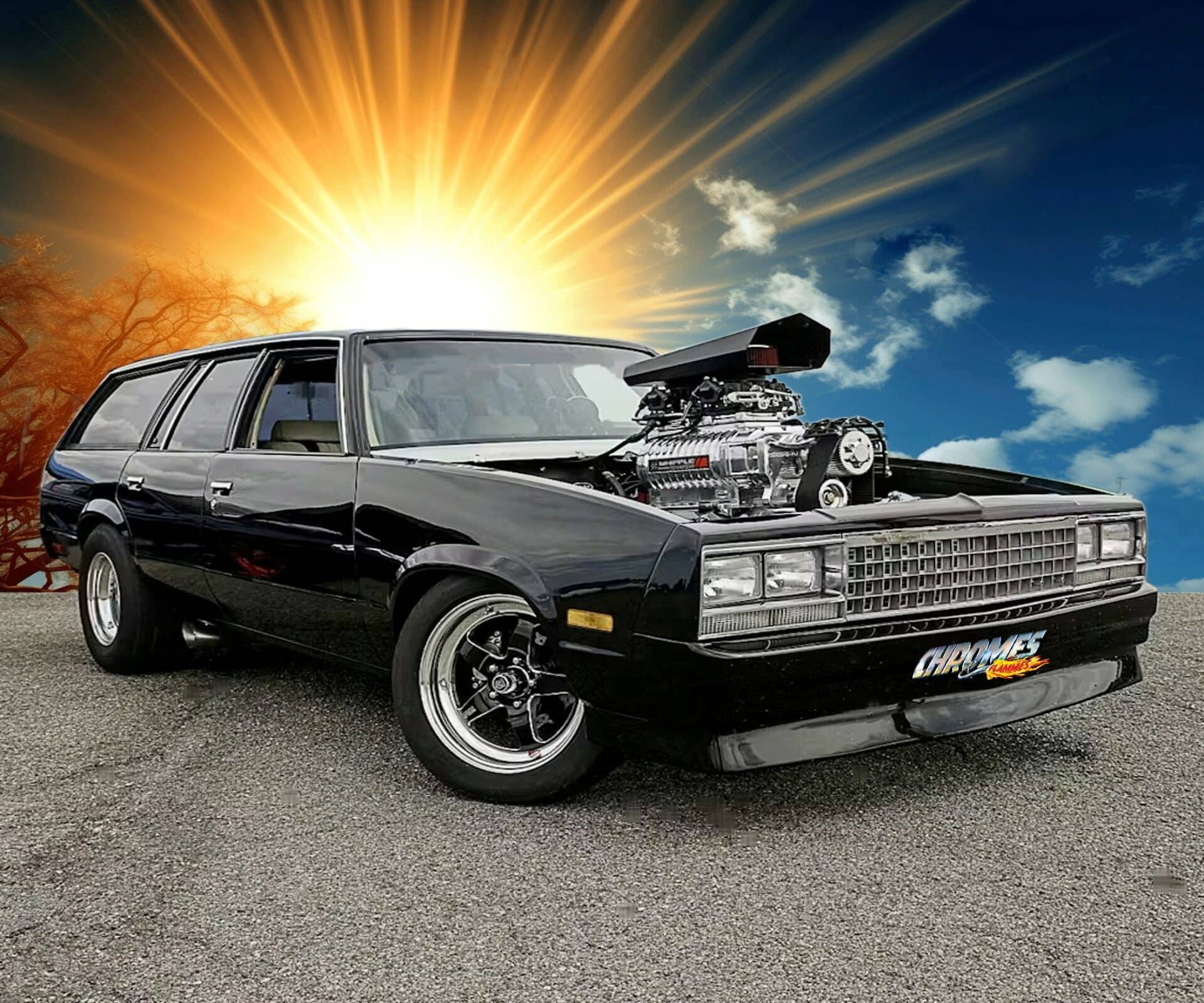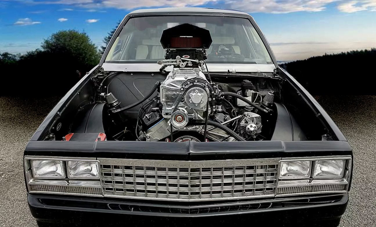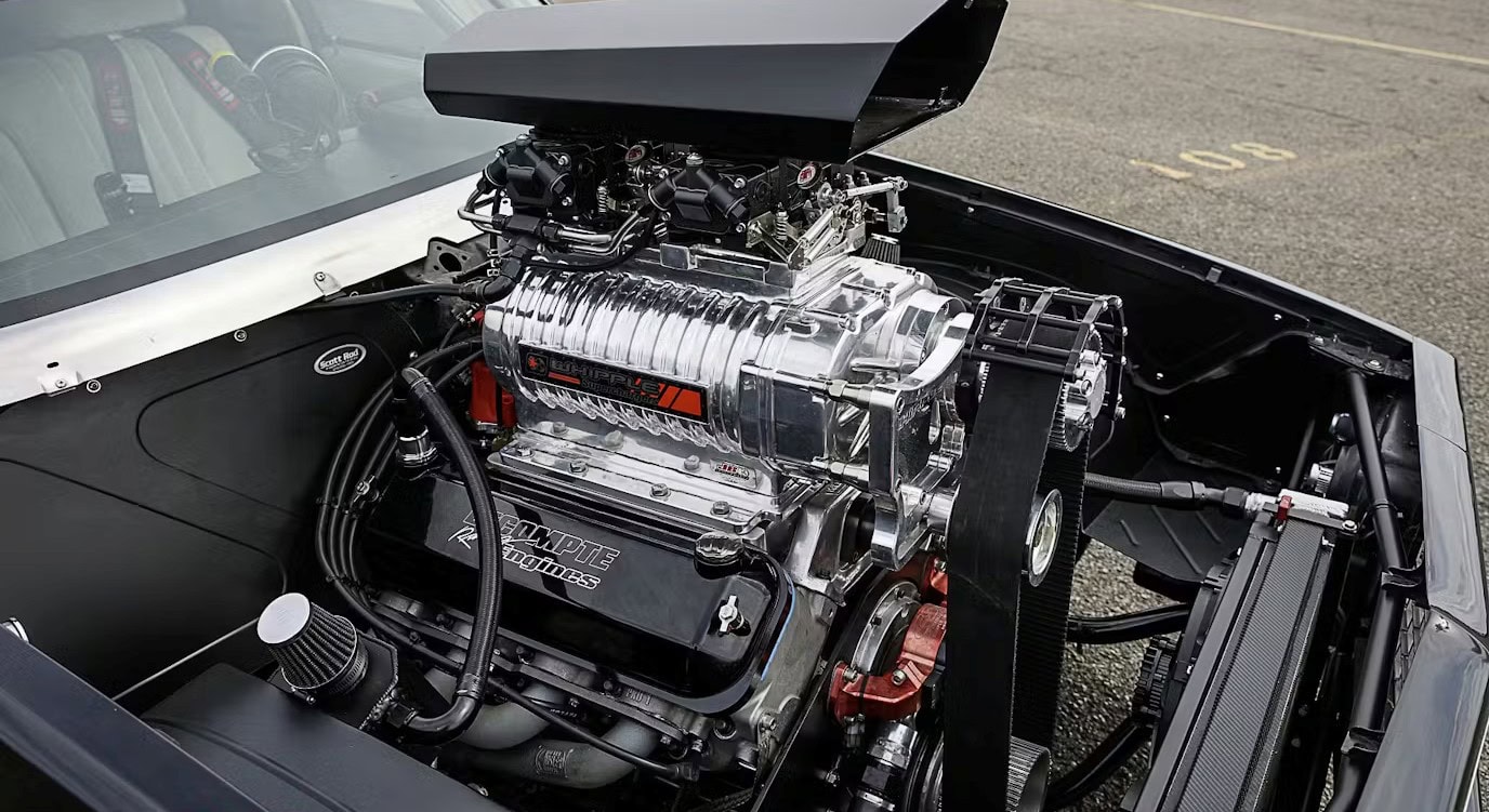 Il devait conserver son moteur V8 à vie. Travis fut donc ravi d’honorer ce pacte avec le gros V8 de 8,4 litres (555ci). Ce moteur est basé sur un bloc Dart et équipé de deux culasses Racing. La suralimentation est assurée par un imposant compresseur Whipple de 8,3 litres. L’air et le carburant E85 sont mélangés par deux carburateurs ATM à faible pression de suralimentation. Cette configuration a déjà permis à la Malibu de descendre sous les neuf secondes au quart de mile. Travis est convaincu qu’elle passera facilement sous les huit secondes une fois la pression augmentée. À l’avant, la voiture est équipée d’un berceau moteur “417 Motorsports” et d’amortisseurs “Viking”.