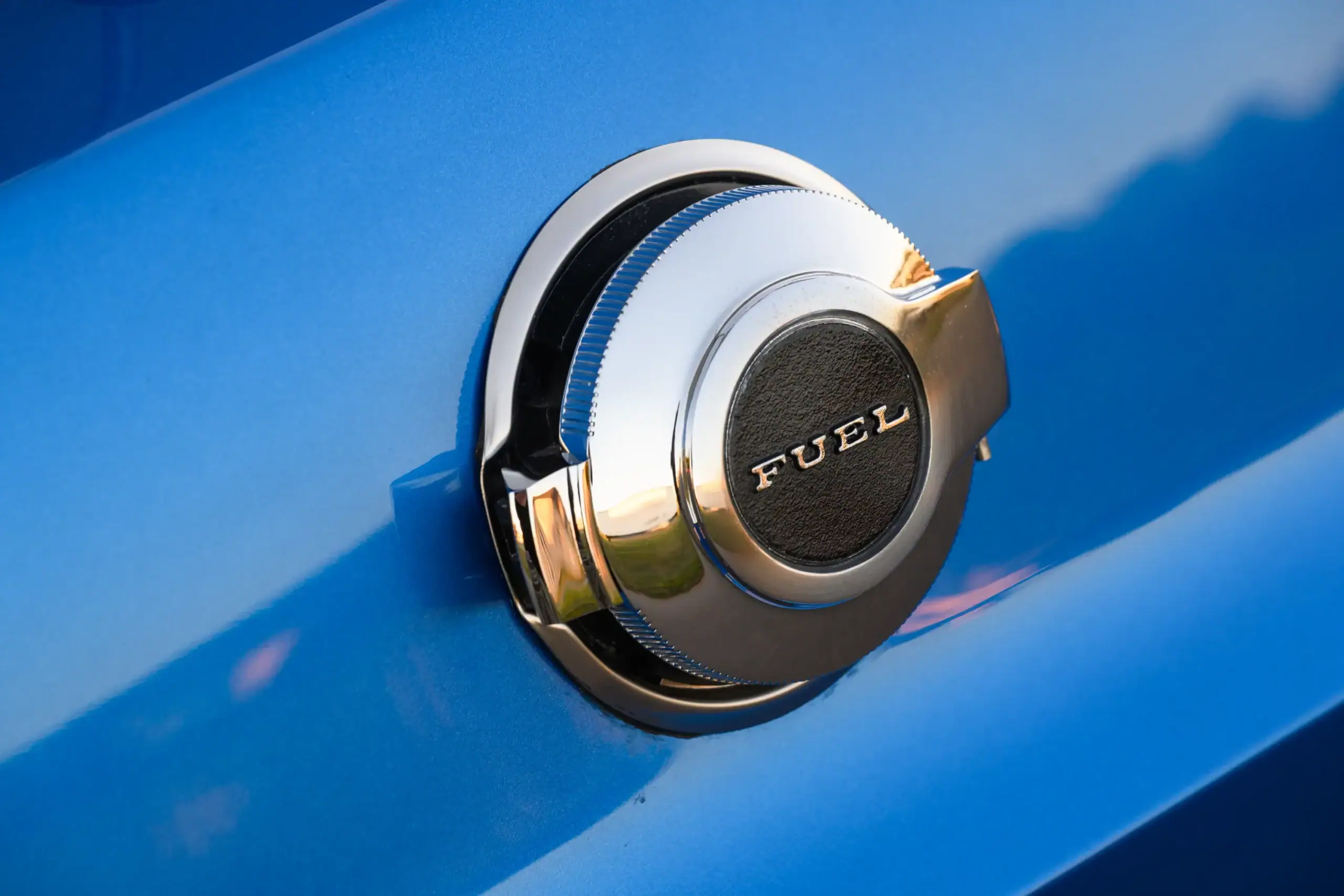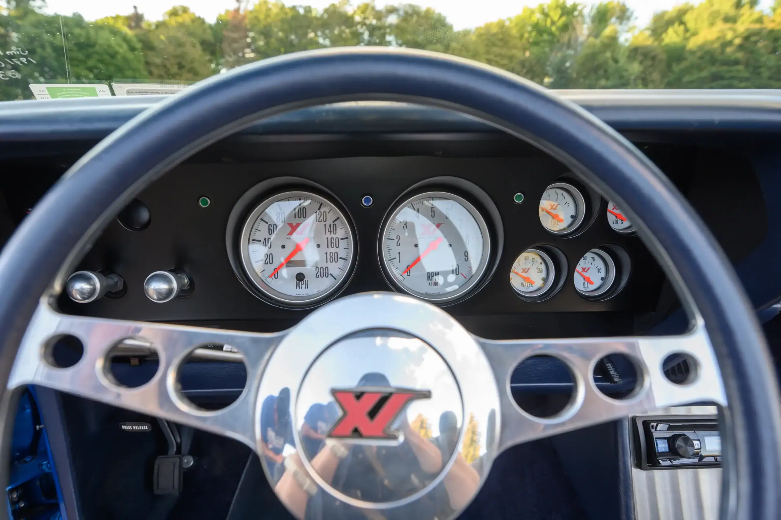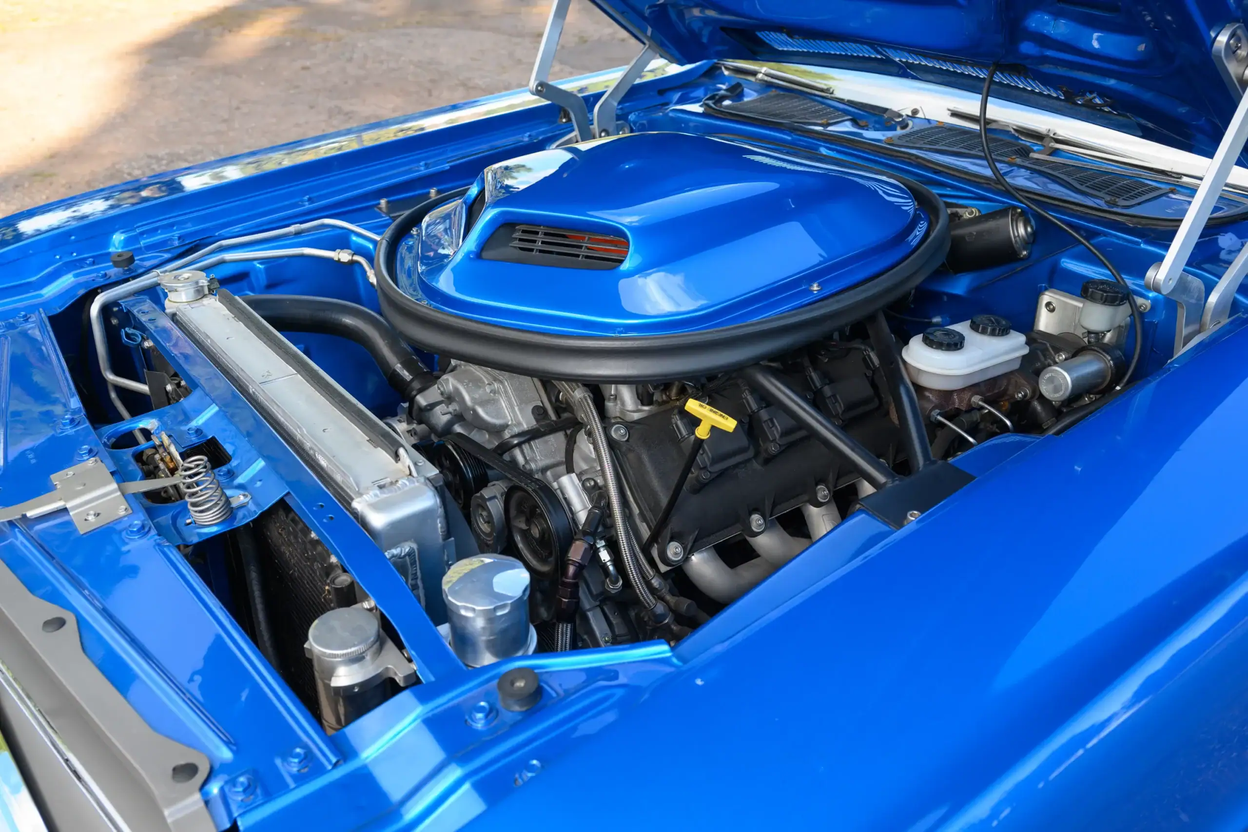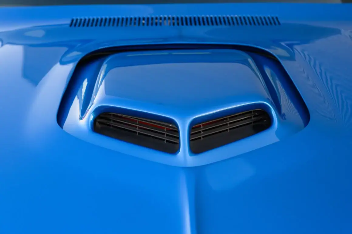 L’air entrait à travers une écope à air de la taille d’une valise moulée dans le capot à charnière en fibre de verre noir mat. Un échappement à double sortie et à faible restriction allait jusqu’à l’emplacement du silencieux d’origine, puis avec une direction inversé pour sortir dans les sorties “mégaphones” chromées à l’avant des roues arrière. Les options comprenaient une transmission automatique à quatre vitesses TorqueFlite à poignée pistolet ou Hurst.