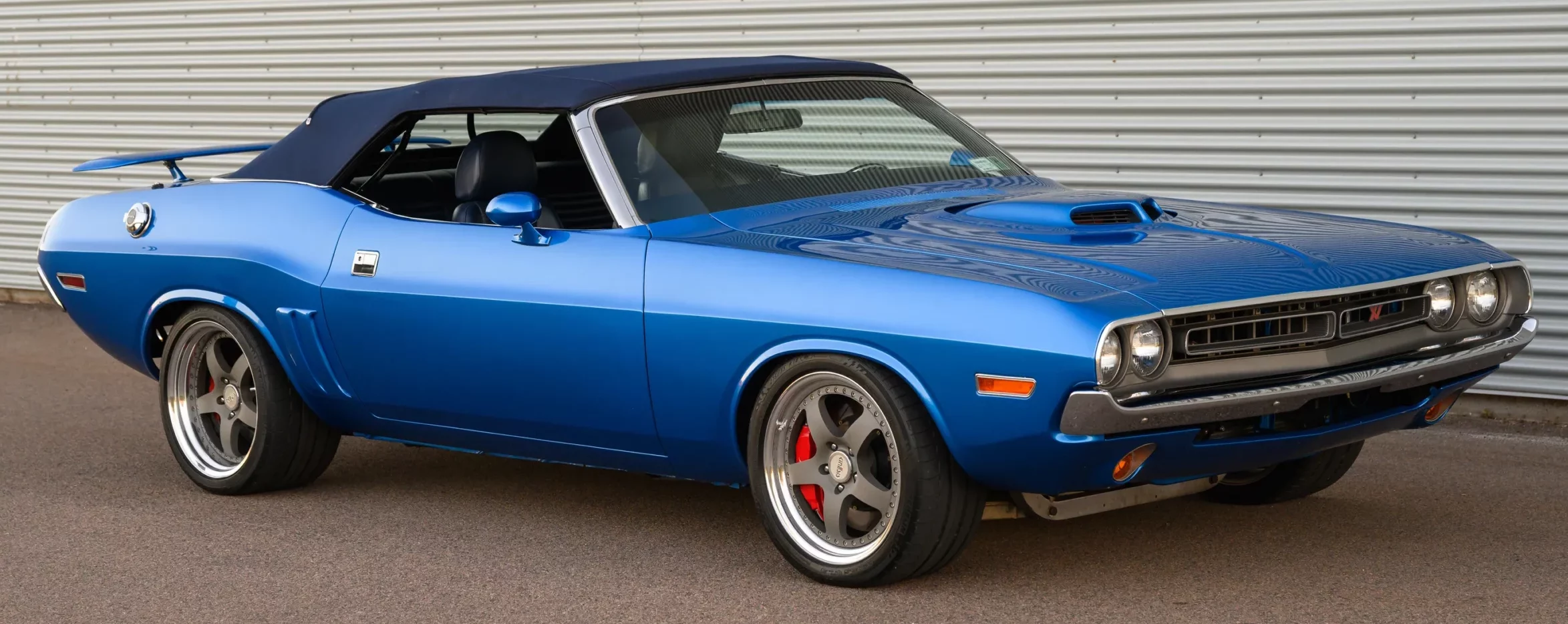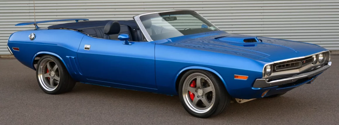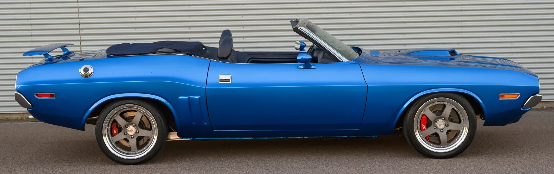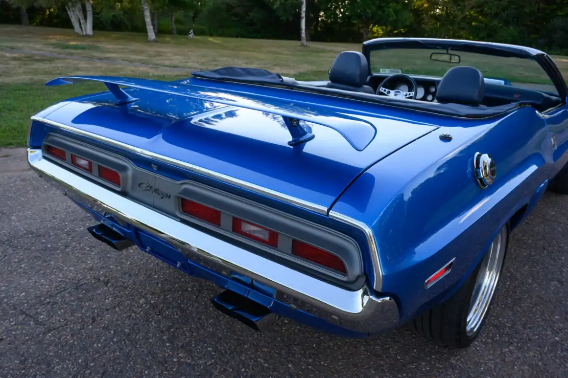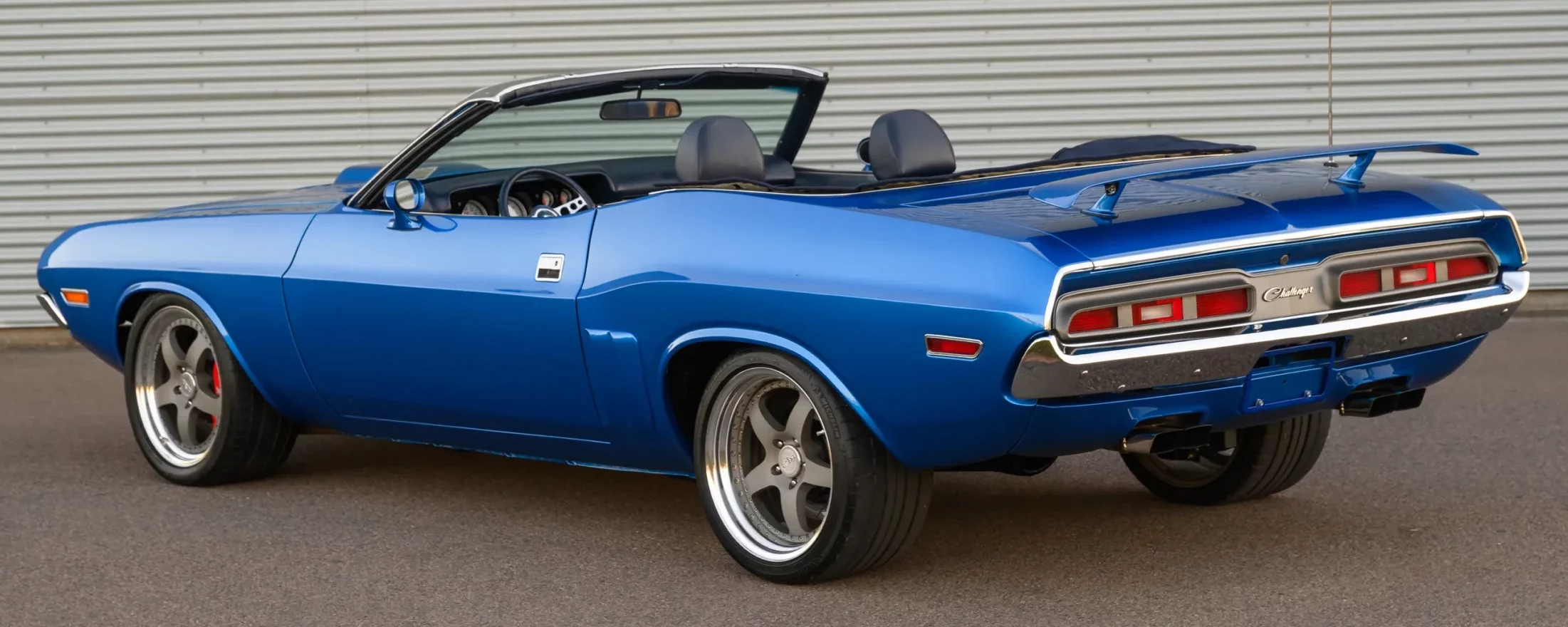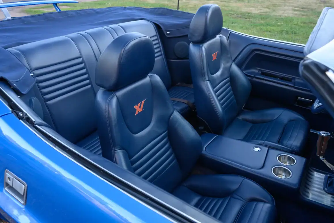 Notez que l’intérieur a été entièrement remanié, d’une finition bleue scintillante qui devient irisée au soleil. Véritable supercar moderne construite à la main et vêtue de tôles Challenger de 1971, ce cabriolet est au sommet du monde du restomod car doté d’un savoir-faire de classe mondiale, d’une attention particulière aux détails et d’une ingénierie sans limites.
