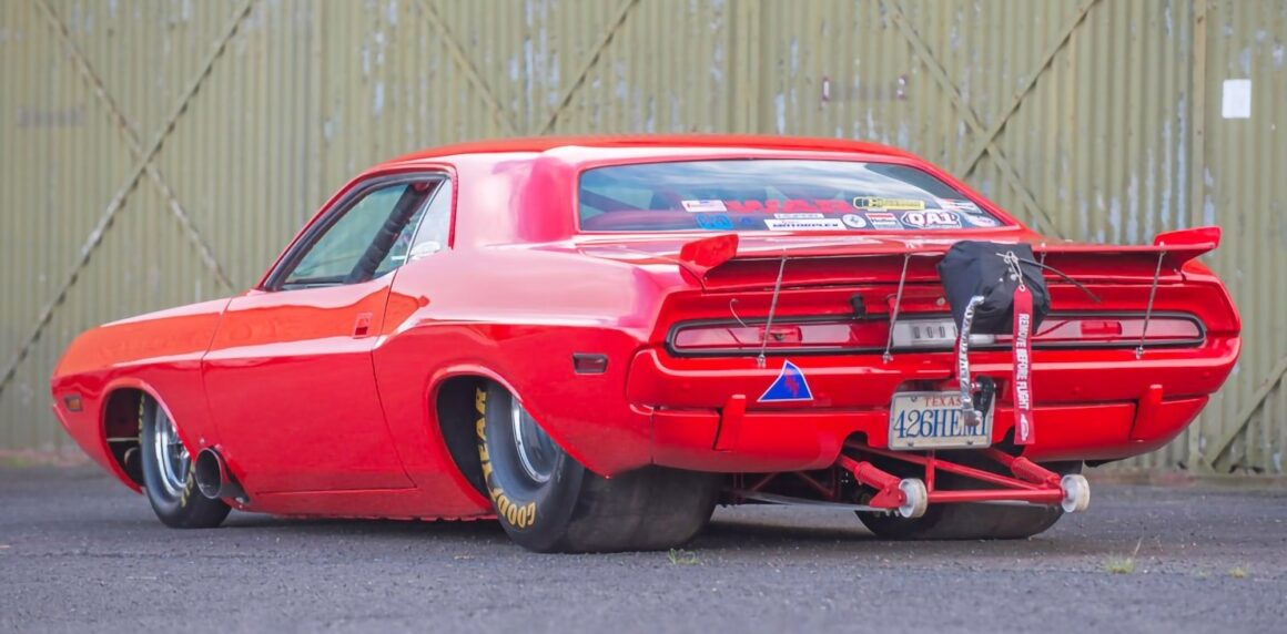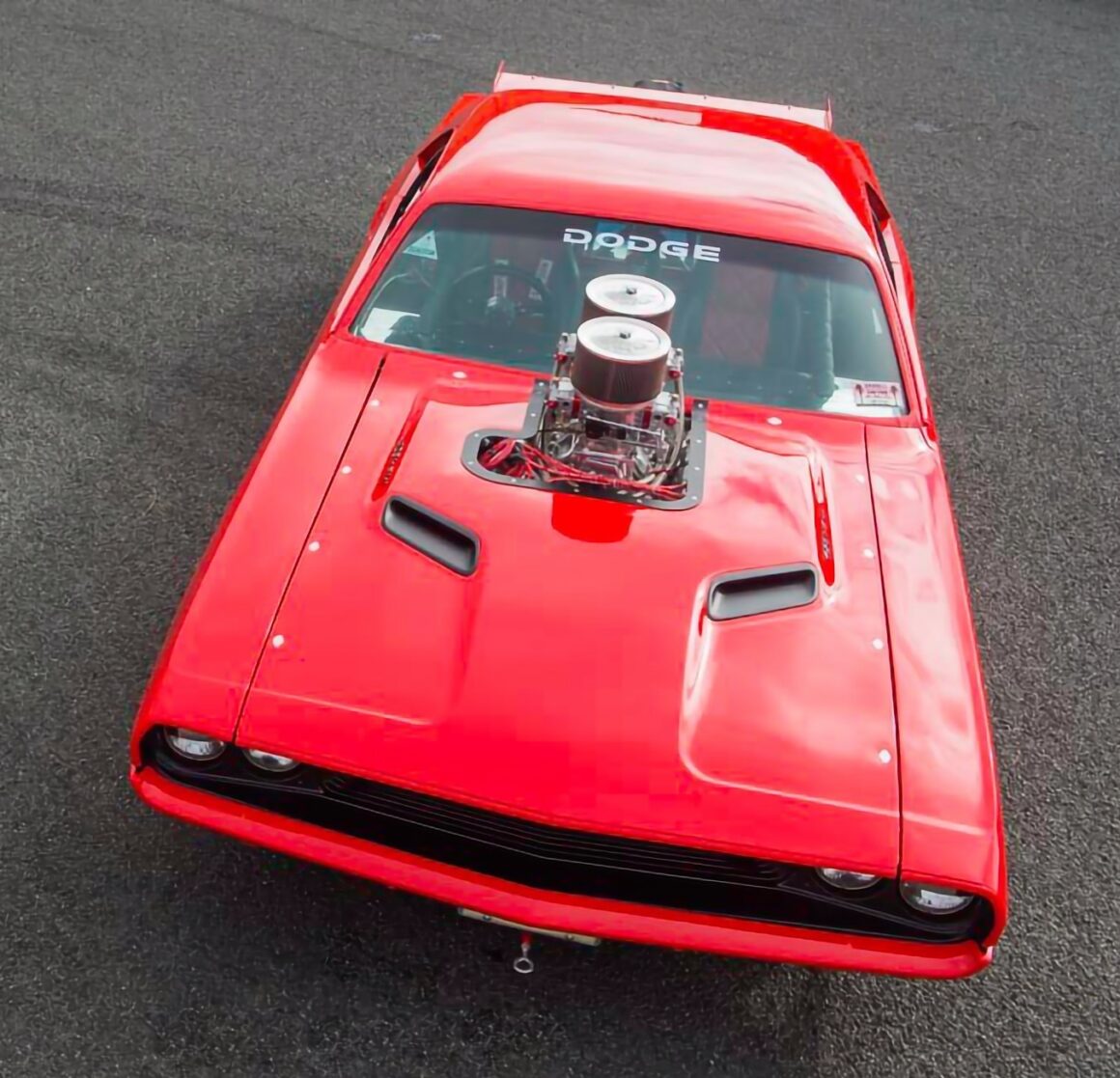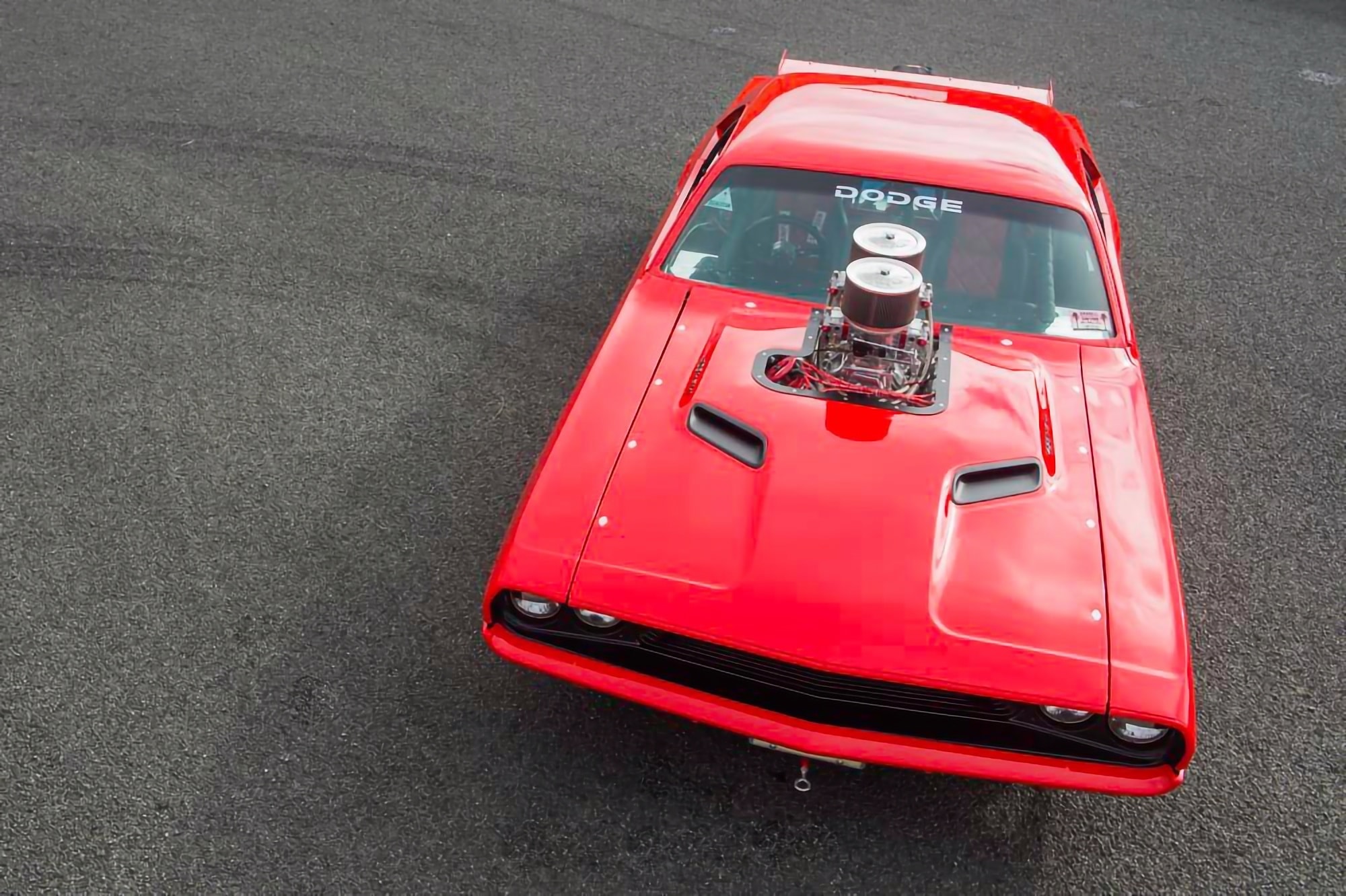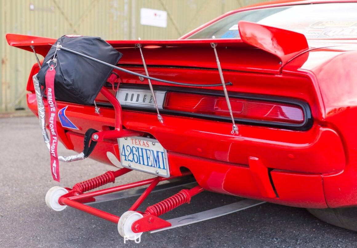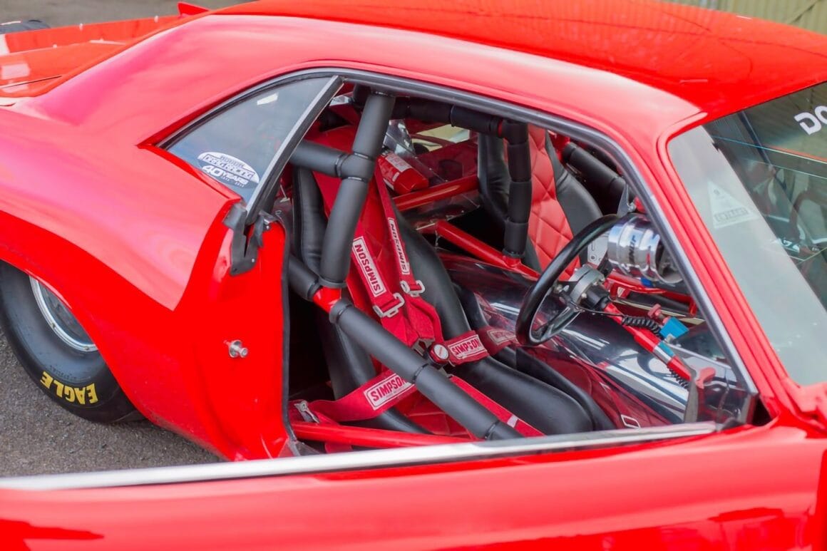 “Nous ne voulions pas trop enlever son look d’origine, nous l’avons donc personnalisée en faisant certaines choses à notre façon sans gâcher l’âme de la voiture. À l’origine, la Challenger était entièrement peinte dans une nuance de rouge plus foncé. Nous avons laissé le châssis dans cette couleur. Mais nous avons choisi un nouveau rouge plus vif pour la carrosserie. Nous avons mis des jantes et des pneus différents à l’avant, des slicks à l’arrière. Nous avons retiré l’écope du capot, construit un nouvel aileron arrière en aluminium, installé une goulotte Simpson à 180 mph, regarni les sièges, ajouté de la moquette et remplacé les feux avant/arrière”...