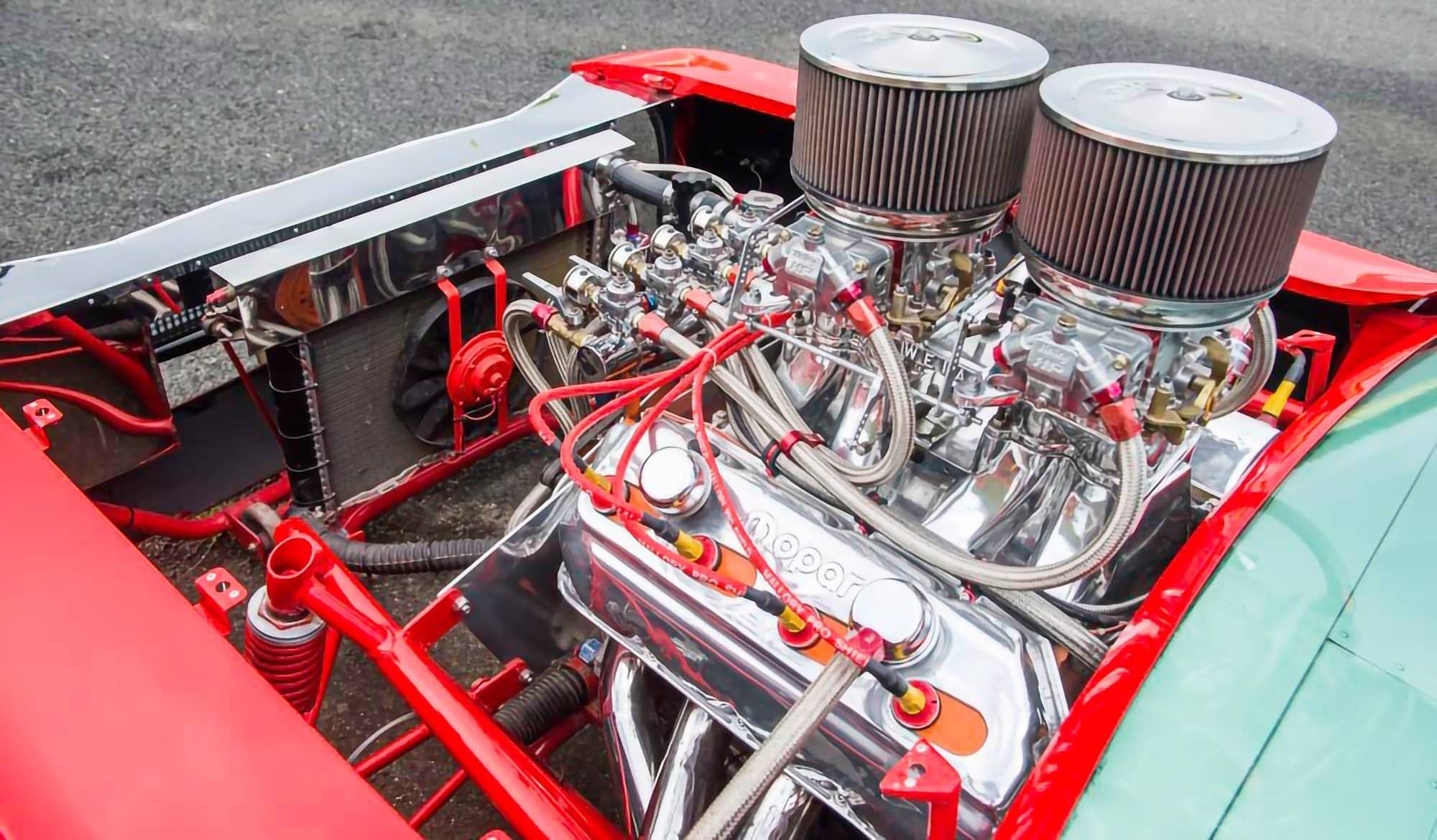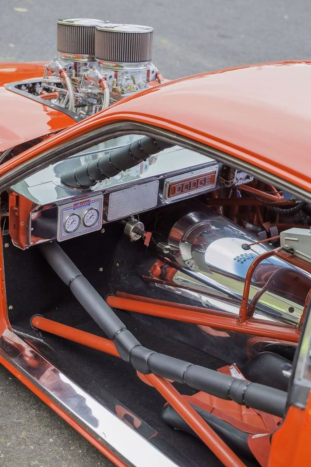 Carrosserie et châssis : Dodge Challenger 1970 avec un kit complet de châssis Chris Alston prolink. Disques Wilwood à l’avant et à l’arrière. Pont Dana ’60 rétréci avec un centre de différentiel de 5,86 :1. Suspension avant avec jambes de force JC et une bobine Koni. Jantes15×14 Weld Prostars à l’arrière, 15×3 1/2 Aluma Star à l’avant. Pneus Goodyear. L’intérieur est garni d’acier inoxydable 316 et équipé d’un tachymètre mécanique Jones, de compteurs Autometer et de sièges SAAS. Le moteur est le chef-d’oeuvre de Don Carlton, c’est un Pro Stock usine 426 Chrysler avec des voies d’huile polies et des graisseurs latéraux Kellogg. Les pistons sont des Arias 13,5 :1 (rapport final de 15,3 :1), les segments sont en molybdène Hastings, les tiges de culbuteurs sont en aluminium Bill Millar avec boulons BME. La came à rouleaux Reed Pro Stock offre une levée de 0,855, une durée de 337 degrés et est reliée à un entraînement avec calage à double soupapes de renvoi Pete Jackson. Les roulements sont des Cleveite Nascar. La pompe et le carter d’huile sont de Keith Black. Filtrage en queue de colleté Oberg pour que tout se passe bien. Têtes Pro Stock préparées par Don Carlton équipées de valves Manley en acier inox. Culbuteurs Chrysler. Ressorts de soupape triples Manley. Tiges de poussée Smith Brothers. Couvercles de soupapes en aluminium Chrysler Pro Stock. Collecteur d’admission Weiland prostock équipé de 2 carbus quadruple corps Holley 1150 dominator. La voiture ne fonctionne qu’avec du carburant de course Sunoco 116 envoyé au bloc via 2 pompes Holley GPH avec des lignes tressées earl. Les collecteurs sont en acier inoxydable en 2,5 et 6 pouces. Magnéto Super Mallory. Transmission 727 Torque Flight à embrayage avec plateau Hays. Levier de vitesses B&M pro Shifter. Volant moteur Pro Stock…