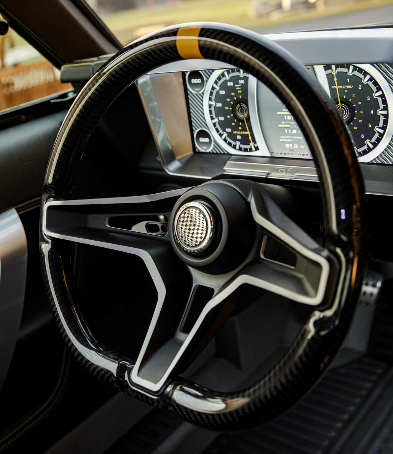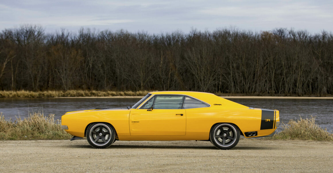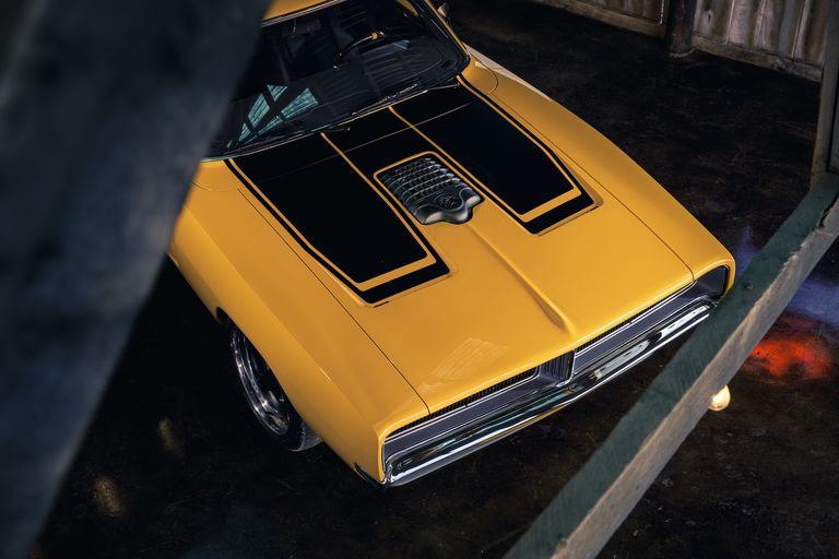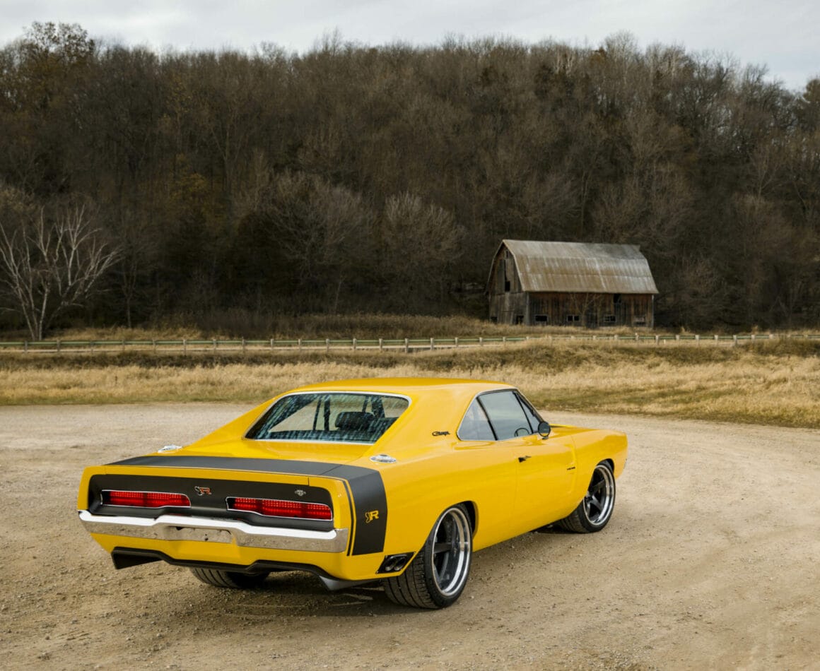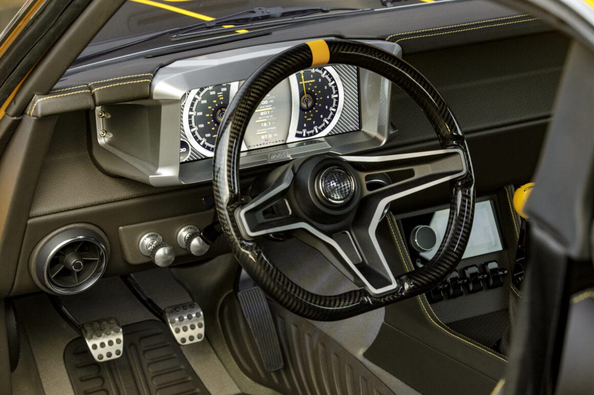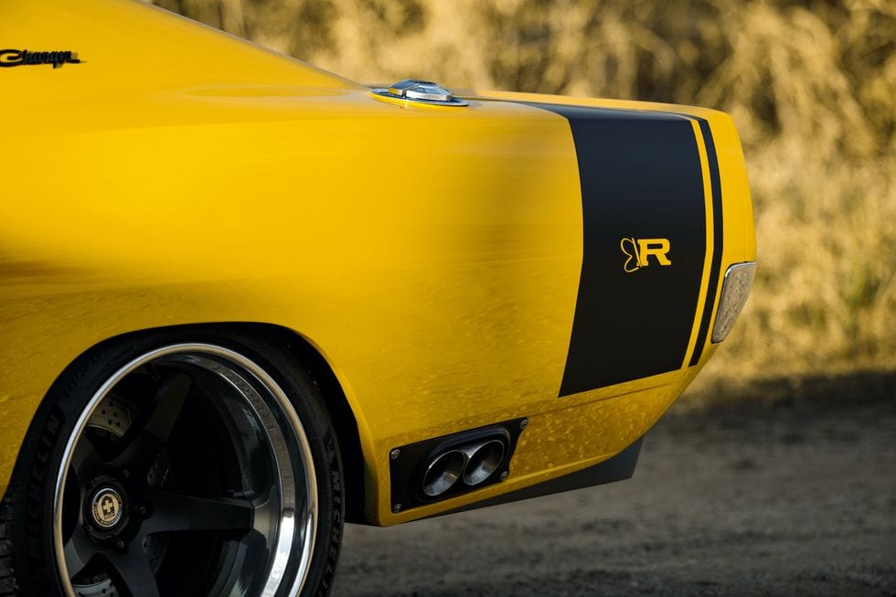 La disposition de la carrosserie sur châssis par dessous a été bannie en faveur d’une nouvelle conception monocoque, tandis que le moteur d’origine a été retiré pour un V8 Hemi Hellcat de 707 chevaux avec un compresseur qui “transpire” au travers du capot. La puissance va aux roues arrière via une transmission manuelle six vitessesTremec T-56 Magnum avec un arbre de transmission en fibre de carbone ! Parmi les autres améliorations, je mentionne les freins Bauer à six pistons, les amortisseurs réglables et les jantes HRE personnalisées enveloppées de pneus Michelin Pilot Sport 4S. La peinture est une nuance personnalisée appelée “Pile Up yellow”, au cas où vous seriez curieux… L’habitacle a été totalement remanié avec de nouveaux sièges, un nouveau tableau de bord, un volant Ringbrothers personnalisé, des compteurs MoTeC et un ECU MoTeC pour contrôler toute l’électronique. Cette superbe et unique DodgeCharger R / T de 1969, jaune avec un décor “Bumblebee” à l’arrière m’a paru être un bon sujet. Hééééééééééééé ! Vous auriez fait quoi d’autre ?