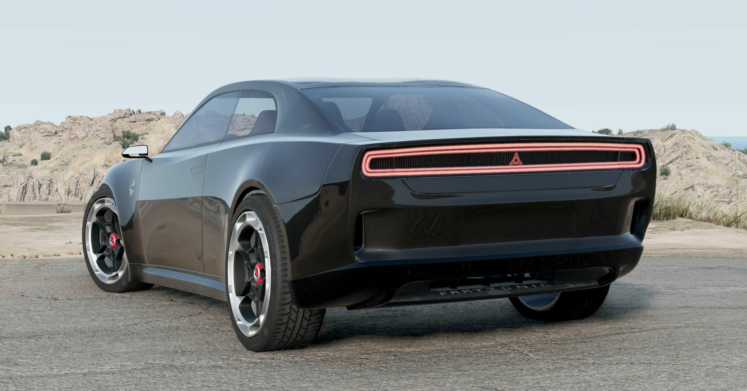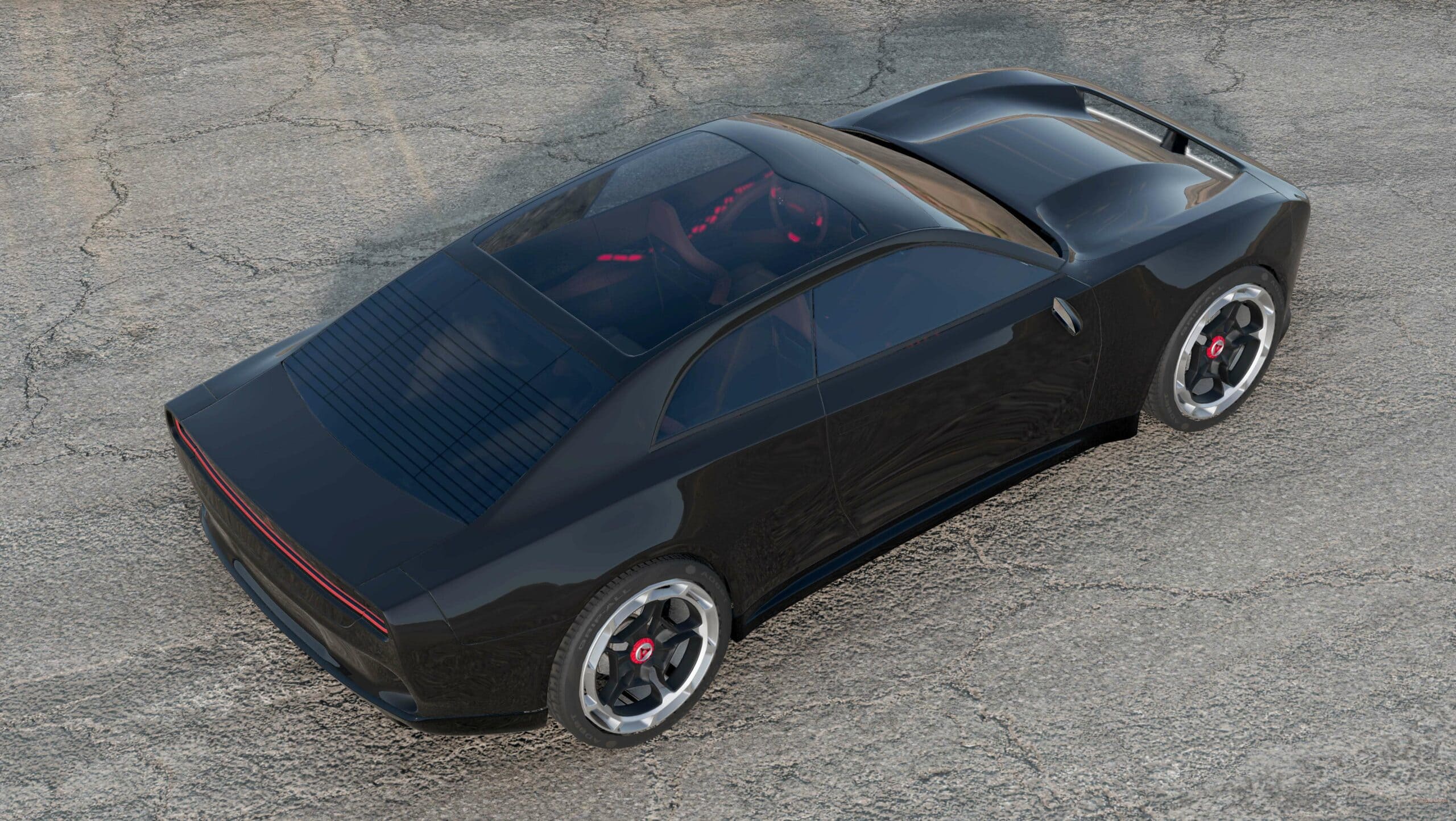 La calandre rectangulaire, rétroéclairée, et la même forme géométrique à l’arrière en LED, la poupe fuyante, les formes massives… on y retrouve un peu de la Charger de la fin des années soixante… Mais la comparaison s’arrête là. Point de huit cylindres, de gros carburateurs, de compresseur, d’échappements bruyants avec le “glou glou” caractéristique… Puisque ce concept est électrique. Donc ces fous ont ajouté un bruiteur imitant un V8… Hallucinant…