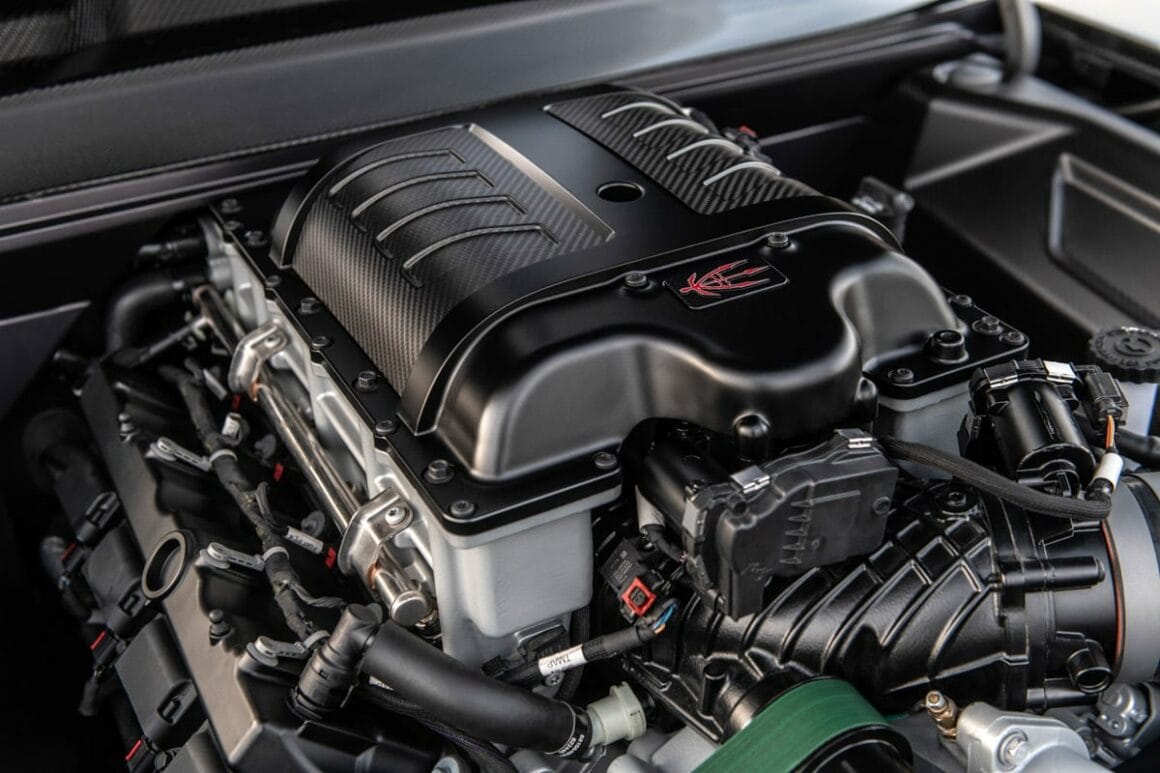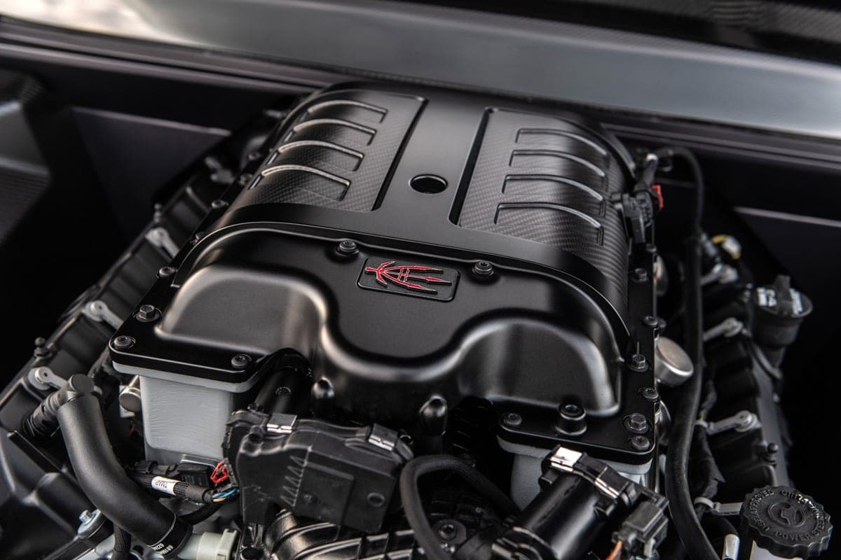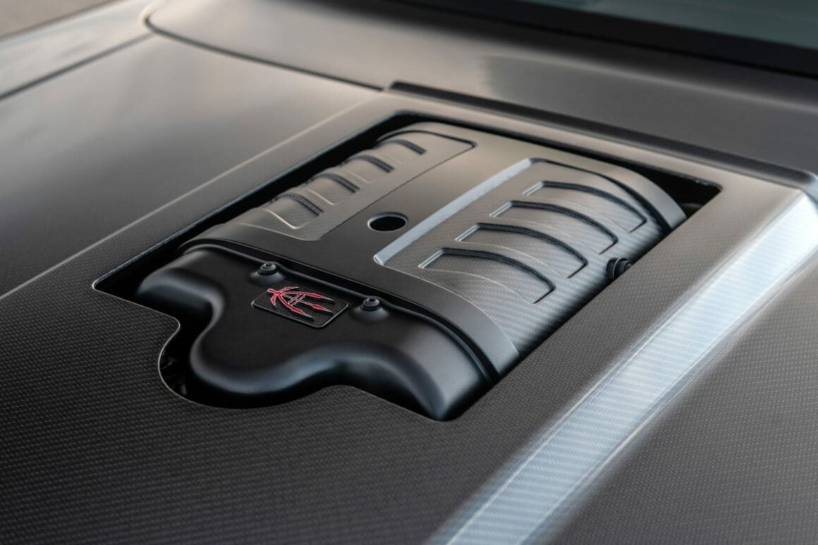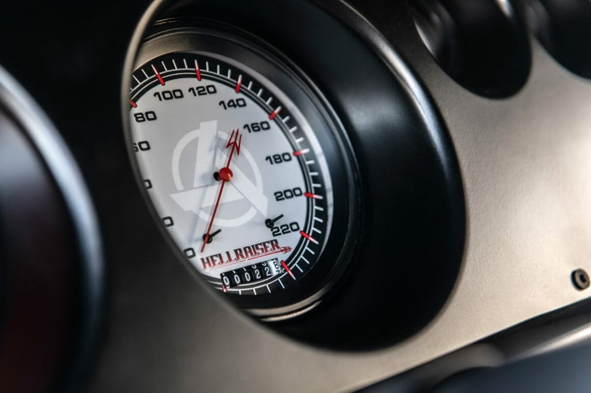 Les vitres affleurantes et les gouttières supprimées adoucissent les lignes, tandis qu’un panneau de feux arrière conçu par SpeedKore et deux embouts d’échappement intégrés affinent l’arrière-train. Pour mettre en valeur le moteur Hellephant, il y a une découpe de capot exposant le compresseur, qui est personnalisé avec une billette alu sur mesure et un couvercle en fibre de carbone.