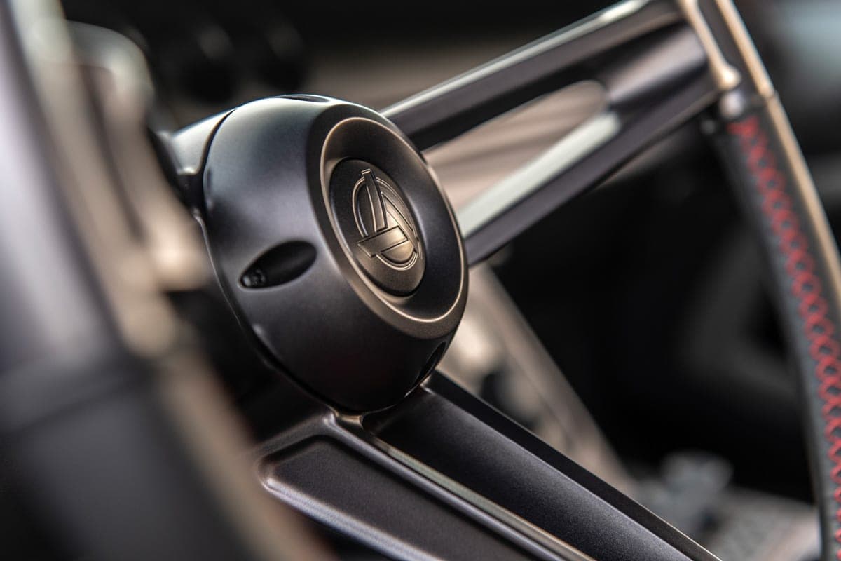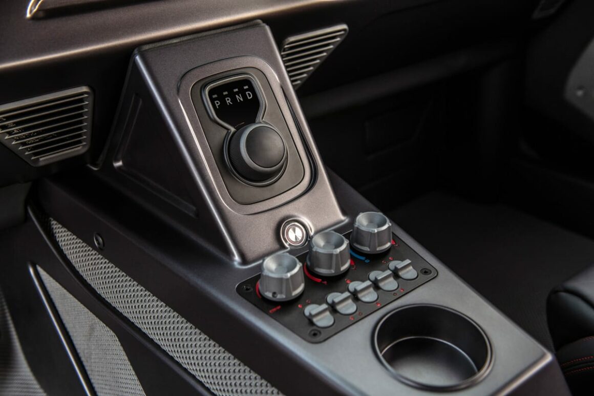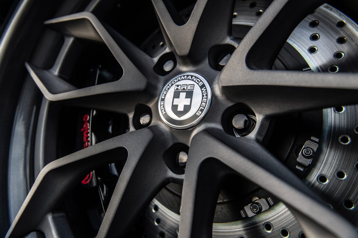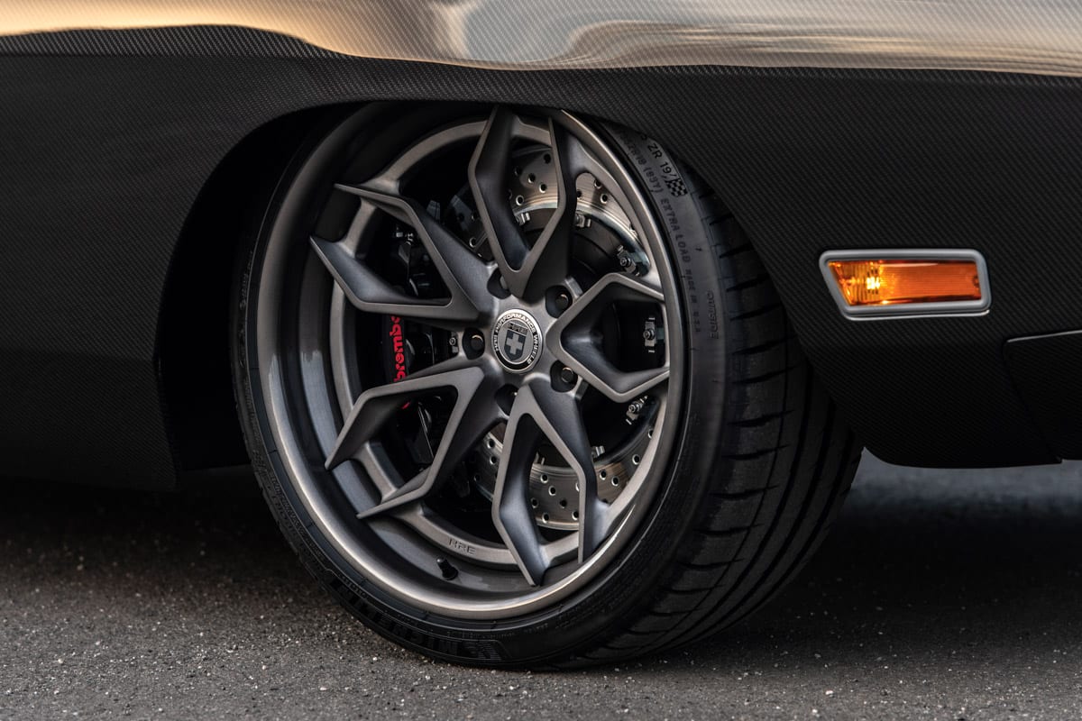 Hart voulait laisser les panneaux en fibre de carbone de haute technologie exposés, de sorte que la carrosserie a été finie avec plusieurs couches de vernis brillant BASF Glasurit. Les autres éléments extérieurs ne sont pas moins impressionnants. L’ensemble de la calandre et de la plupart des pièces de garniture sont usinés à partir d’aluminium massif et de Cerakoted, dans une finition titane grise pour une apparence musclée moderne.