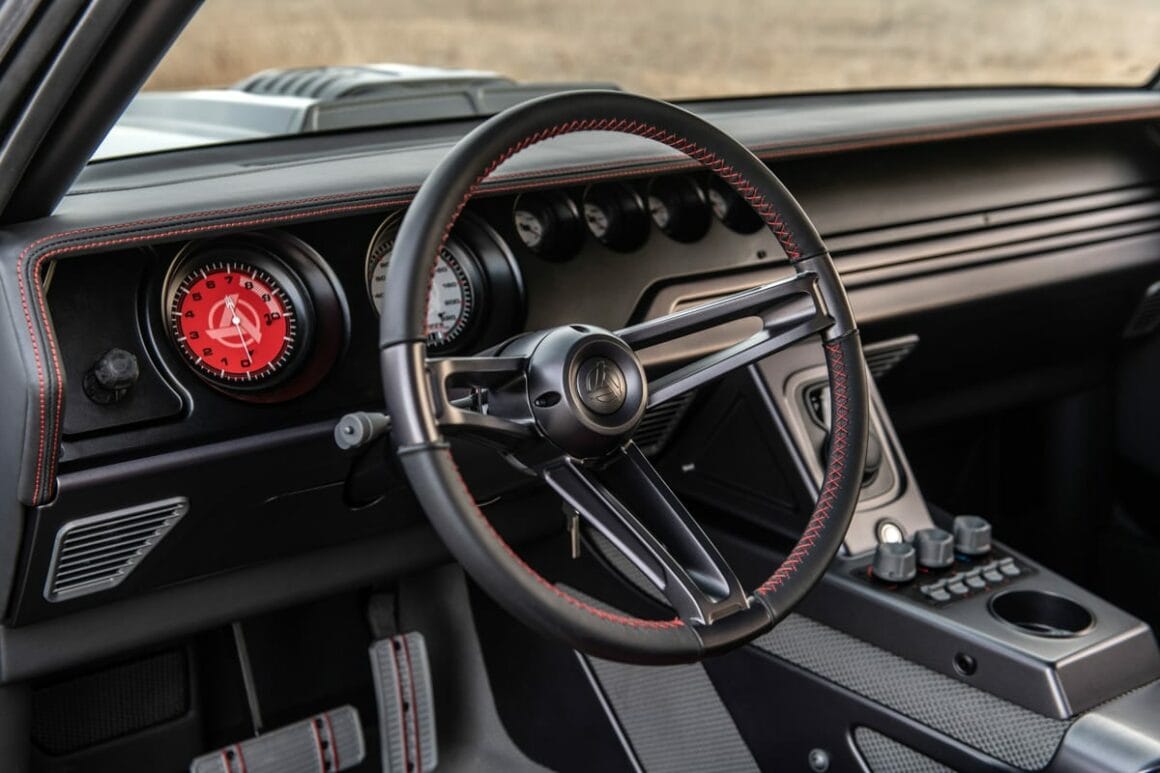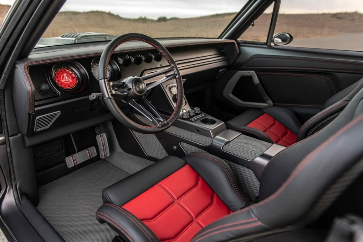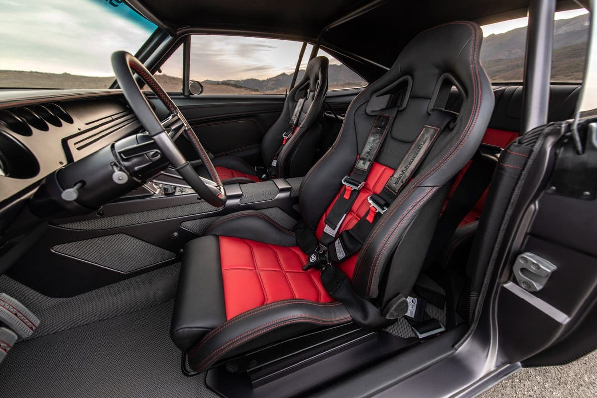 Il y a même une cage de sécurité intégrée à 14 points. La suspension avant Detroit Speed intègre des amortisseurs à ressorts hélicoïdaux à double réglage Penske et des freins à disque Brembo à six pistons, tandis qu’une suspension arrière à quatre barres localise un train arrière de 9 pouces suspendu par deux autres ressorts hélicoïdaux Penske et équipé de disques Brembo à quatre pistons.