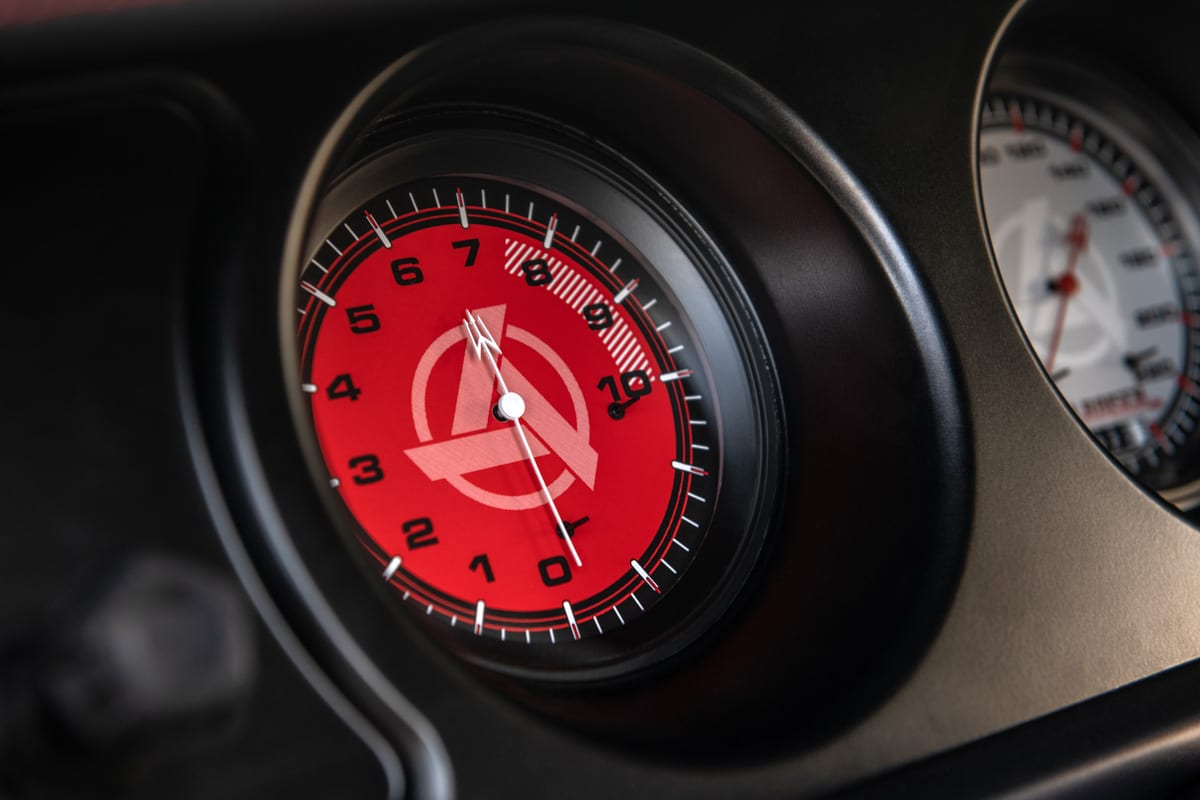Il a recouvert d’autres panneaux assortis, notamment un coussin noir avec des surpiqûres rouges pour le tableau de bord personnalisé. Une console unique et un complément d’autres composants personnalisés créent une sensation rétro-moderne, avec des détails bien pensés comme les jauges de marque SpeedKore de Classic Instruments et les commutateurs en billette.