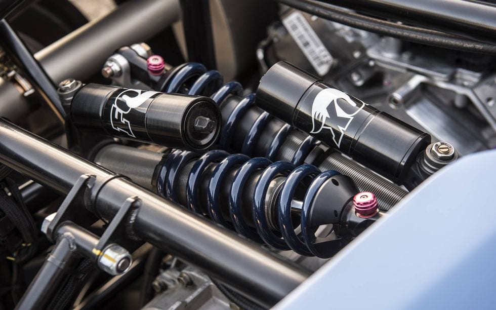La suspension en porte-à-faux utilise des amortisseurs Fox Racing réglables dans trois directions et le freinage est géré par des étriers Wilwood avec des rotors flottants en deux parties de 12,9po. Les sièges moulés sont équipés de harnais Schroth à six points. L’équipement supplémentaire comprend le réglage de la polarisation des freins Tilton, un rétroviseur sur le pare-brise et un volant MOMO amovible encadrant un enregistreur numérique AiM MXS.