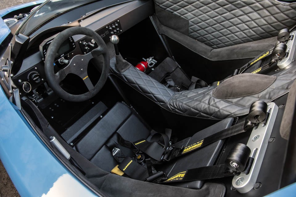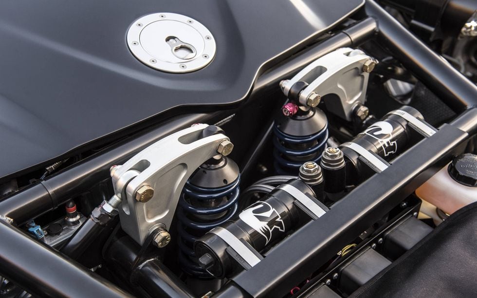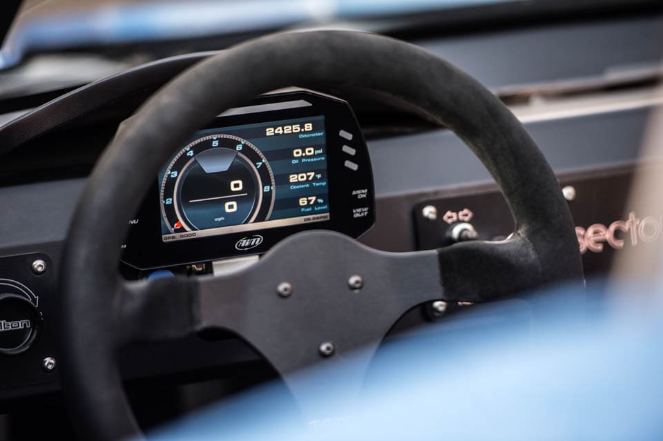 Ce bloc de 420 chevaux est jumelé à une boîte-pont manuelle Porsche G96 à six vitesses. L’équipement comprend un différentiel à glissement limité, des roues HRE de 17 pouces, des freins Wilwood, une suspension Fox Racing, des spoilers avant et arrière ARP Performance, des phares bi-xénon, des ailes en fibre de carbone, des sièges moulés dans le cockpit avec harnais Schroth à six points, un volant MOMO et un enregistreur de tableau de bord AiM MXS.
