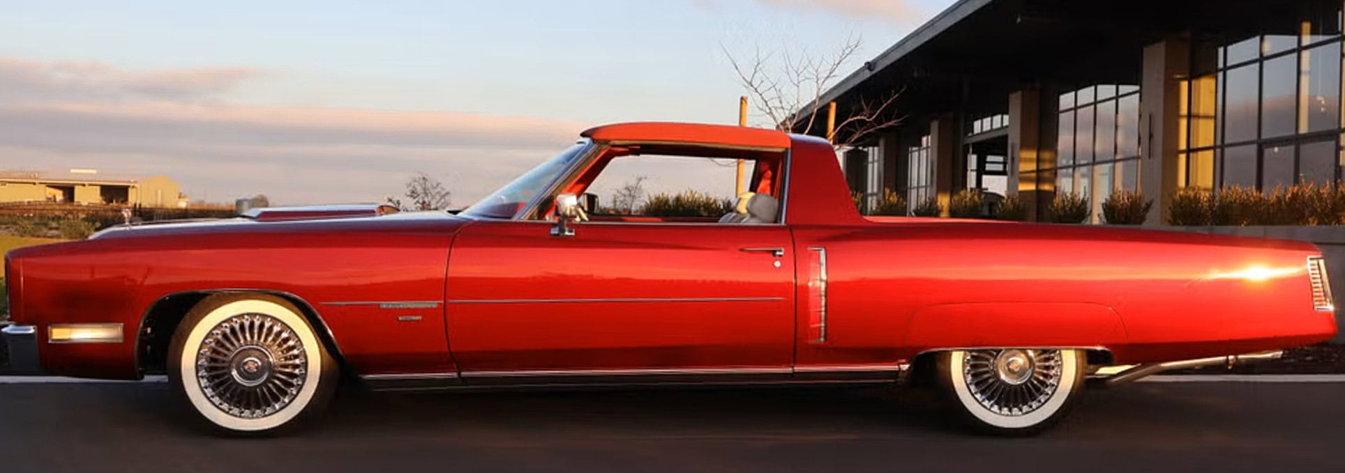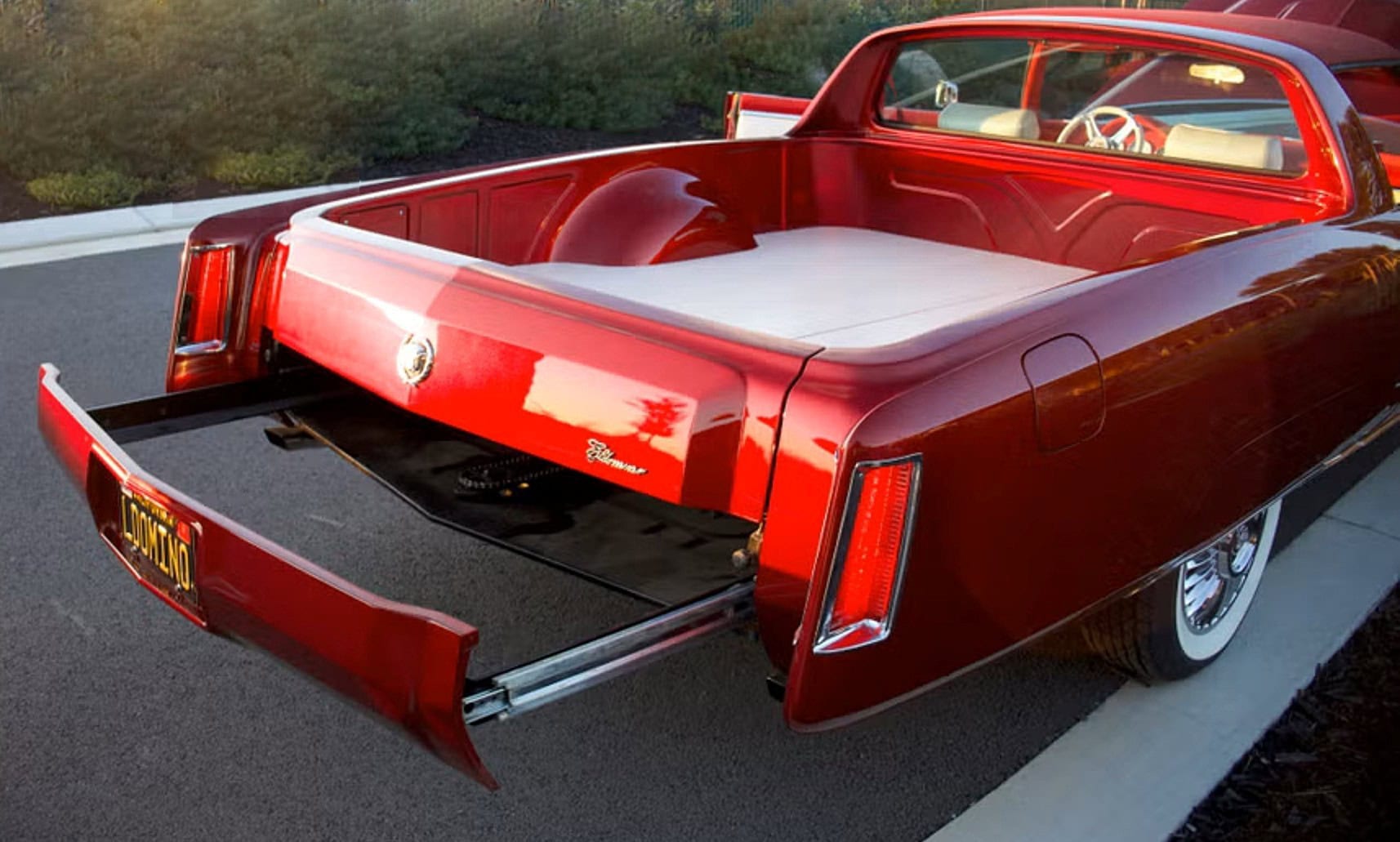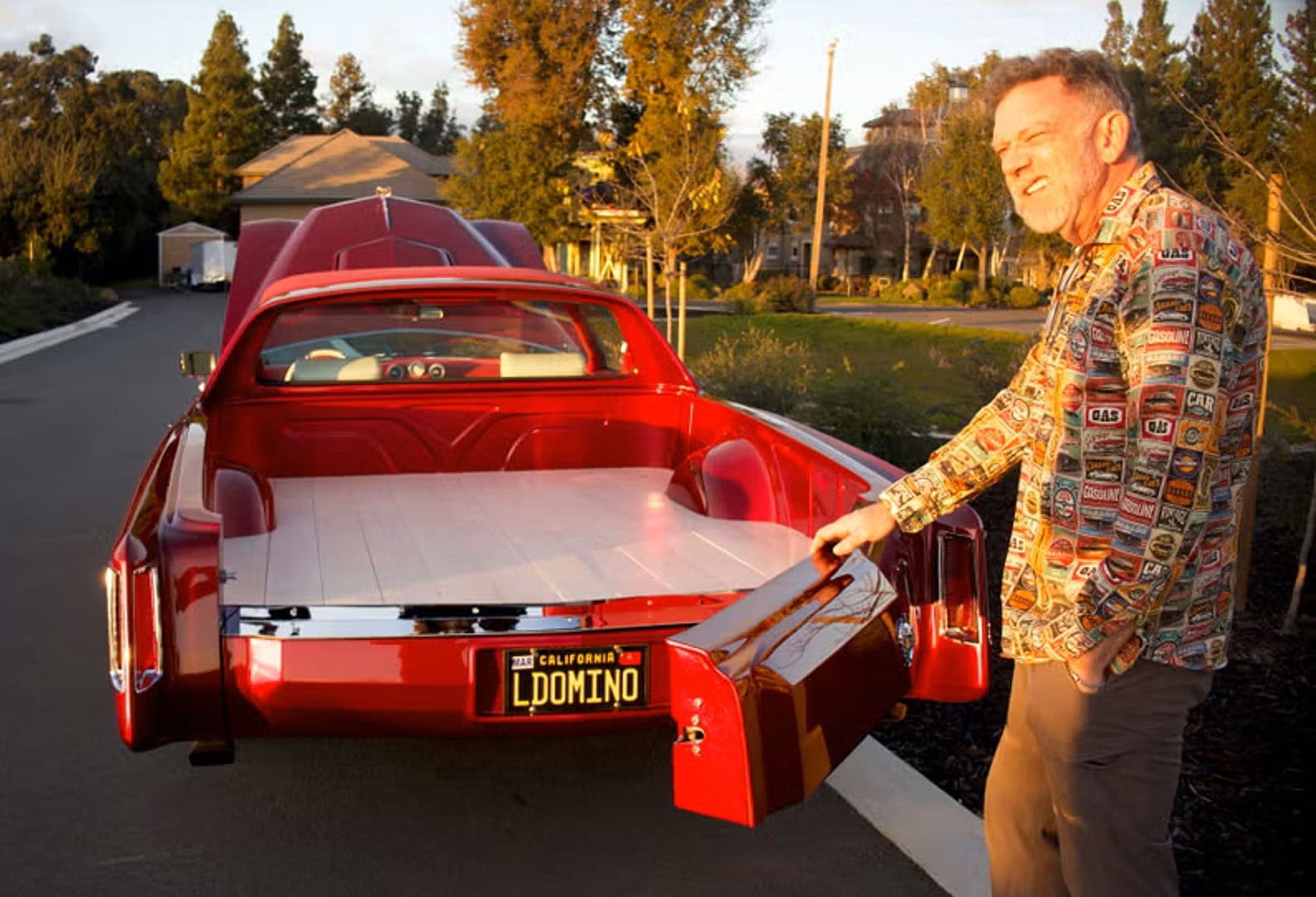 L’aventure a commencé au fil des ateliers de restauration. La voiture a passé beaucoup de temps chez “Kustom Kurves”, à Lodi, la ville natale de Clark. Elle est ensuite passée chez “Finish Line”, un atelier de restauration d’intérieurs à Santa Clara, puis chez “Full Circle Restoration” à Lockeford, en Californie. Le nom “Eldomino” est apparu environ trois ans après le début de la restauration. “Rien n’a été simple sur cette voiture. Fixer la benne de l’El Camino sur le châssis de la Cadillac a posé d’innombrables problèmes, la cloison pare-feu entre la cabine et la benne a dû être façonnée à la main. Le logo Eldomino apparaît à trois endroits (sans compter les plaques d’immatriculation). La suspension pneumatique assure le confort de conduite ; sans elle, le poids du véhicule et le châssis allongé provoqueraient des vibrations insupportables. L’intérieur est presque entièrement personnalisé, tandis que les instruments de bord proviennent de chez “Speedhut”…