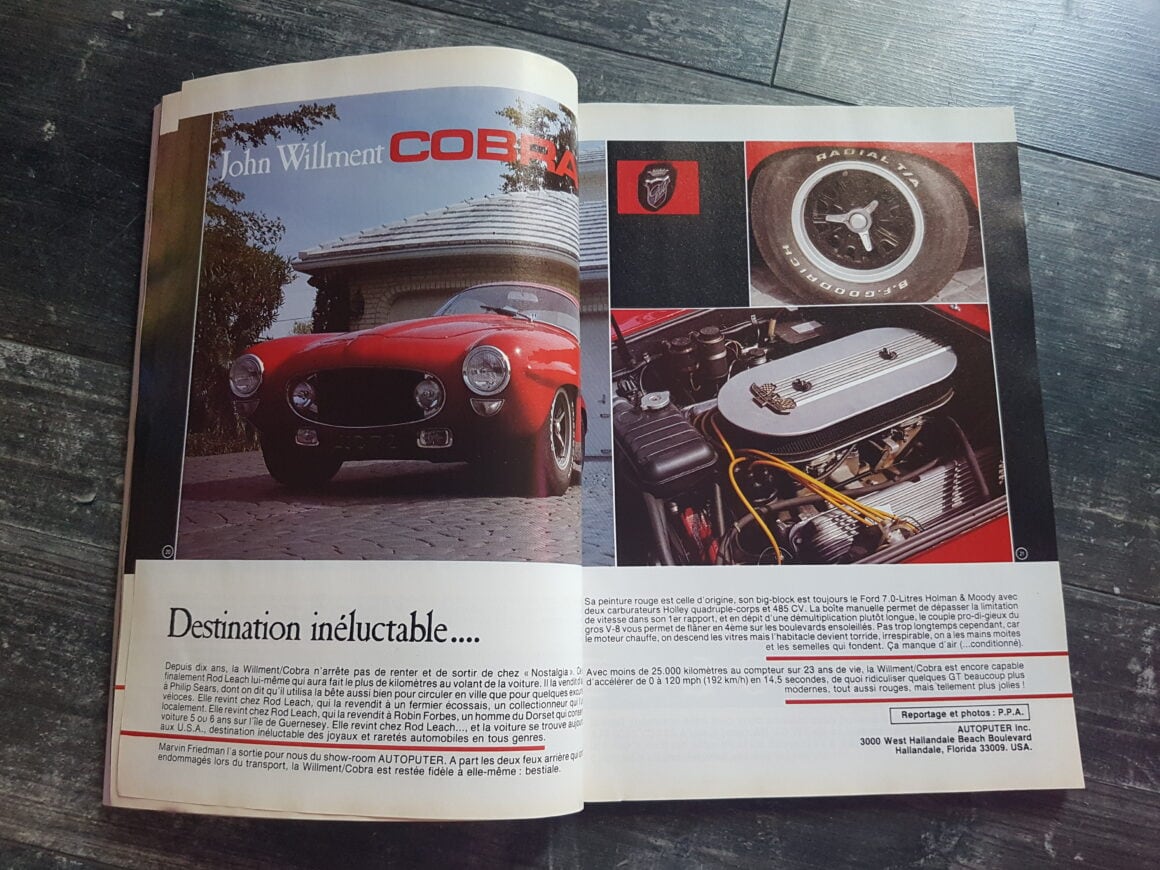 La Cobra Willment va ensuite à nouveau revenir chez Rod Leach qui va en finale la vendre à “Marvin Friedman” propriétaire du garage “Autoputer” en Floride. Les U.S.A sont souvent la destination inéluctable des joyaux et raretés automobiles en tous genres. Marvin Friedman l’a sortie pour moi de son garage/show-room “Autoputer”. La voiture était à vendre pour 50.000US$ et, avec John Mc Evoy (que j’employais alors comme Rédacteur en Chef en duo avec Jacky Ickx) on a pu rouler deux heures en totale liberté à son volant et réaliser diverses (mauvaises) photos souvenirs qui vont servir pour publier un article dans mes magazines Auto-Chromes et ses dérivés : Auto-Kraft, Auto-Kracht, Auto-Mania et Top-Wheels. A part les deux feux arrière qui avaient été endommagés lors du transport d’Angleterre vers les USA, la Willment/Cobra était restée fidèle à elle-même : bestiale. Sa peinture rouge était celle d’origine, son big-block était toujours le Ford 7-Litres Holman&Moody avec deux carburateurs Holley quadruple-corps et 485 CV. La boîte manuelle permettait de dépasser la limitation de vitesse dans son 1er rapport… et, en dépit d’une démultiplication plutôt longue, le couple pro-di-gieux du gros V-8 permettait de flâner en 4ème sur les boulevards ensoleillés. Pas trop longtemps cependant, car le moteur chauffait “à mort” ! Même vitres baissées l’habitacle devenait torride, irrespirable, j’avais les mains moites et les semelles qui fondaient. Ça manquait d’air conditionné ! Avec moins de 25.000 Miles au compteur sur un demi-siècle de vie, la Willment/Cobra était encore capable d’accélérer de 0 à 120 mph (192 km/h) en 14,5 secondes, de quoi ridiculiser quelques GT beaucoup plus modernes, tout aussi rouges, mais “tellement plus jolies” !