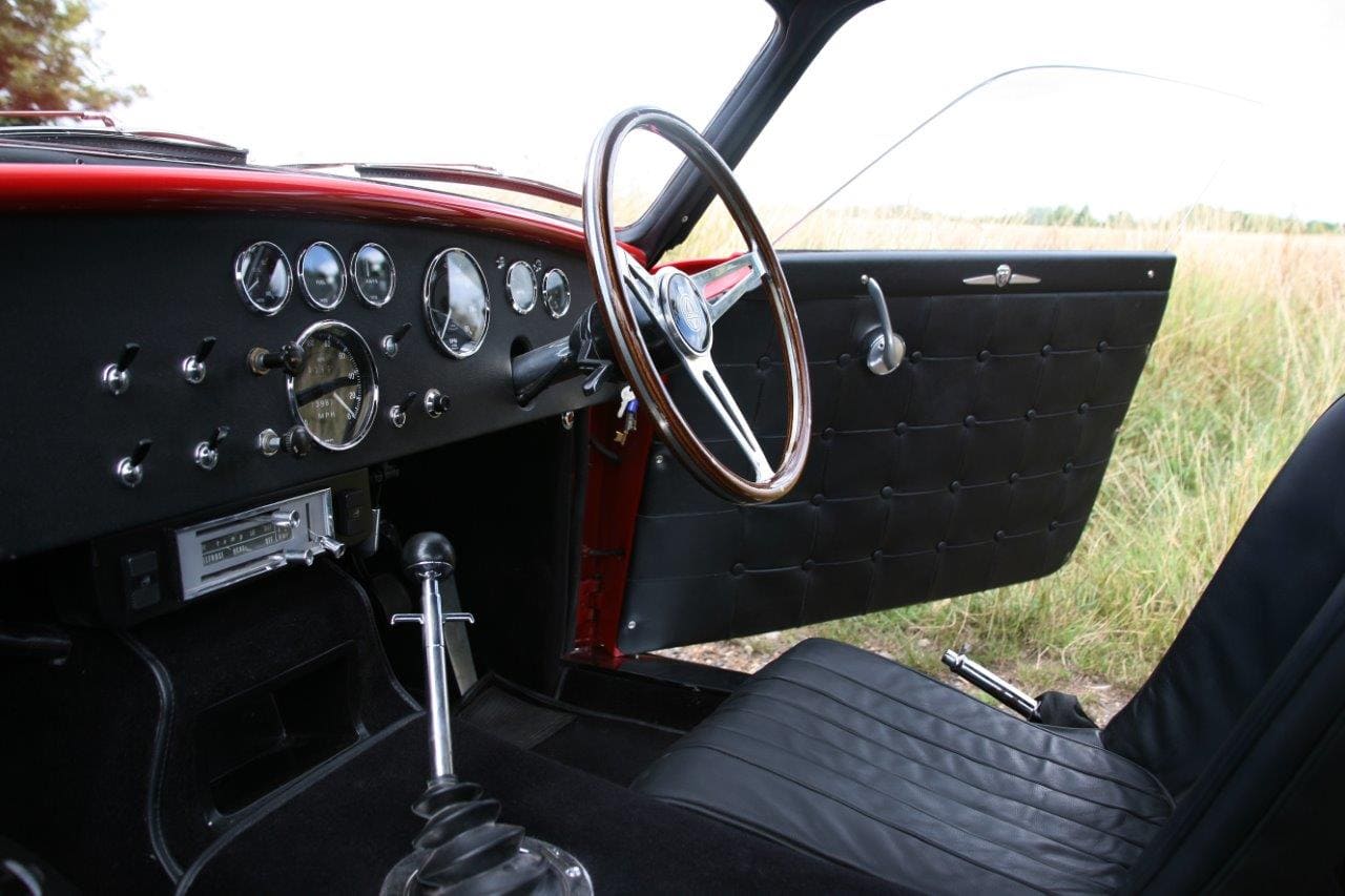Comme déjà écrit ci-dessus mais je ne m’en lasse pas plus que vous, cette Willment Ghia Cobra unique combine la carrosserie italienne avec un châssis britannique et la puissance américaine. La carrosserie en aluminium “Fiat-Supersonic” a été conçue en 1953 par Giovanni Savonuzzi alors qu’il travaillait pour l’entreprise de carrosserie Ghia. Elle était à l’origine montée sur un châssis Fiat pour devenir l’une des dix-neuf seules Otto Vu (V8) 2 litres de prestige haute performance. Au cours des années 1960, la carrosserie supersonique a été retirée de son châssis Fiat et montée sur un châssis Cobra de 7 litres qui faisait partie du contrat Shelby American/Ford USA pour cent unités de carrosserie/châssis 427 et était livré avec un numéro de châssis estampillé AC # CSX3055. Le châssis avait été acheté à AC Cars Ltd. en 1965 par l’équipe de course Willment qui avait l’intention de le transformer en 427 Cobra course.