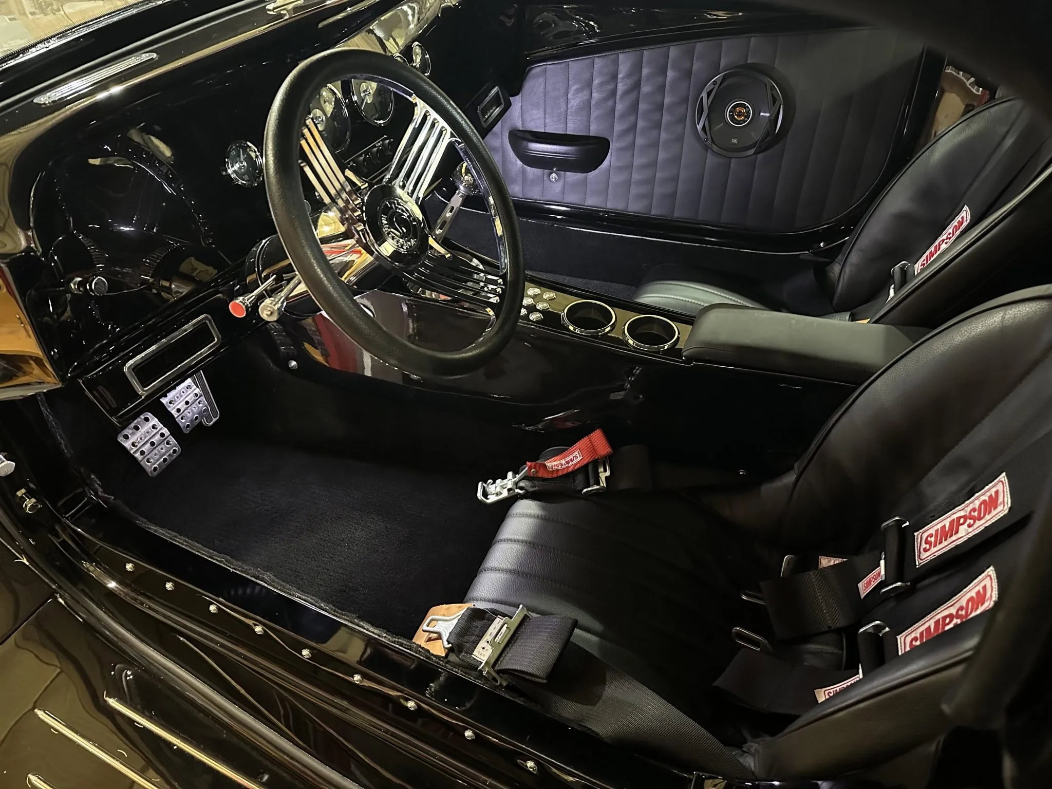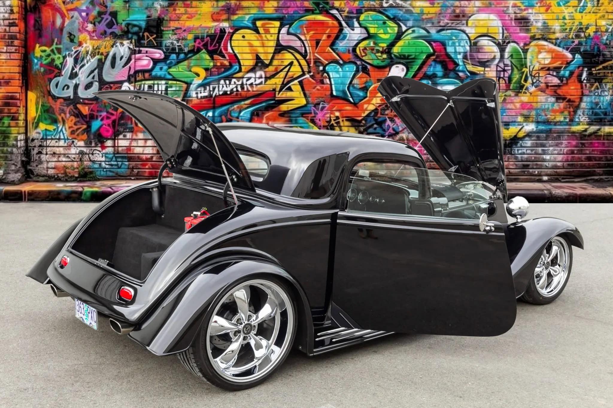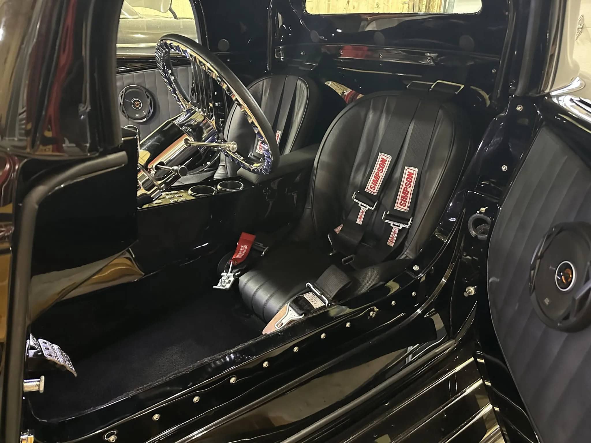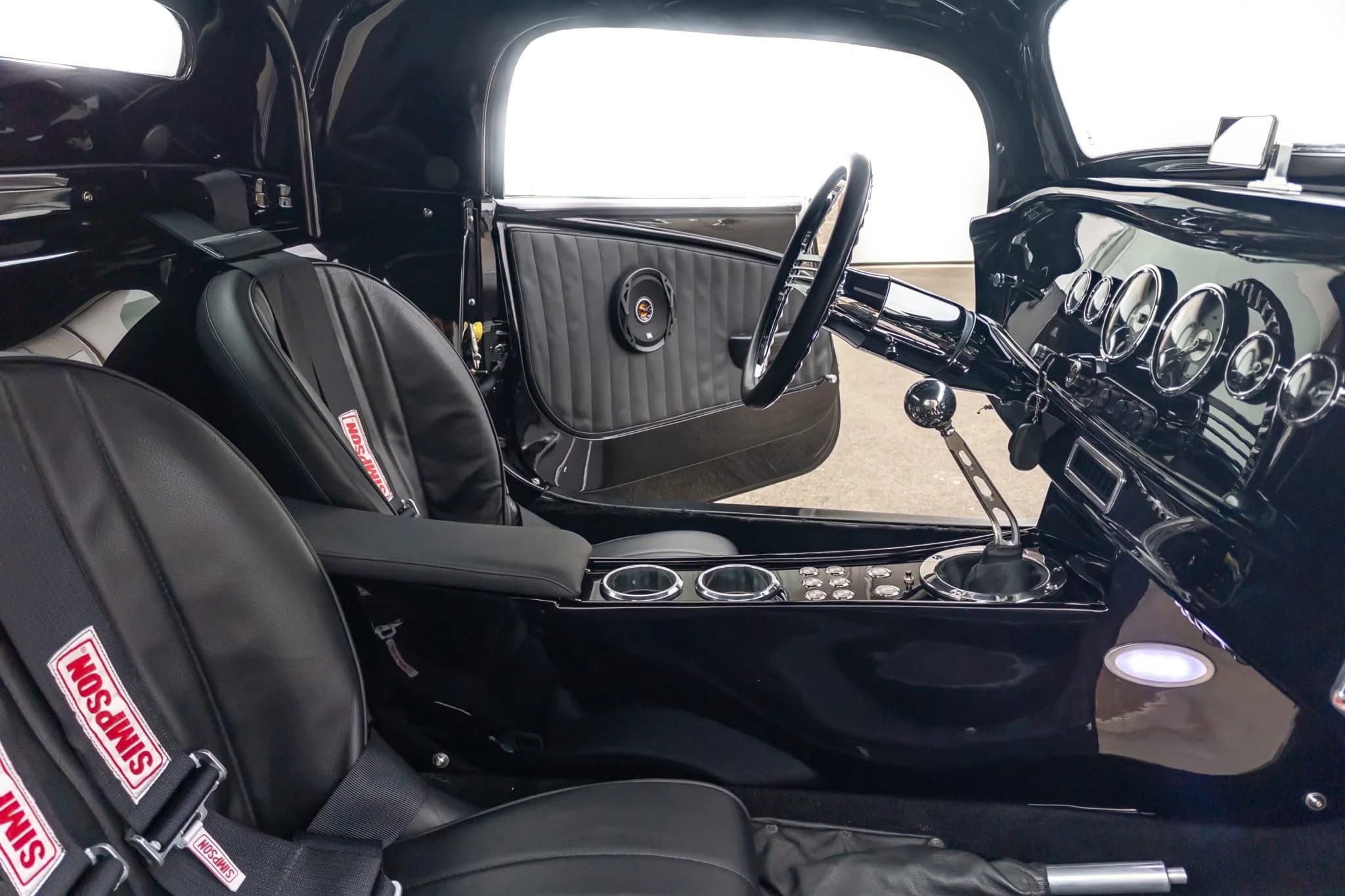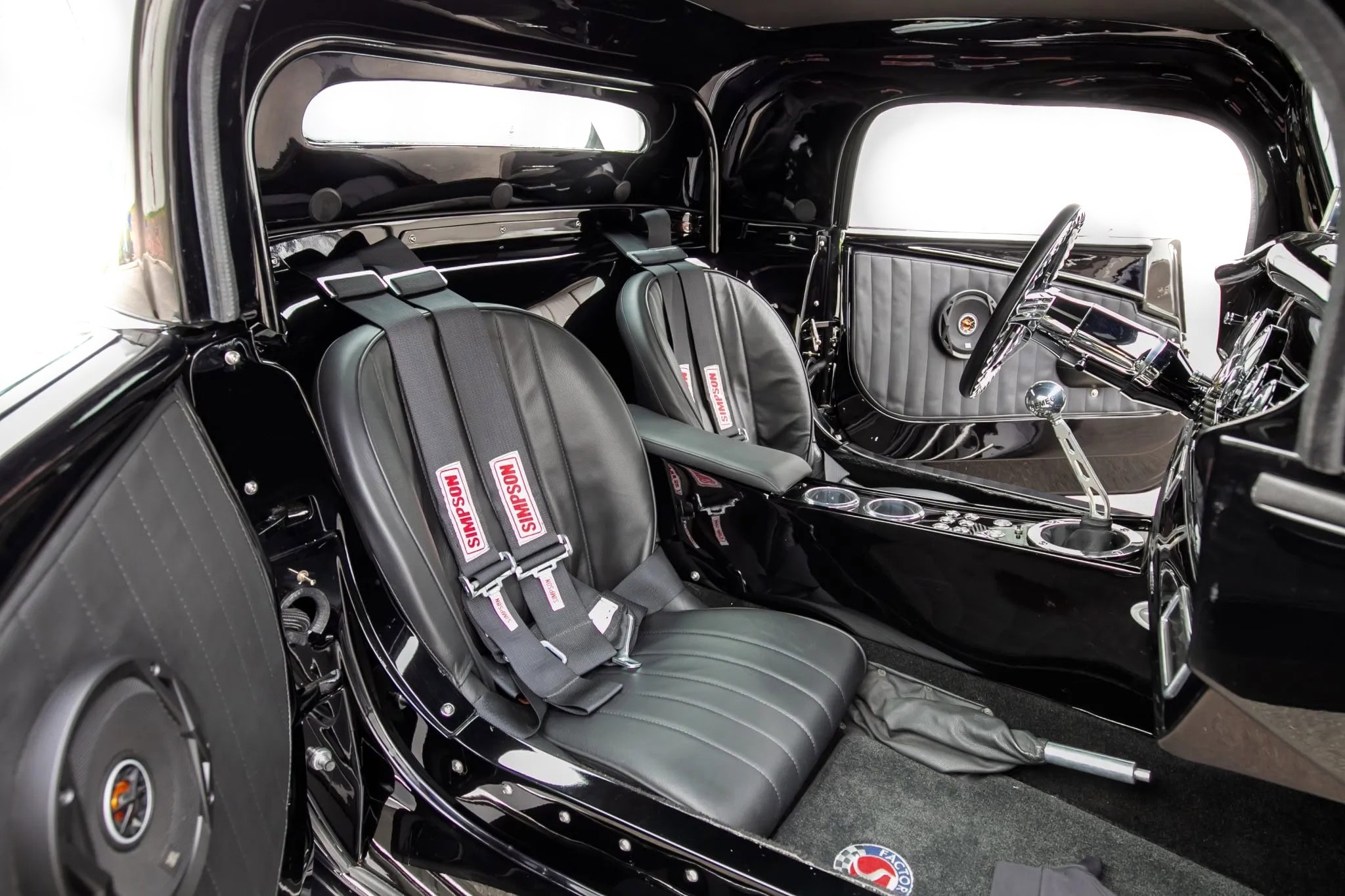 L’intérieur comprend des sièges baquets, des harnais de course Simpson, un levier de vitesses Tremec avec grille façon Ferrari, des instruments Speedhut, une climatisation Vintage Air et une radio Custom Autosound dissimulée. Ce Hot Rod daté 1933 selon les lois américaines alors qu’il est 100% neuf dispose d’une carte grise de l’Oregon “en règle”, mentionnant qu’il s’agit d’un modèle ASVE de 2014… Essayez ça en France pour voir… La carrosserie composite, réalisée à la main, s’inspire d’un coupé Ford trois fenêtres de 1933 et est peinte en noir avec une touche de peinture rouge nacrée.