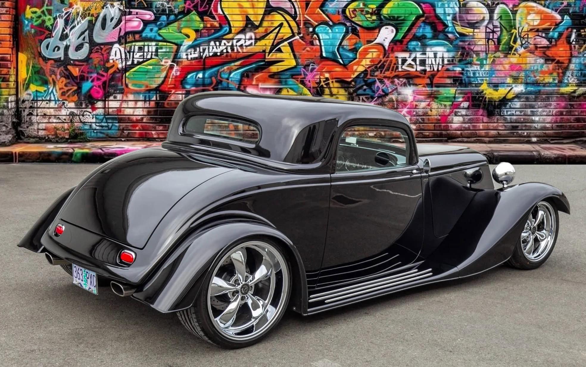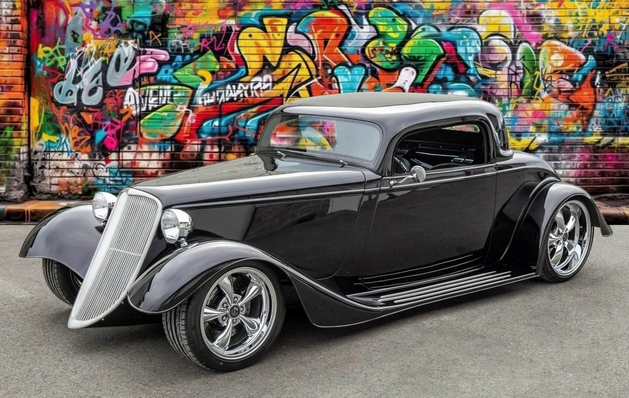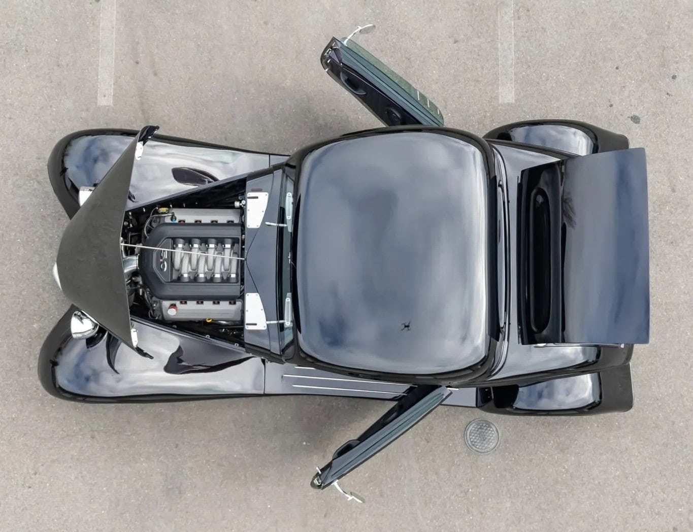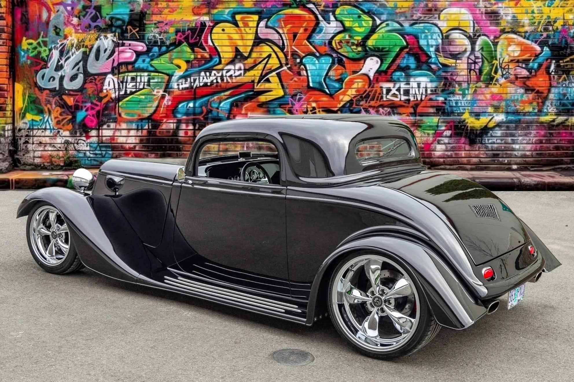 L’intérieur comprend des sièges baquets, des harnais de course Simpson, un levier de vitesses Tremec avec grille façon Ferrari, des instruments Speedhut, une climatisation Vintage Air et une radio Custom Autosound dissimulée. Ce Hot Rod daté 1933 selon les lois américaines alors qu’il est 100% neuf dispose d’une carte grise de l’Oregon “en règle”, mentionnant qu’il s’agit d’un modèle ASVE de 2014… Essayez ça en France pour voir… La carrosserie composite, réalisée à la main, s’inspire d’un coupé Ford trois fenêtres de 1933 et est peinte en noir avec une touche de peinture rouge nacrée.
