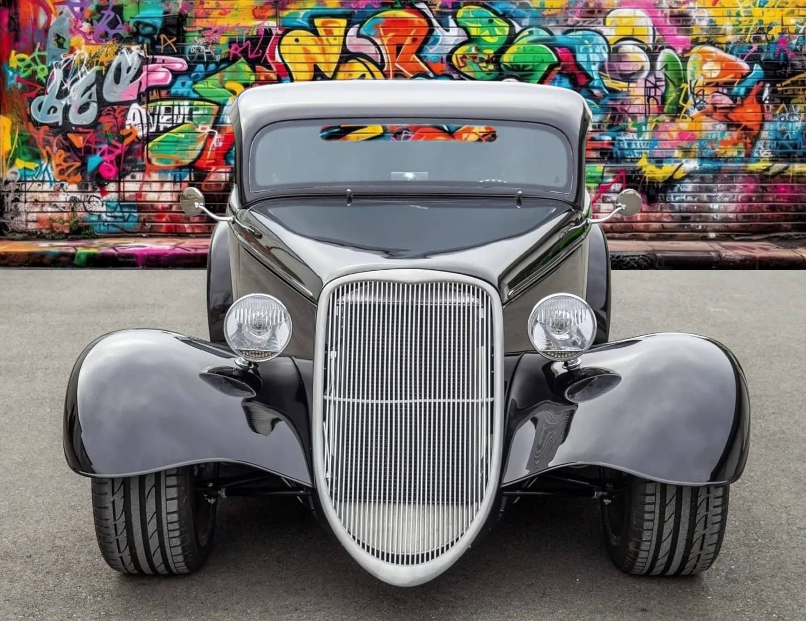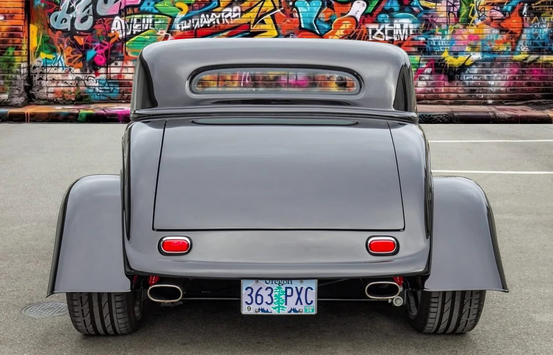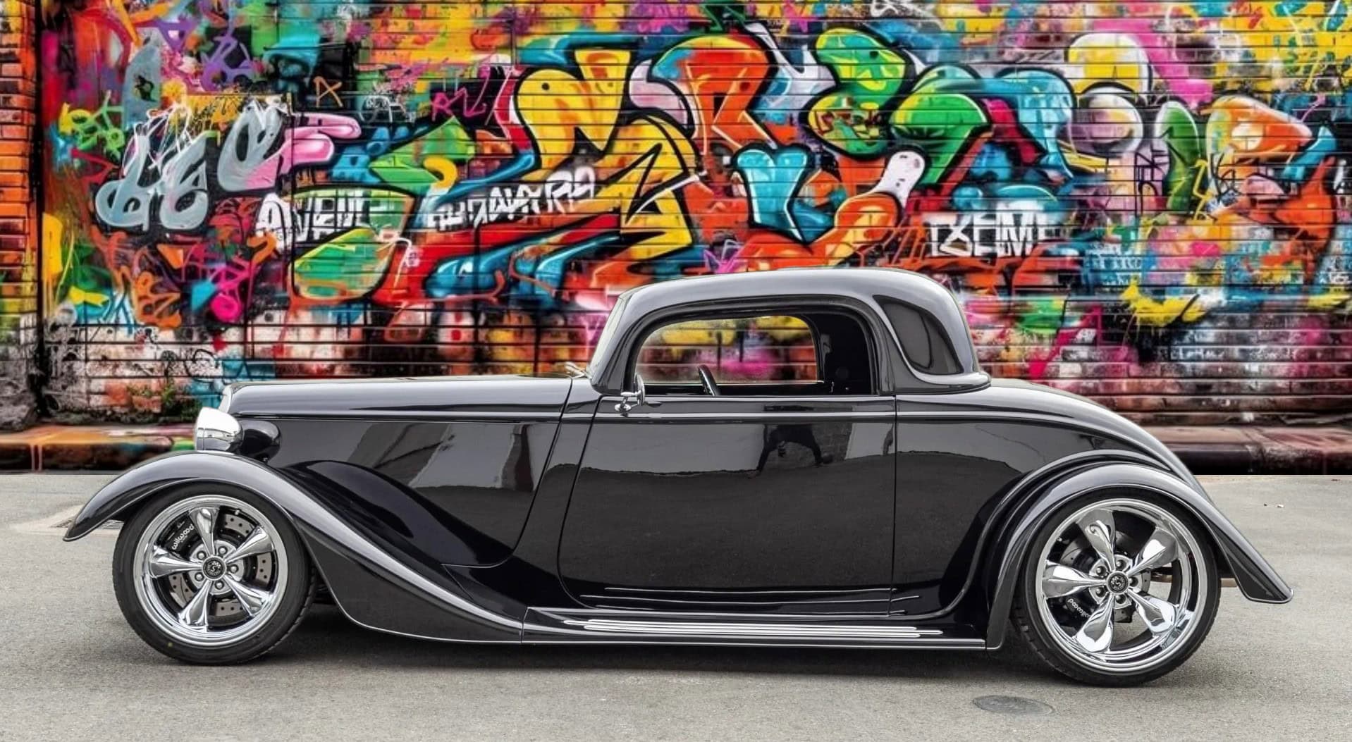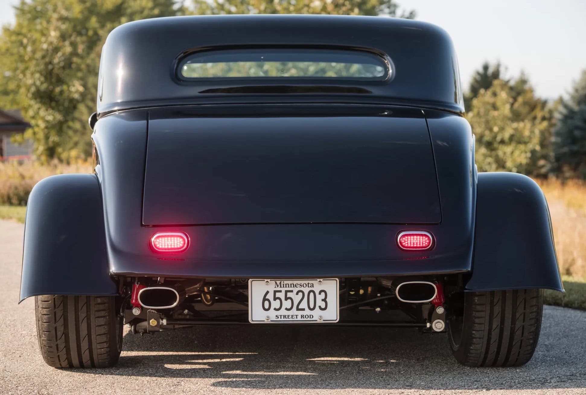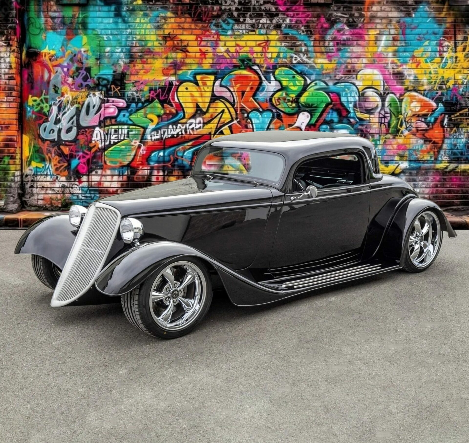 L’intérieur comprend des sièges baquets, des harnais de course Simpson, un levier de vitesses Tremec avec grille façon Ferrari, des instruments Speedhut, une climatisation Vintage Air et une radio Custom Autosound dissimulée. Ce Hot Rod daté 1933 selon les lois américaines alors qu’il est 100% neuf dispose d’une carte grise de l’Oregon “en règle”, mentionnant qu’il s’agit d’un modèle ASVE de 2014… Essayez ça en France pour voir… La carrosserie composite, réalisée à la main, s’inspire d’un coupé Ford trois fenêtres de 1933 et est peinte en noir avec une touche de peinture rouge nacrée.