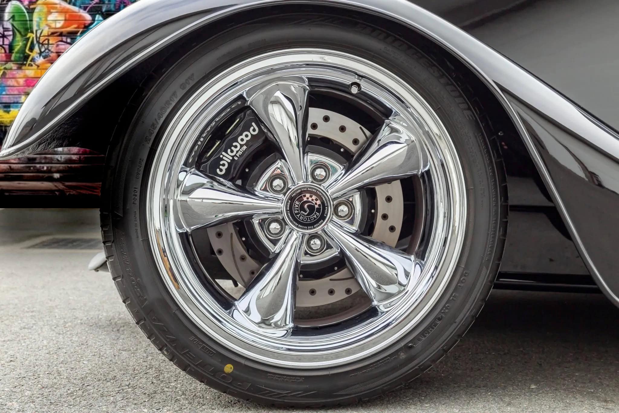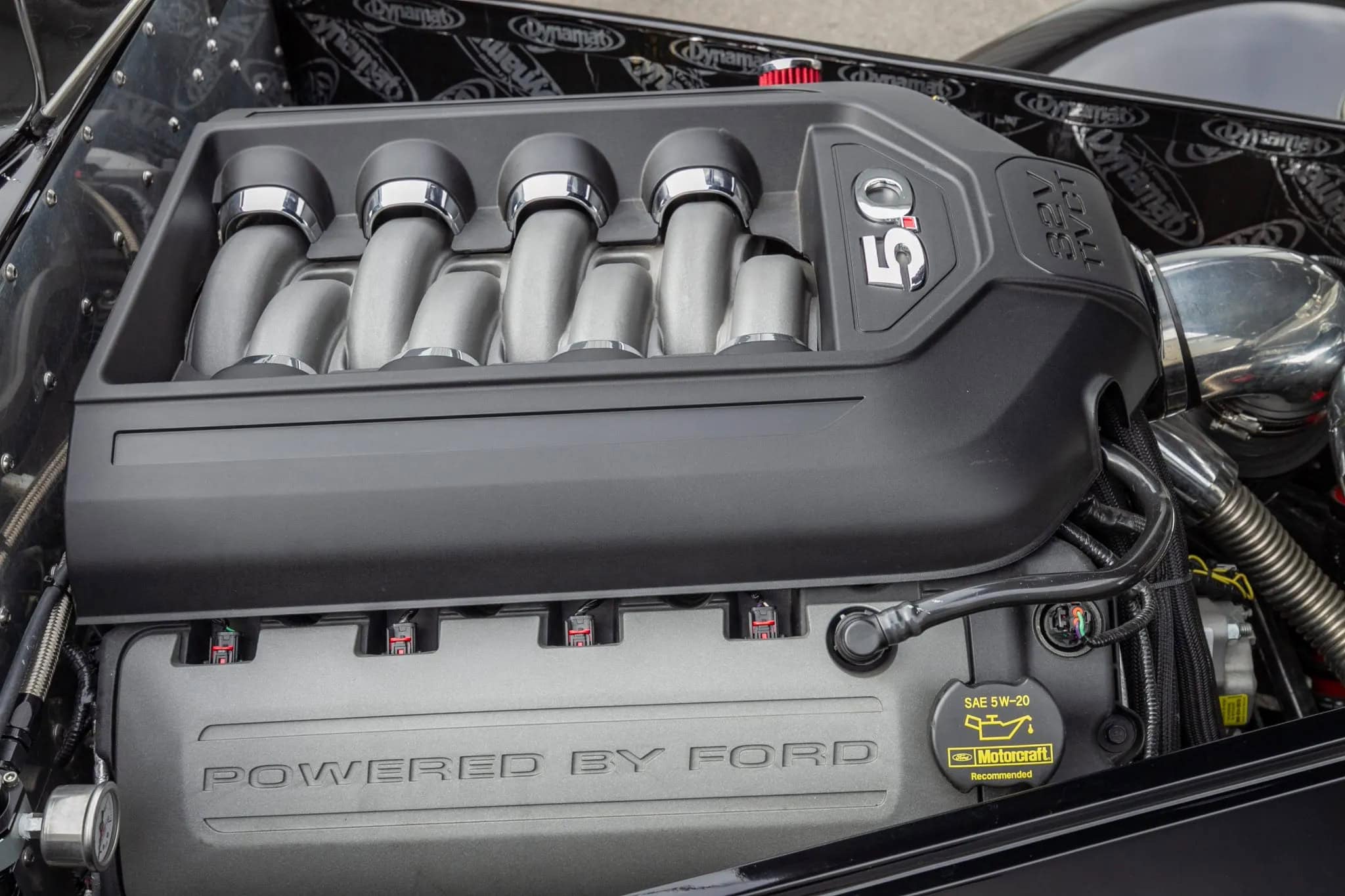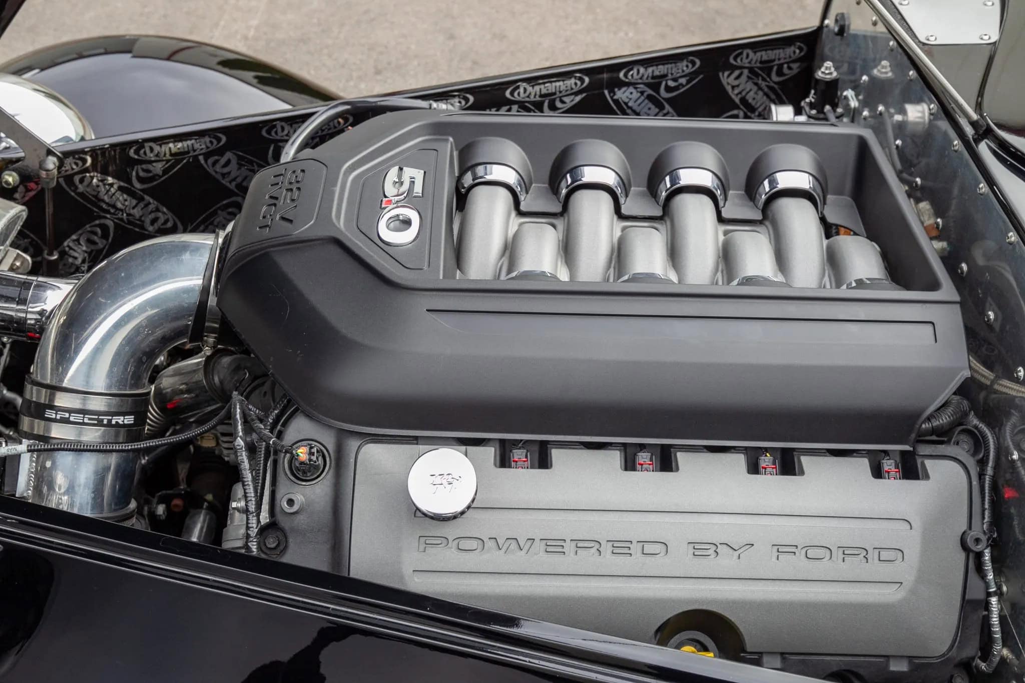 Ce Hot Rod Factory Five Coupé à portes “suicides” est propulsé par un V8 Ford Coyote 5 litres associé à une boîte manuelle Tremec TKO 600 à cinq rapports. Sa carrosserie en composite repose sur un châssis caisson en acier et la bête est équipée d’une suspension avant de type cantilever avec bras supérieurs tubulaires et bras inférieurs réglables, d’un essieu arrière à trois bras avec également des amortisseurs réglables. Des jantes chromées Torq Thrust décalées sont montées avec des freins Wilwood.