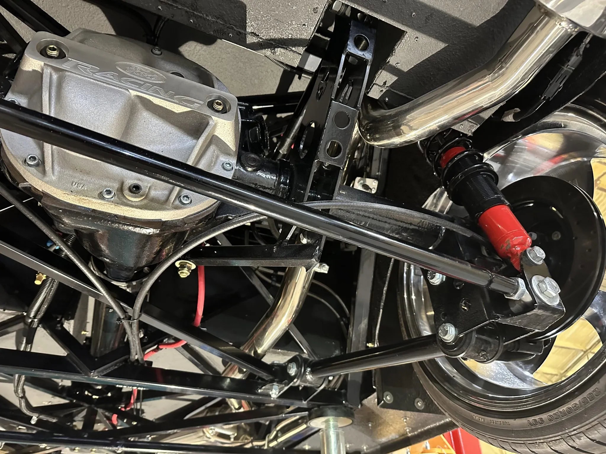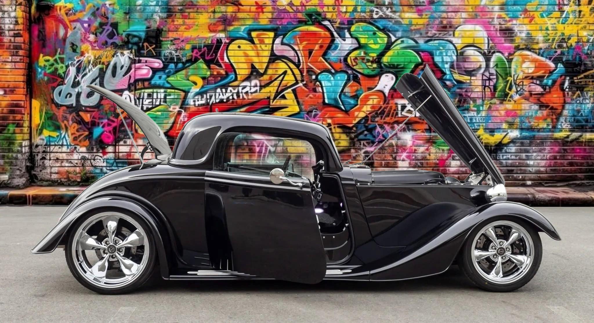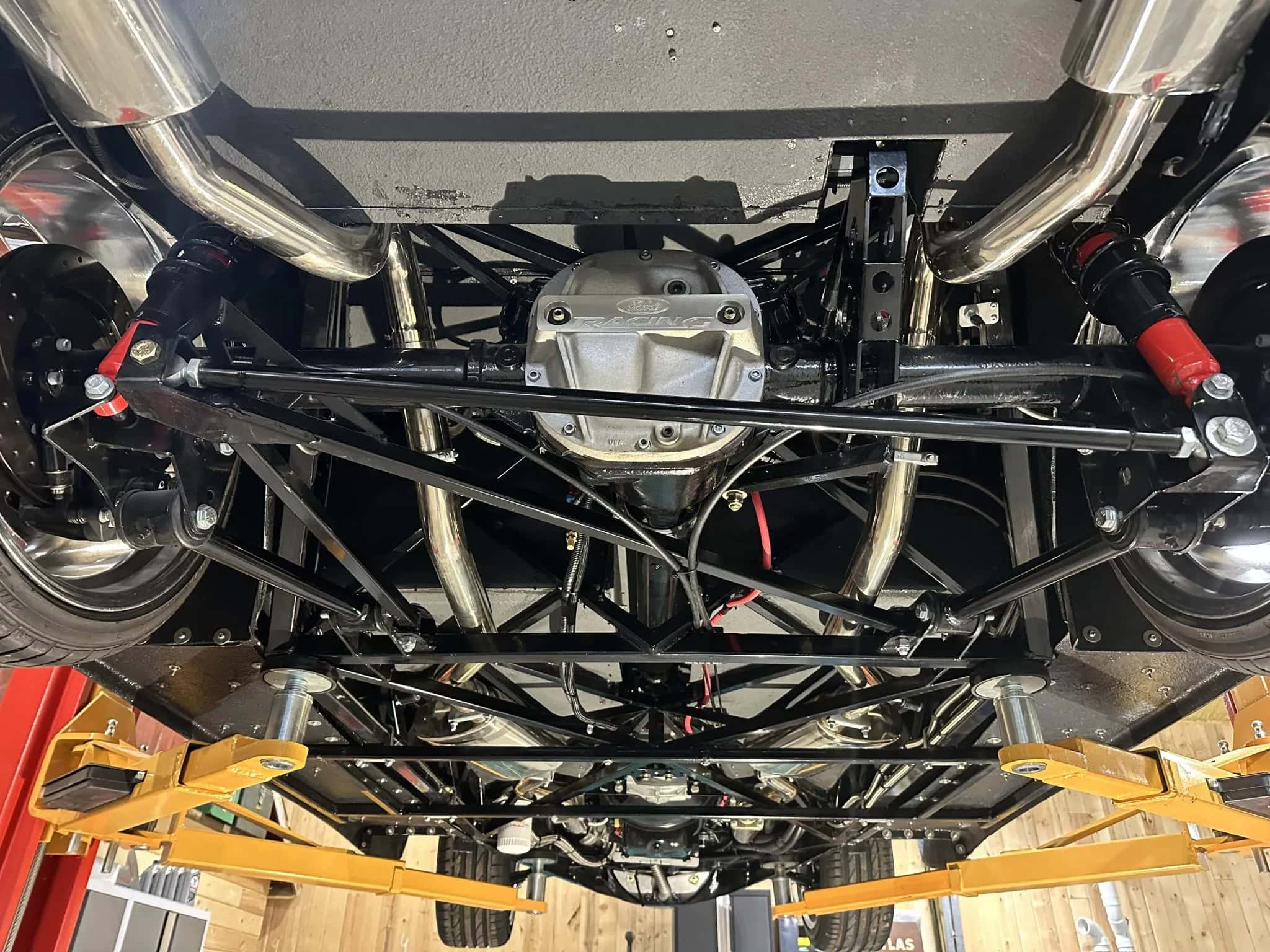 Ce Hot Rod Factory Five Coupé à portes “suicides” est propulsé par un V8 Ford Coyote 5 litres associé à une boîte manuelle Tremec TKO 600 à cinq rapports. Sa carrosserie en composite repose sur un châssis caisson en acier et la bête est équipée d’une suspension avant de type cantilever avec bras supérieurs tubulaires et bras inférieurs réglables, d’un essieu arrière à trois bras avec également des amortisseurs réglables. Des jantes chromées Torq Thrust décalées sont montées avec des freins Wilwood.