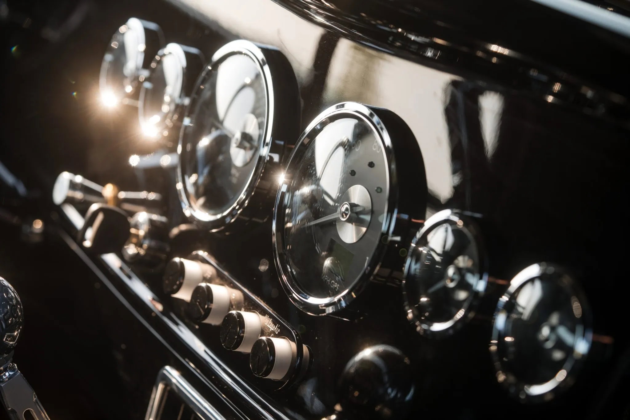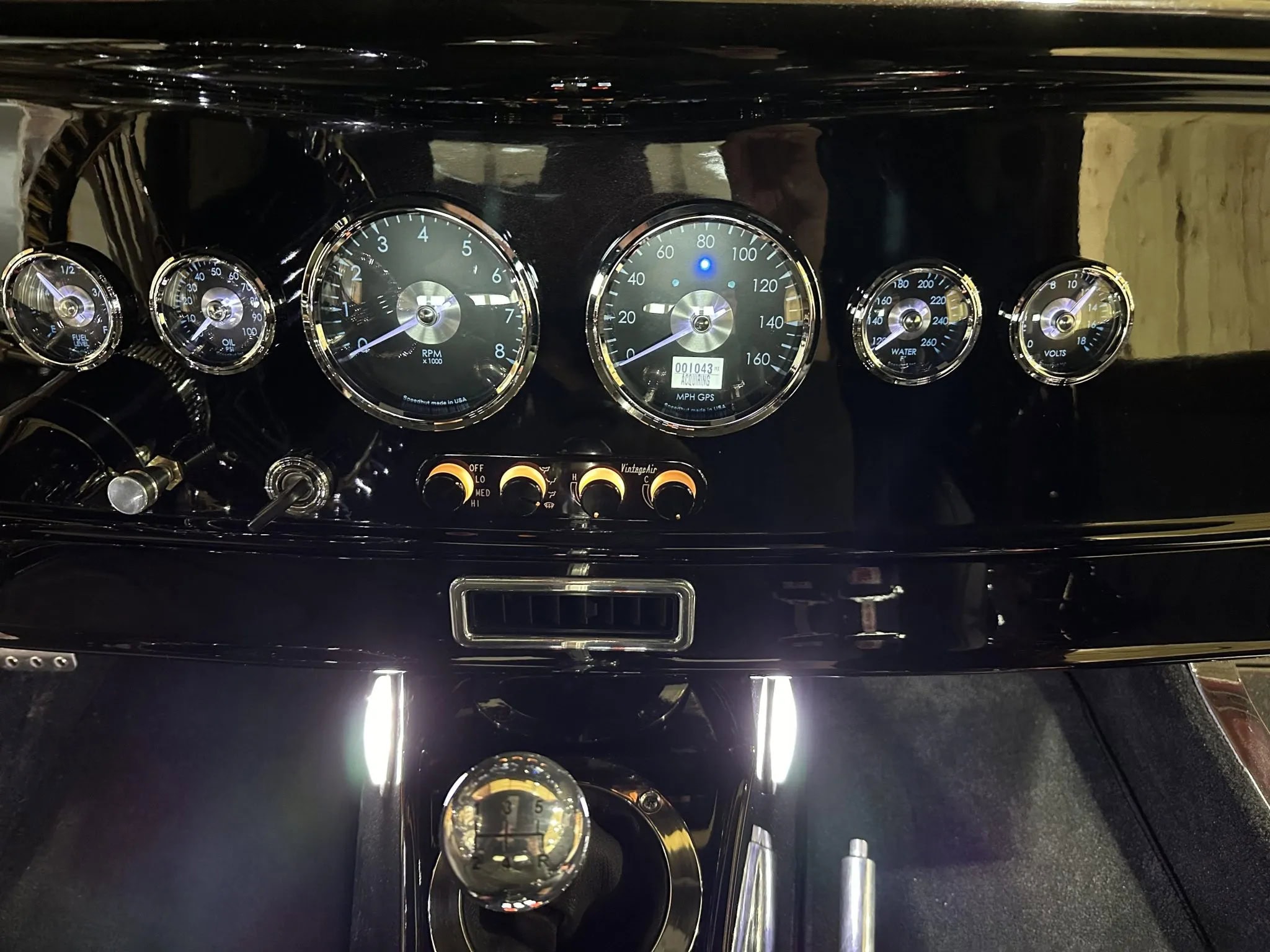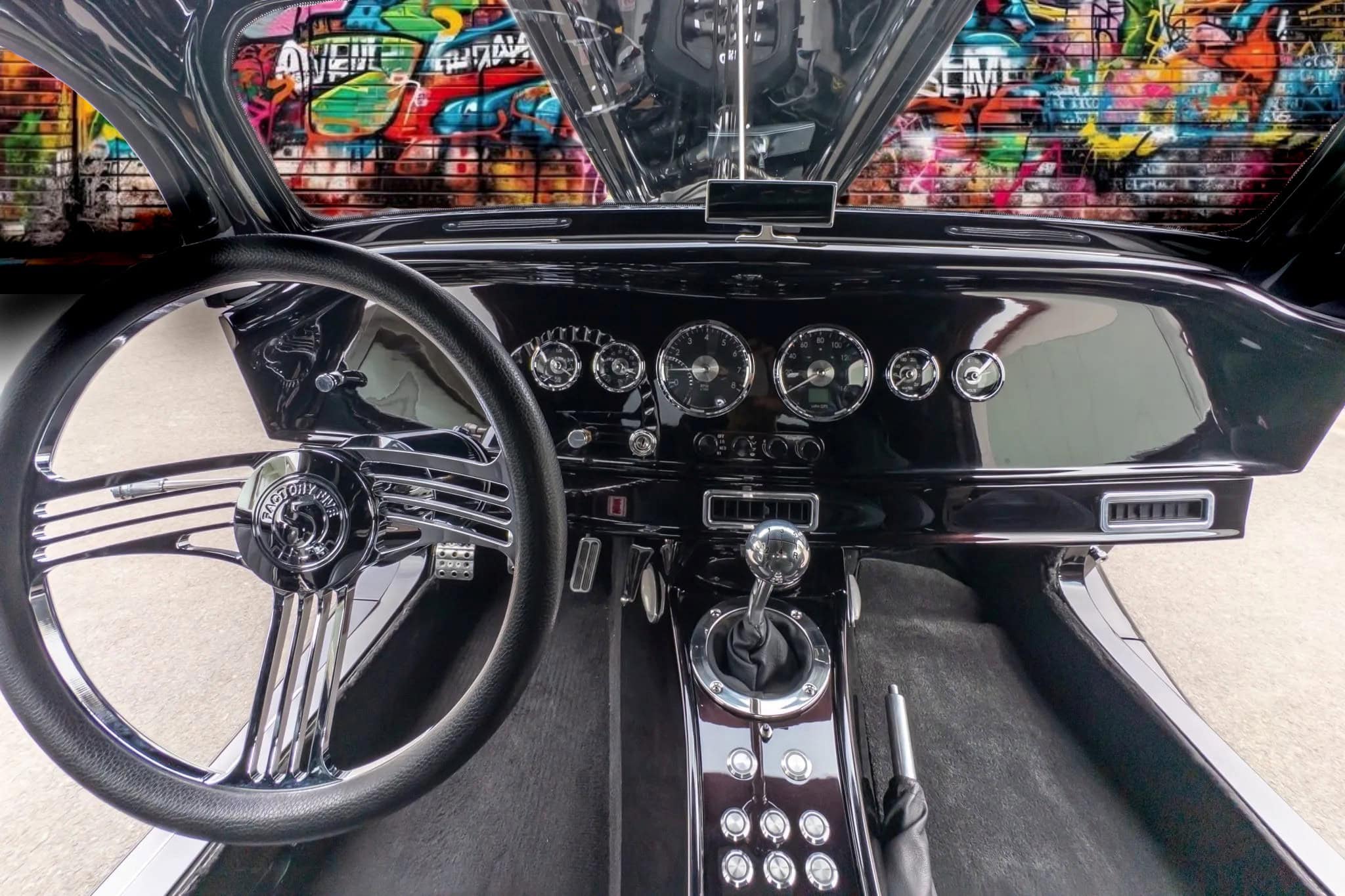 Il y a aussi des pédales en aluminium usiné et un levier de vitesses Tremec avec une plaque de changement de vitesse à grille façon Ferrari comme déjà tapoté plus avant… Le volant Factory Five gainé de cuir est monté sur une colonne de direction inclinable Ididit et se trouve devant un tableau de bord Speedhut comprenant un compteur de vitesse GPS gradué jusqu’à 260 km/h, un compte-tours et des indicateurs auxiliaires pour le niveau de carburant, la pression d’huile, la température du liquide de refroidissement et la tension.