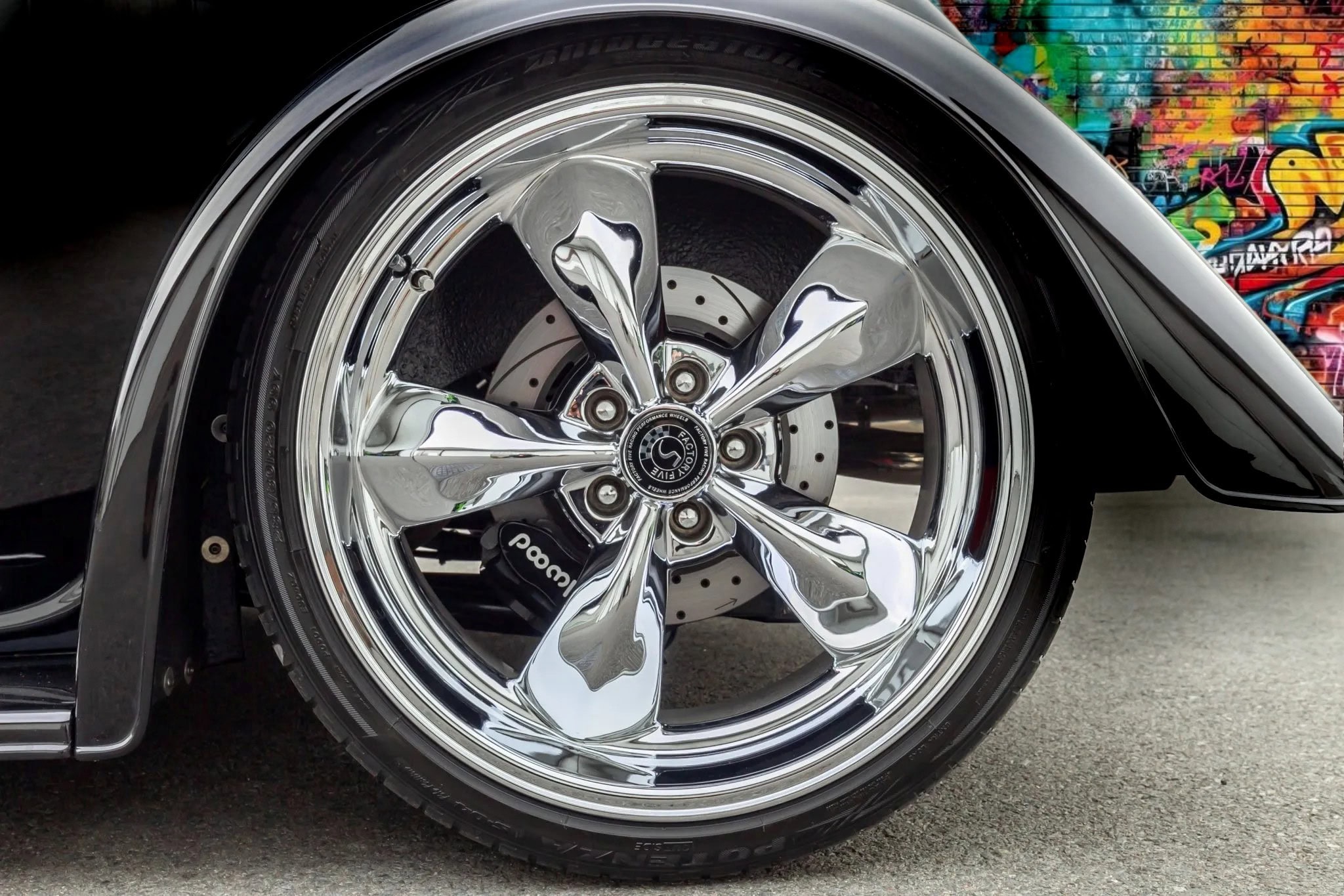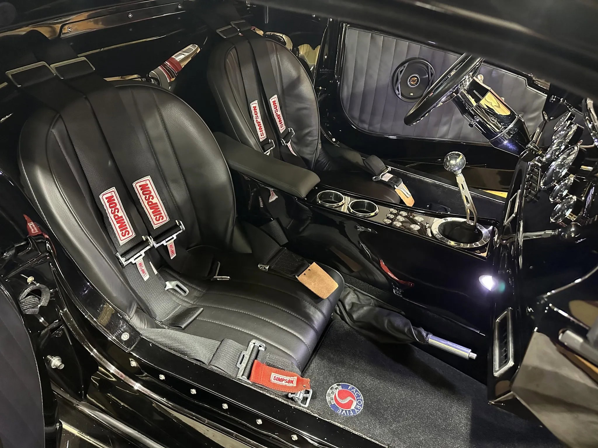 Elles sont chaussées de pneus Bridgestone Potenza en respectivement 245/40 et 285/30. Le freinage est assuré par des étriers Wilwood montés sur des disques percés, rainurés et auto-ventilés aux quatre roues. La bête est équipée d’une direction assistée électrique. Les sièges baquets sont garnis de cuir noir et équipés de harnais Simpson à verrouillage et à maillons, tandis que les autres éléments comprennent la climatisation Vintage Air, les vitres électriques, l’éclairage LED, une radio cachée Custom Autosound SRMS, des tapis de sol de marque Factory Five.