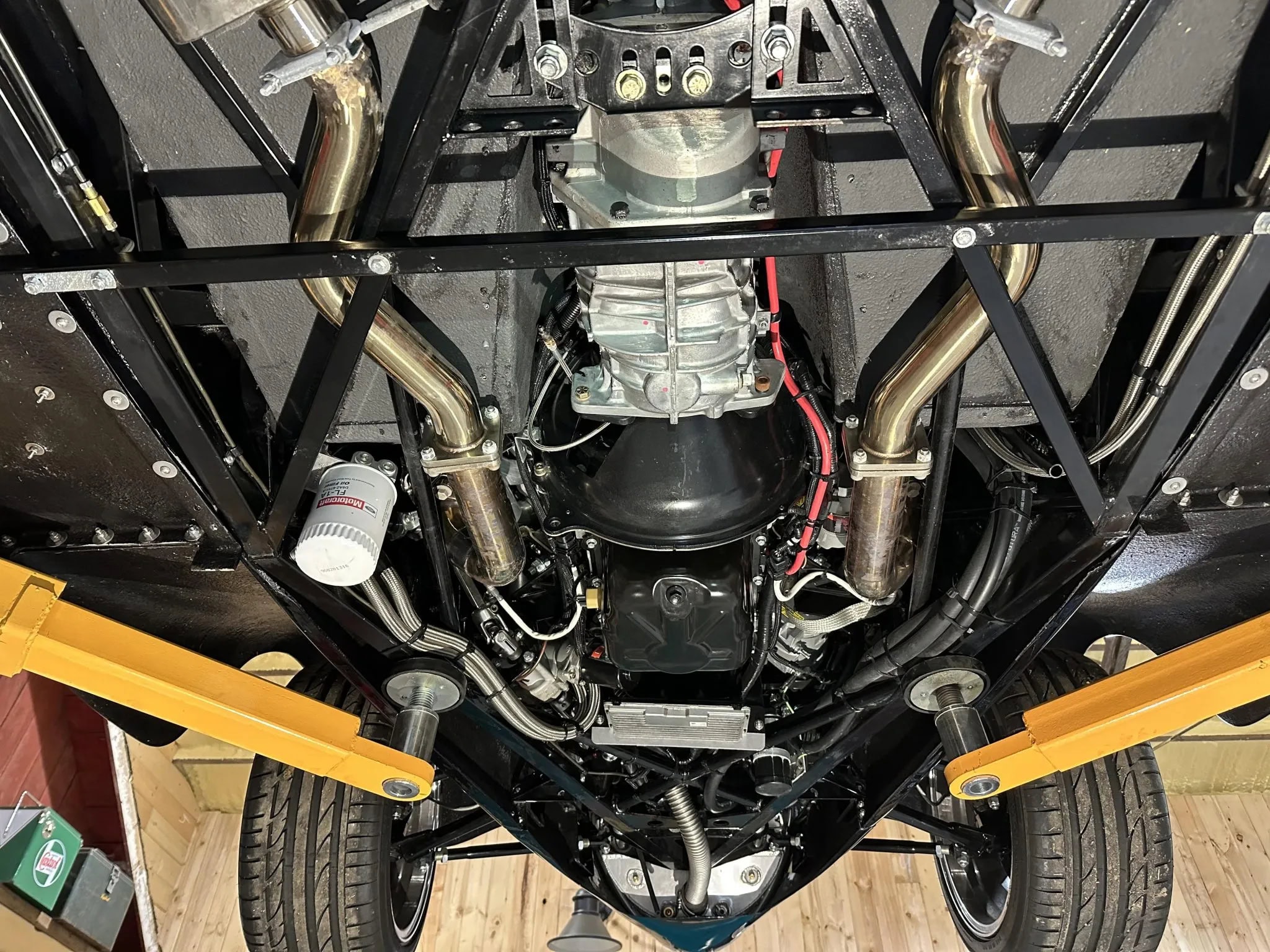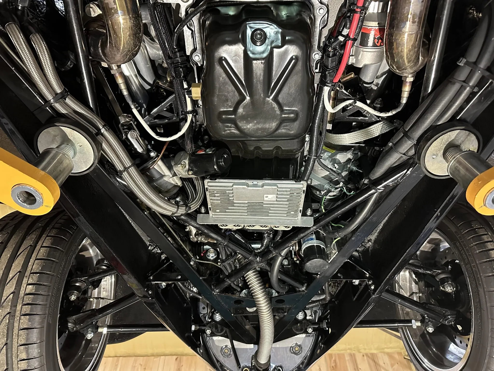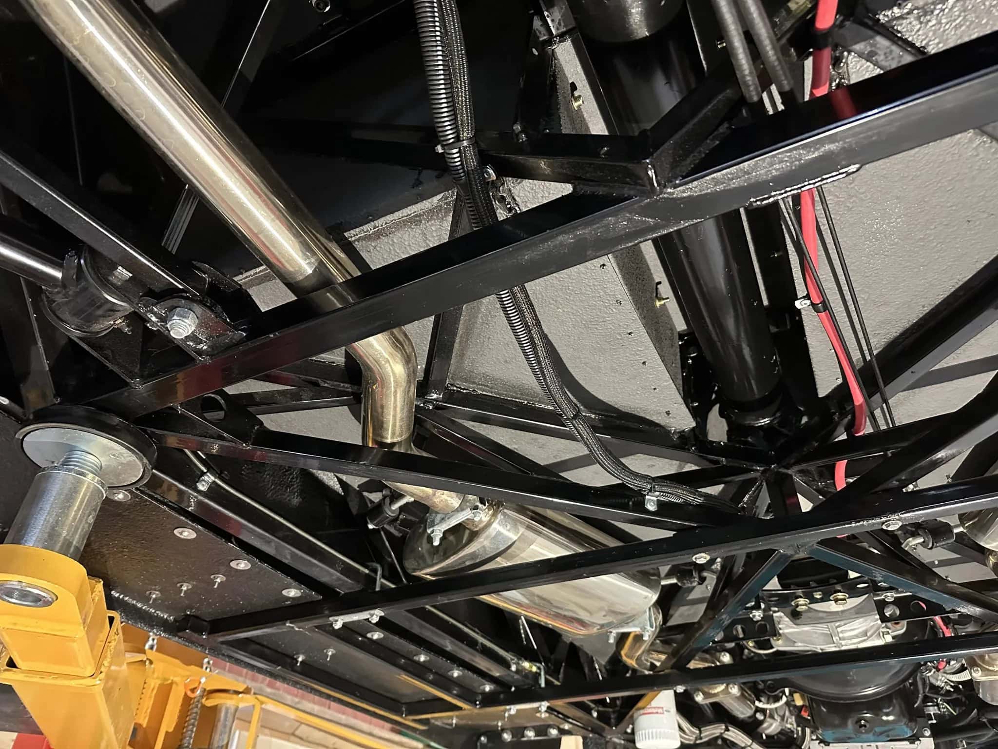 Le toit, les ailes, les marchepieds et les panneaux latéraux sont amovibles. La voiture est également équipée de portes à ouverture antagoniste (suicides), de feux arrière à LED et d’une double sortie d’échappement. Elle est équipée d’amortisseurs réglables aux quatre coins et dispose d’une suspension avant de type cantilever avec des bras de suspension supérieurs tubulaires et des bras inférieurs réglables, tandis qu’une suspension à trois bras est utilisée à l’arrière. Les jantes chromées à cinq branches sont des 17po AV et 20po AR.