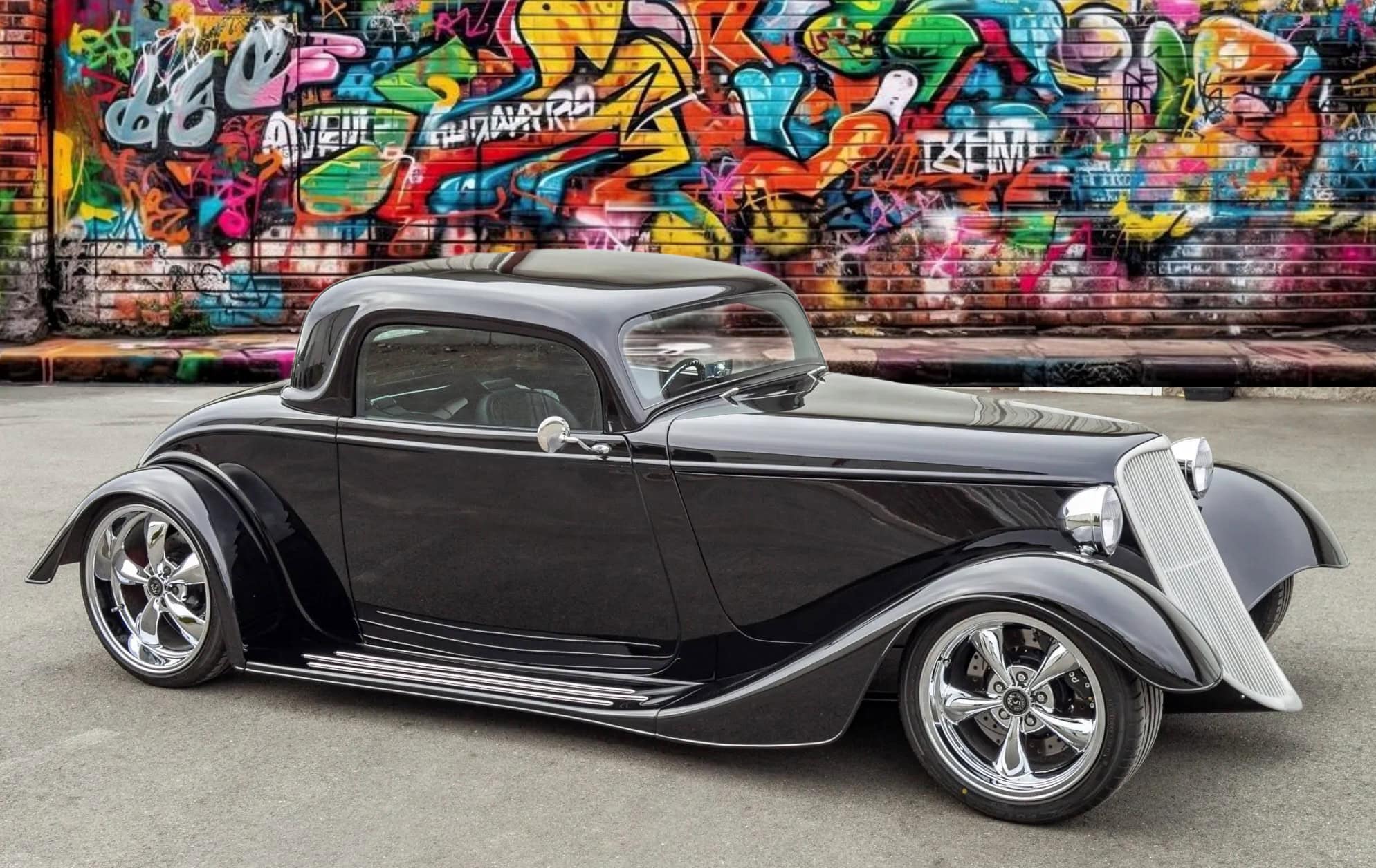 L’intérieur comprend des sièges baquets, des harnais de course Simpson, un levier de vitesses Tremec avec grille façon Ferrari, des instruments Speedhut, une climatisation Vintage Air et une radio Custom Autosound dissimulée. Ce Hot Rod daté 1933 selon les lois américaines alors qu’il est 100% neuf dispose d’une carte grise de l’Oregon “en règle”, mentionnant qu’il s’agit d’un modèle ASVE de 2014… Essayez ça en France pour voir… La carrosserie composite, réalisée à la main, s’inspire d’un coupé Ford trois fenêtres de 1933 et est peinte en noir avec une touche de peinture rouge nacrée.