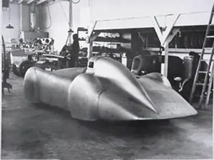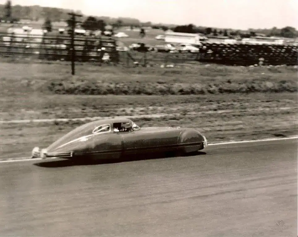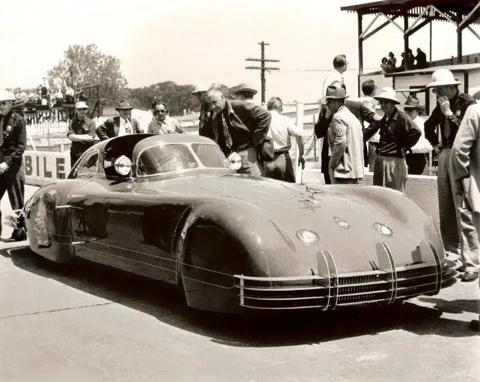 L’histoire de la Supersonic, ne commence d’ailleurs pas avec le dénommé Lou Fageol, mais avec Joel Thorne, un millionnaire playboy, pilote d’IndyCar et aviateur. Vers la fin des années 1930, Joel Thorne avait chargé Art Sparks (son partenaire sur de nombreuses voitures IndyCar), de concevoir un prototype de “bolide terrestre” à double moteur Miller, destiné à défier les écuries Mercedes-Benz et Auto Union qui se disputaient alors les records de vitesse sur circuit fermé. Art Sparks a fait appel au légendaire carrossier Emil Diedt pour fabriquer une carrosserie en aluminium. Dix ans plus tard, le prototype était toujours inachevé et Joel Thorne, ayant dépensé tout son argent de poche, a proposé à Lou Fageol (cité ci-dessus) de lui racheter son projet. Lou Fageol était un habitué d’Indianapolis à cette époque, notamment pour promouvoir les moteurs six cylindres de pointe produits par un constructeur d’autobus : Twin Coach Co… Lou Fageol s’est donc approprié du projet…