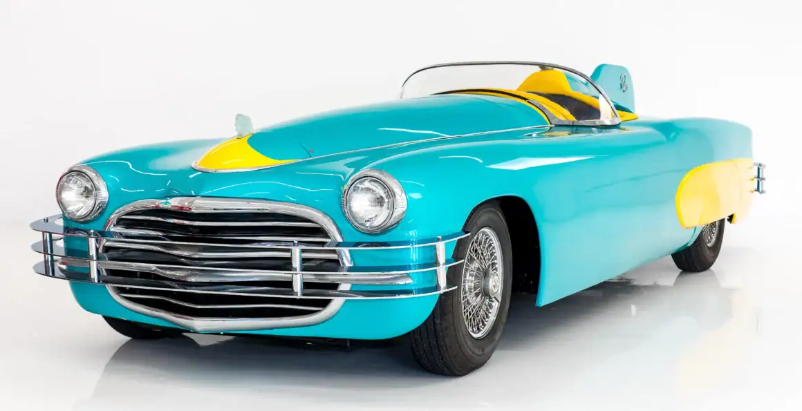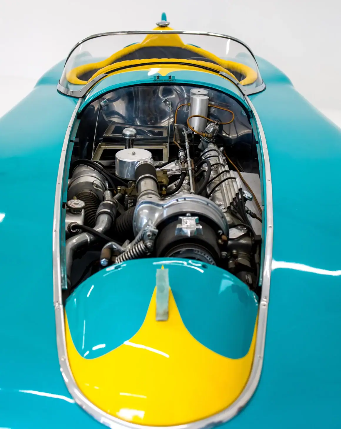 Il a également ré-utilisé des sièges provenant du même autobus Twin Coach, sans toutefois vouloir de portes sur les côtés… Au lieu de cela, il a fait installer par l’atelier un toit coulissant vers l’arrière, intégré à la ligne fastback effilée… C’était innovant, spectaculaire mais peu pratique ! Des phares d’ailes de piste de bombardiers North American B-25 Mitchell, encastrés dans l’avant de la voiture, servaient de phares principaux, complétés par deux projecteurs fixés sur les montants. Selon Ray Fageol, son père avait initialement prévu de la faire courir aux 500 Miles d’Indianapolis de 1949… “Ce n’était pas qu’une simple voiture d’exhibition, mais une super Sport avant-gardiste annoncée comme ayant une vitesse de croisière moyenne de 150 km/h, mais capable de grimper à 300km/h… La voiture de 1.588 kg ne put toutefois se qualifier pour la grille de départ des 33 voitures. En guise de consolation, Wilbur Shaw va la piloter lors de quelques tours de démonstration au cours desquels elle atteignit 201 km/h en ligne droite !”…