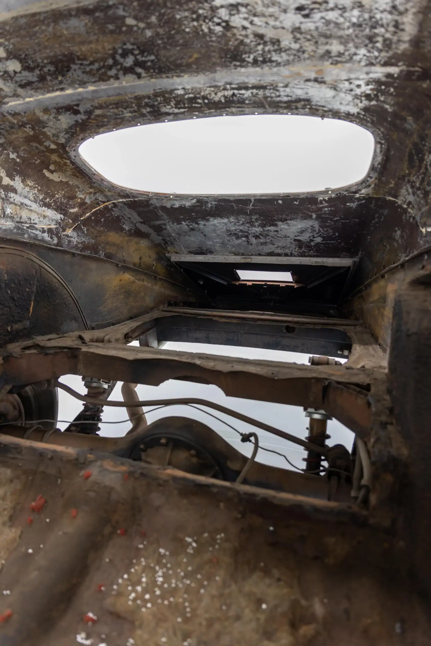On pouvait aussi voir où des éléments avaient été ajoutés. Même le toit ouvrant était toujours là, bien qu’élargi et les portes avaient simplement été découpées dans la tôle d’origine. En fait, les seuls éléments de carrosserie d’origine qui manquaient à l’appel étaient les enjoliveurs de roues arrière. Quant à la Pataray, hormis un compresseur McCullough ajouté par Tognotti et une nouvelle peinture, Ray Fageol a confirmé qu’elle était restée telle qu’il l’avait construite, ce qui signifiait que tous les éléments démontés de la Supersonic pour construire le prototype Hudson étaient toujours présents. Cela simplifiait considérablement la prochaine étape pour une restauration par Brinker consistant à soulever la carrosserie de la Pataray et y placer celle du prototype Hudson, puis retirer tous les éléments ajoutés à la Supersonic pour recréer le prototype Hudson. Le compresseur devant également être remplacé par le système d’alimentation à trois carburateurs d’origine de la Supersonic… Pffffffffffffffff !