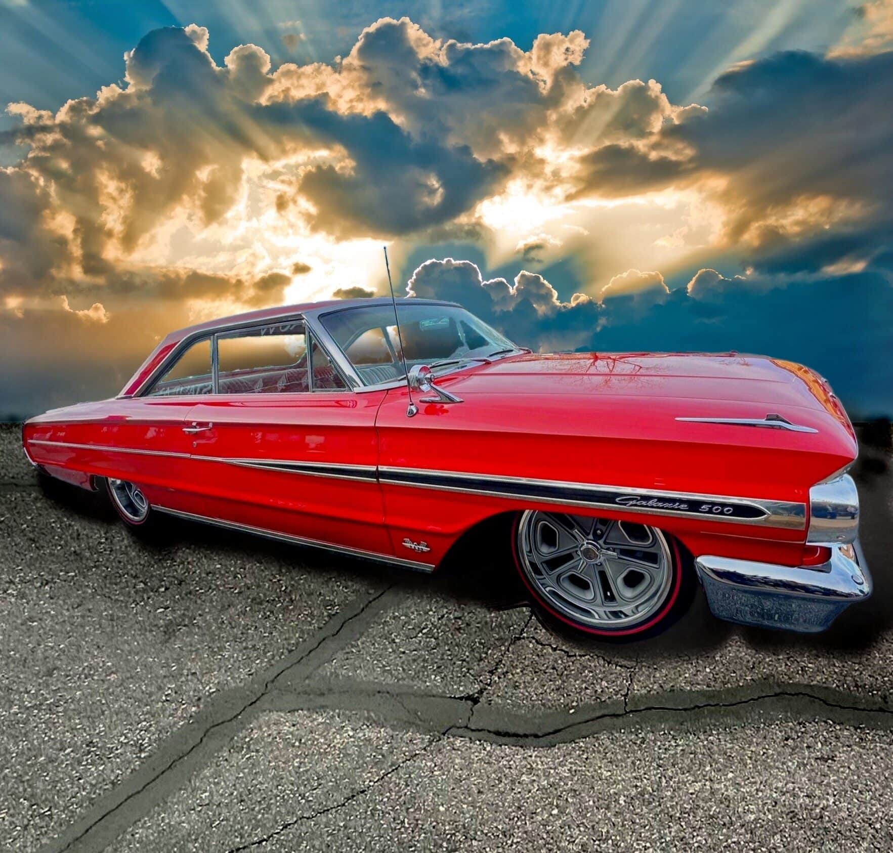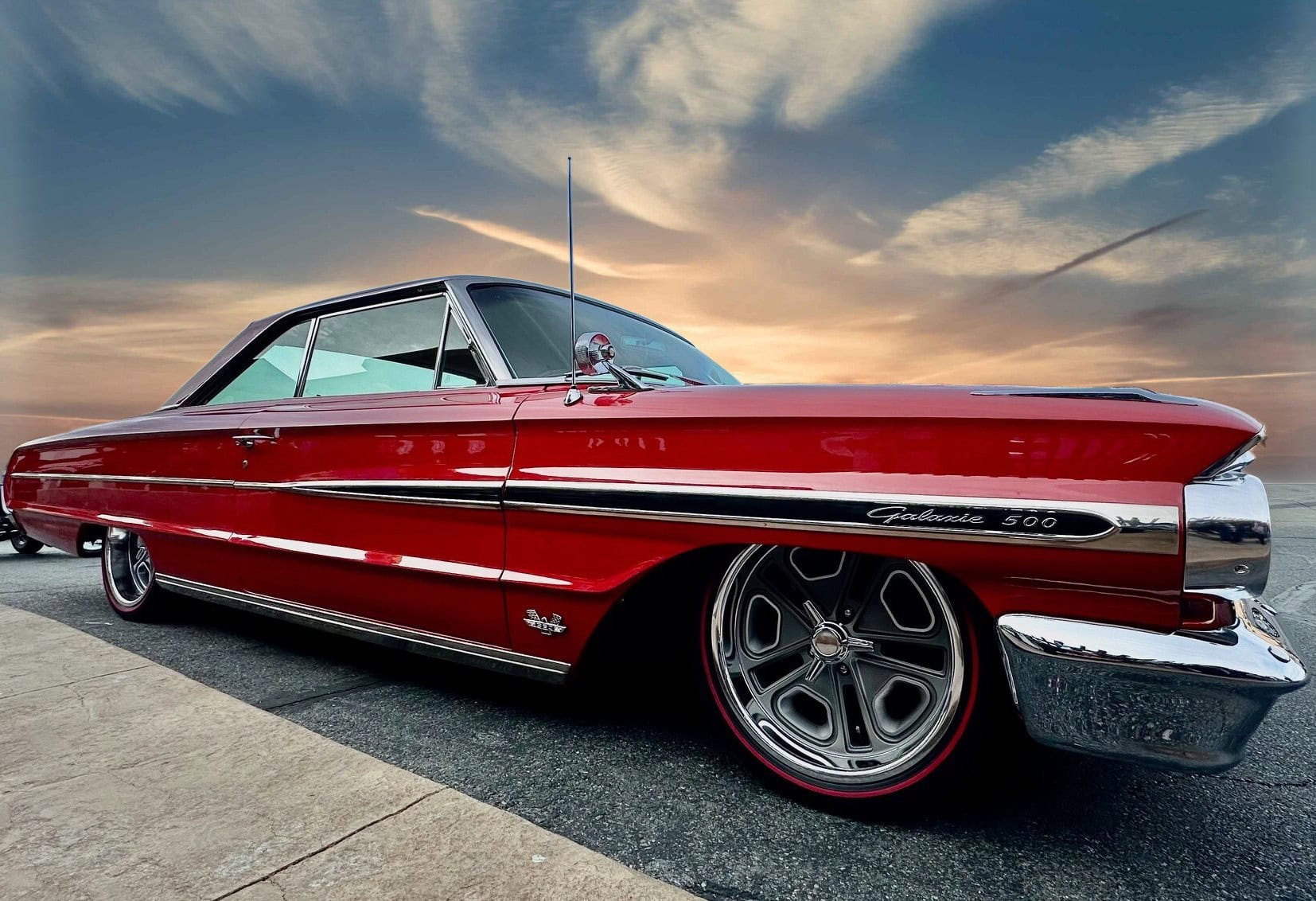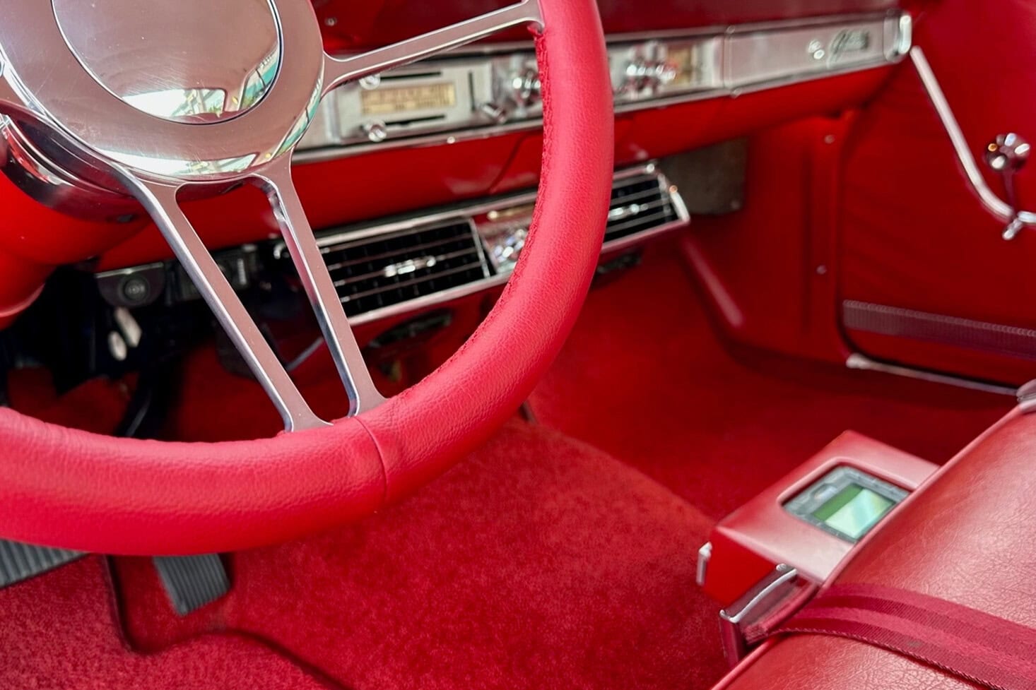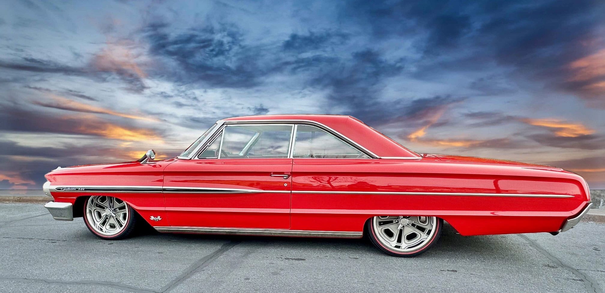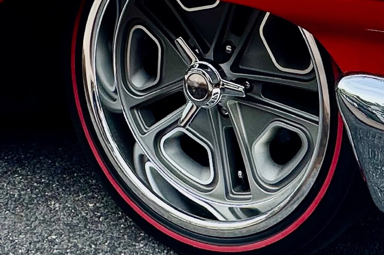 Tous les chromes, dont les pare-chocs avant et arrière, ont été refaits et les garnitures en acier inoxydable ont été polies. Un boîtier sur mesure a été intégré pour une commande embarquée dédiée permettant le réglage de la hauteur de caisse et de l’assiette (Dans l’habitacle il est surmonté de porte-gobelets escamotables). Le freinage est assuré par des disques Wilwood, avec des étriers à quatre pistons sur les quatre roues : “Je les ai gardés manuels, car je ne voulais pas d’un booster qui encombrerait tout. Mais, si c’était à refaire, j’opterais probablement pour un modèle électrique. Ça fonctionne actuellement très bien tel quel, mais il faut appuyer un peu plus fort sur la pédale que je ne le souhaiterais”, m’a dit John Gwenn, précisant qu’il allait sans doute monter un dispositif d’assistance électrique plus simple à réaliser… Les jantes sont de style resto : 18 pouces avant et 20 po arrière. Elles sont chaussées de pneus Diamond Back Redline. La Galaxie a ensuite été repeinte dans sa couleur d’usine d’origine : Rouge Rangoon (code peinture Ford M30J-1515).
