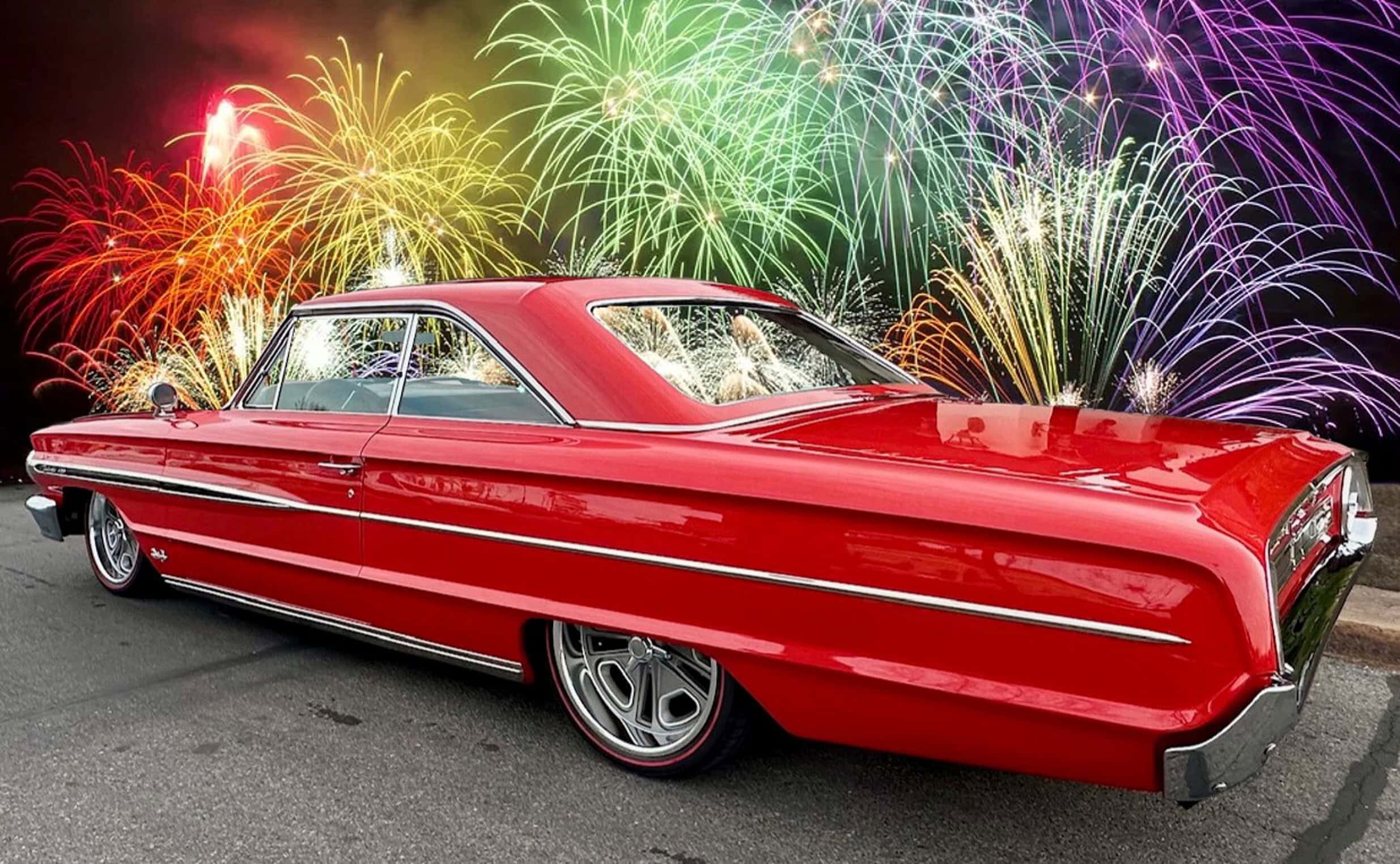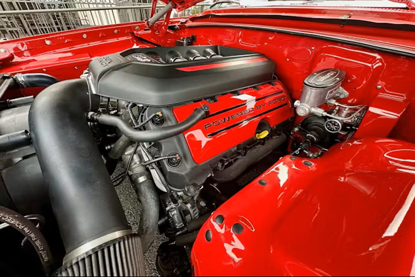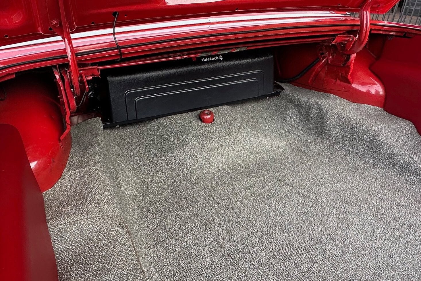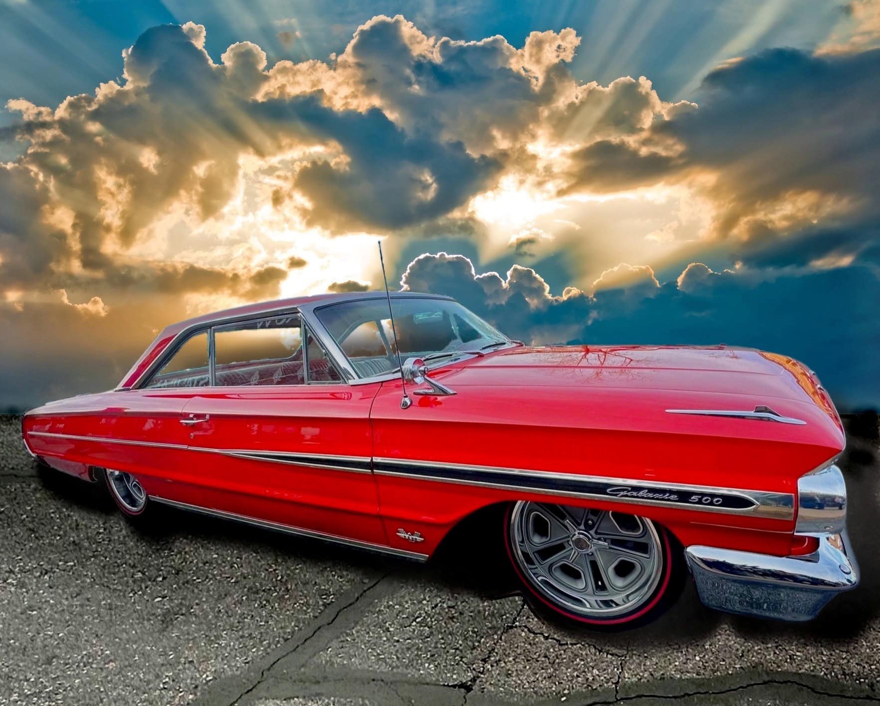 Tous les chromes, dont les pare-chocs avant et arrière, ont été refaits et les garnitures en acier inoxydable ont été polies. Un boîtier sur mesure a été intégré pour une commande embarquée dédiée permettant le réglage de la hauteur de caisse et de l’assiette (Dans l’habitacle il est surmonté de porte-gobelets escamotables). Le freinage est assuré par des disques Wilwood, avec des étriers à quatre pistons sur les quatre roues : “Je les ai gardés manuels, car je ne voulais pas d’un booster qui encombrerait tout. Mais, si c’était à refaire, j’opterais probablement pour un modèle électrique. Ça fonctionne actuellement très bien tel quel, mais il faut appuyer un peu plus fort sur la pédale que je ne le souhaiterais”, m’a dit John Gwenn, précisant qu’il allait sans doute monter un dispositif d’assistance électrique plus simple à réaliser… Les jantes sont de style resto : 18 pouces avant et 20 po arrière. Elles sont chaussées de pneus Diamond Back Redline. La Galaxie a ensuite été repeinte dans sa couleur d’usine d’origine : Rouge Rangoon (code peinture Ford M30J-1515).