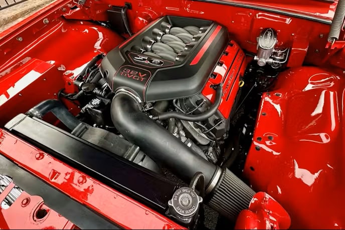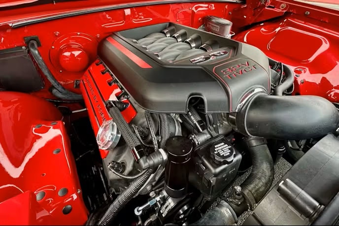 Longue, basse et méchante, cette magnifique Galaxie 500 appartient à John Gwenn qui l’a acquis de son frère, qui l’avait achetée directement au concessionnaire Ford de Kansas City. Une fois entre les mains de John, cette Galaxie a été entièrement démontée, la carrosserie étant mise a nu sur un nouveau châssis Fatman complet avec une suspension pneumatique Air Ride Technologies. Il comprend des composants et des compresseurs RideTech. Un moteur Coyote 5.0. de Mustang GT 2014 de 420cv n’ayant que 32.000 kms a été greffé, toujours associé à sa boîte automatique à surmultiplication. Les gaz d’échappement sont évacués par deux silencieux Flowmaster. Pour un refroidissement optimal, un radiateur en aluminium à quatre rangées avec ventilateurs électriques a été installé. Les ventilateurs se déclenchent automatiquement lorsque la température du moteur dépasse 90 °C… De même lorsque la climatisation se met en marche pour rafraîchir l’habitacle lors des journées caniculaires de Las Vegas, où la température dépasse les 38 °C…