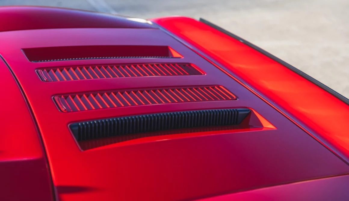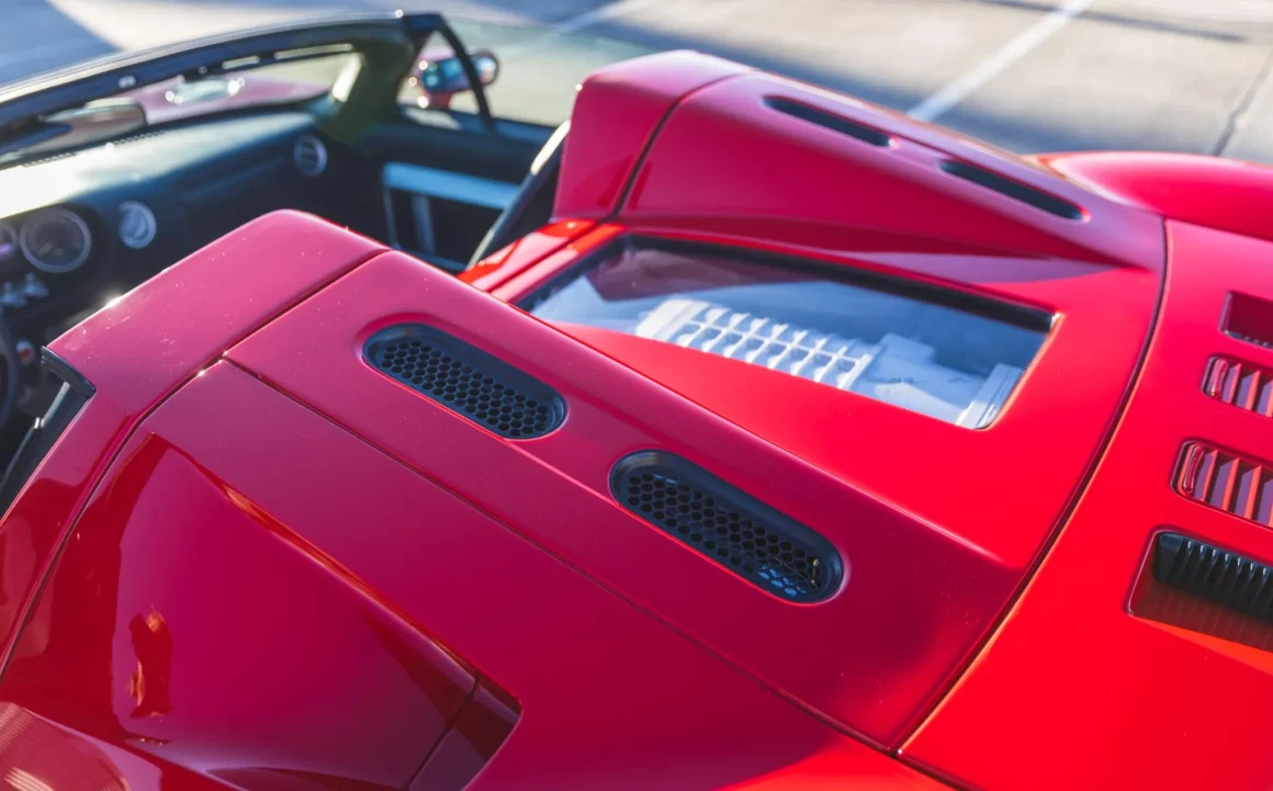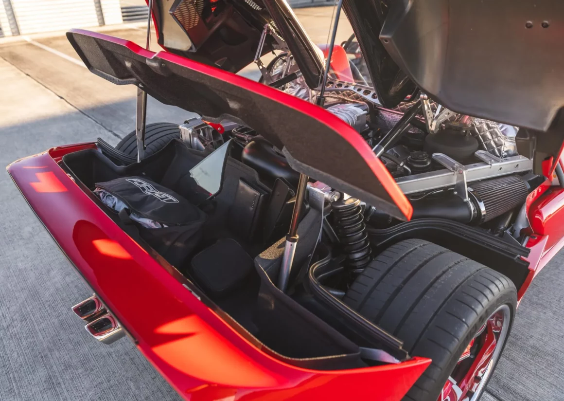 Egalement un ensemble aérodynamique en fibre de carbone Genaddi, un panneau de toit amovible en fibre de carbone, des portes en ciseaux, un pare-chocs arrière contenant un espace de rangement inédit, un coffre arrière (chauffant), une caméra de recul, un levier de vitesses à court débattement, des sièges baquets Sparco avec œillets argentés et un système d’infodivertissement à écran tactile Pioneer.