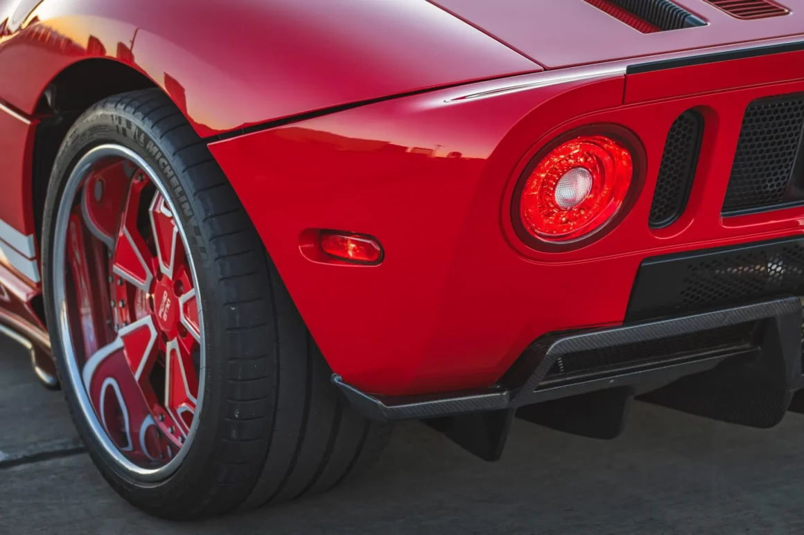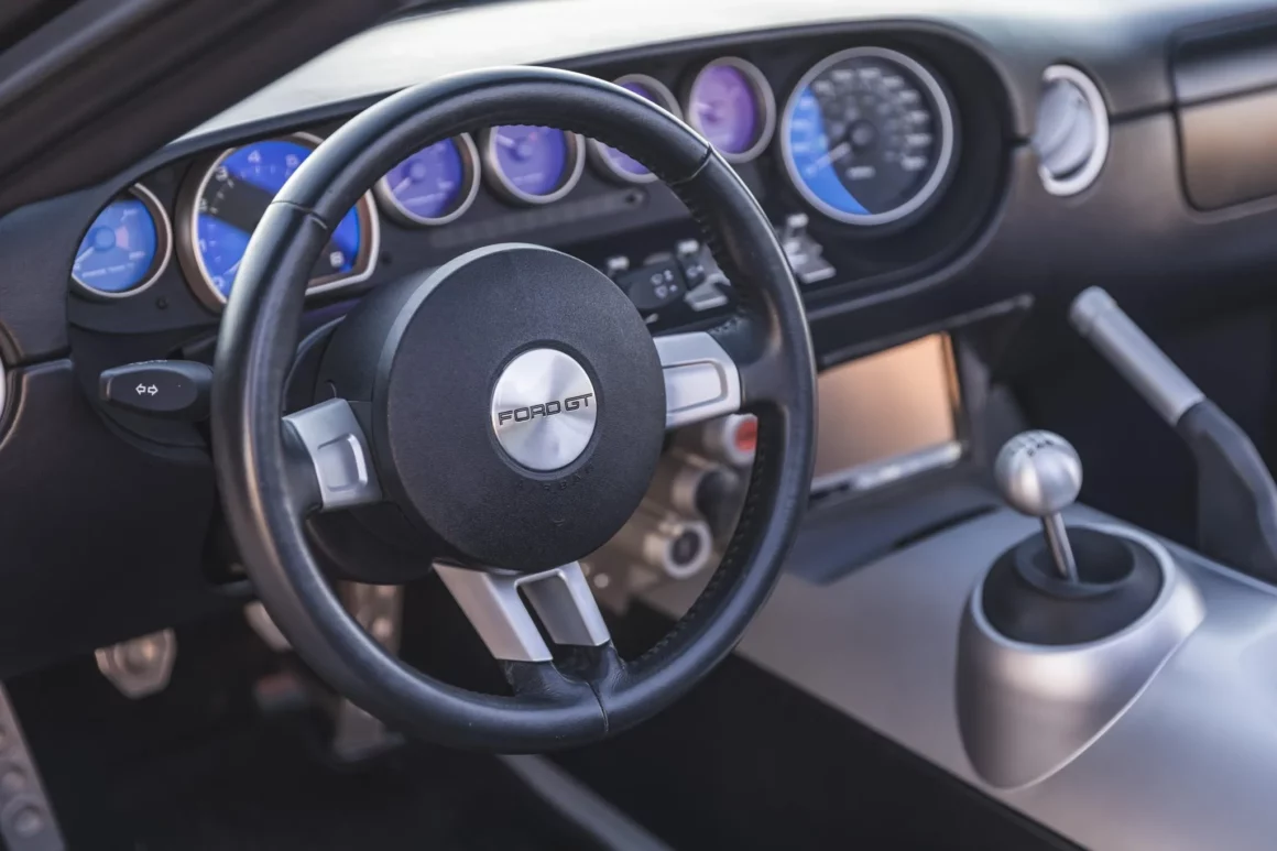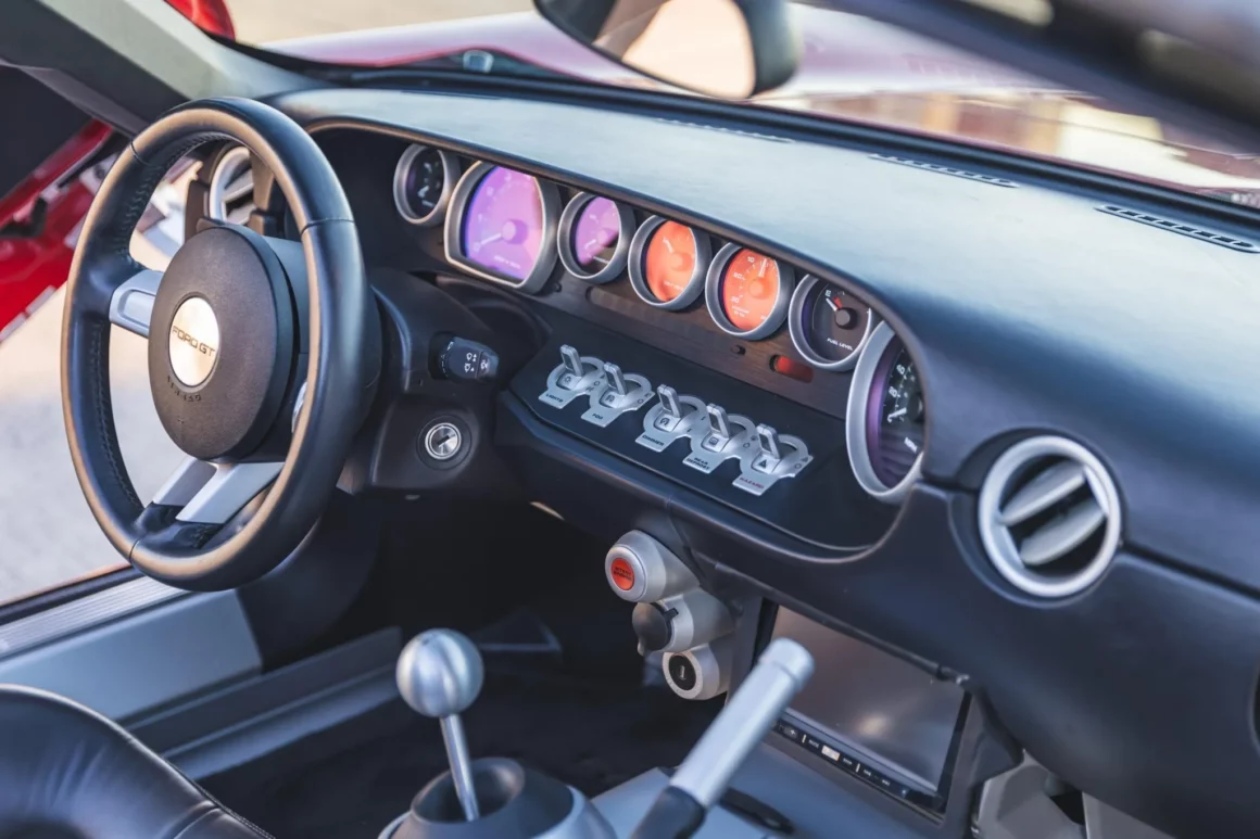 Mais une fois le problème de moulage résolu, tous les modèles suivants sont revenus à la conception originale en fonte d’aluminium. Les options pour la Ford GT étaient assez nombreuses : chaîne stéréo McIntosh avec un caisson de basses entre les sièges (4.000 $), jantes forgées BBS (4.000 $), bandes centrales façon course peintes (5.400 $), étriers de frein rouges ou gris (750 $) et suppression optionnelles gratuite des bandes latérales très rare (0 $).