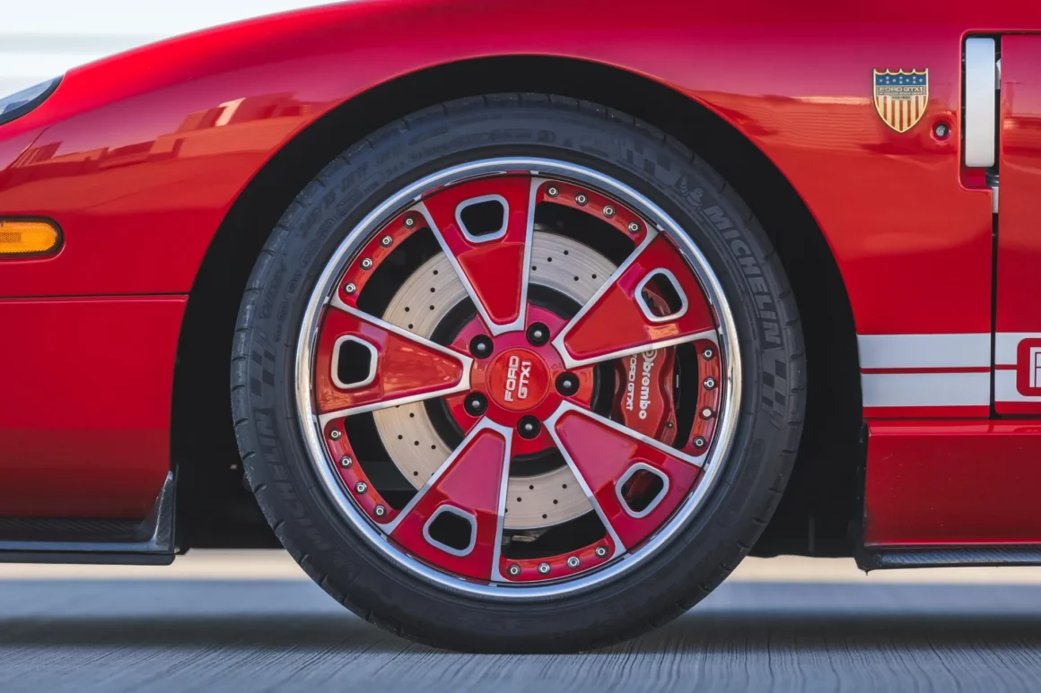 Les jantes GTX1 SEMA rouges en trois parties présentent des accents chromés. Ils sont montés avec des pneus Michelin Pilot Super Sport 265/35 à l’avant et 335/30 à l’arrière. Le système de freinage Brembo est doté d’étriers monoblocs à quatre pistons peints en rouge avec la marque Ford GTX1 sur des disques ventilés et percés qui mesurent 14 pouces à l’avant et 13,2 pouces à l’arrière.
