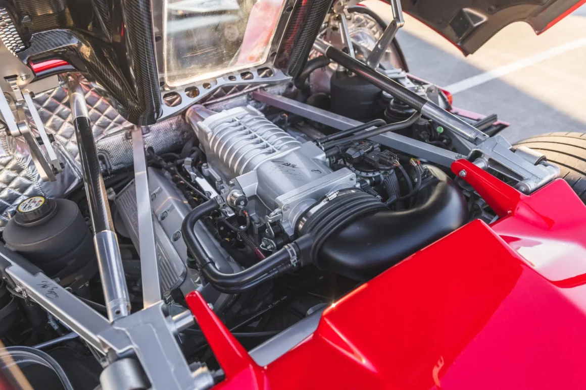 La voiture est finie en rouge Mark IV sur cuir noir, et la puissance provient d’un V8 suralimenté de 4,8 litres équipé d’une mise à niveau Ford Performance et lié à une boîte-pont manuelle Ricardo à six vitesses avec un différentiel à glissement limité hélicoïdal. Les caractéristiques comprennent un refroidisseur de boîte-pont, un système d’échappement Cat-back en acier inoxydable, et des jantes GTX1 SEMA de diamètre décalé.