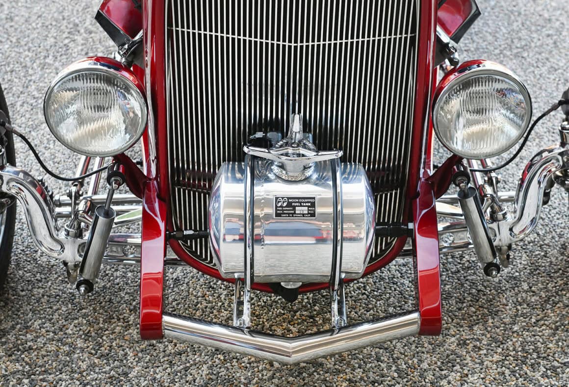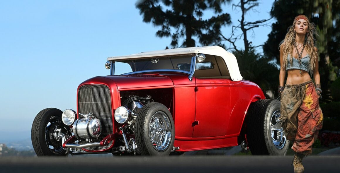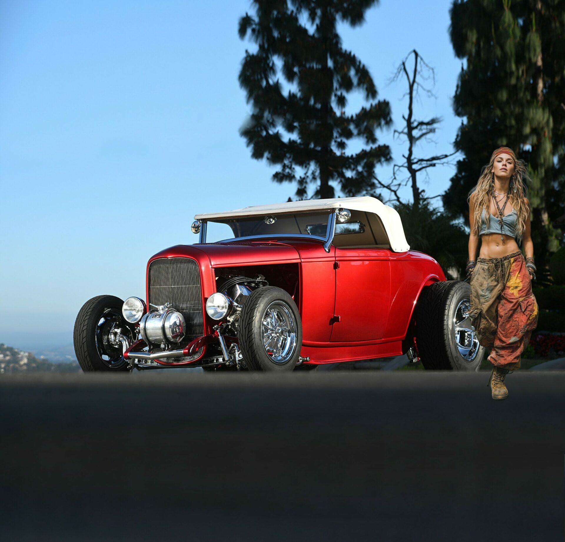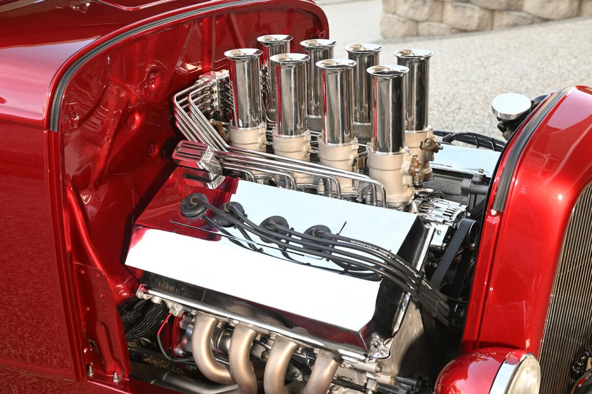 Qui d’autre ? Donc, je suis fou de persévérer à publier mes articles tel celui-ci mettant en vedette le B’32 de Ken et Tina Thurm du sud de la Californie, membres des California Roadsters, qui ont construit et possédé de nombreux et superbes Hot Rod’s Deuce… Il convient également de noter que leur Roadster’32 rouge était en compétition pour le prix du “Plus Beau Hot Rod Roadster d’Amérique en 2024. J’ai eu une excellente conversation avec Ken sur la construction de son Hot Rod Ford Highboy Roadster’32… Son moteur est un Ford Coyote 5.0L 2002 en aluminium. À première vue, les caches de soupapes distinctifs peuvent induire en erreur sur ce qu’est ce V-8, tout comme l’injection rare, basée/récupérée sur ce qui avait été conçu pour le programme de course Indy Gurney-Weslake 1965… Ce qui était une injection mécanique est aujourd’hui un V8 EFI modernisé grâce au procédé d’ingénierie de Ken Thurn.