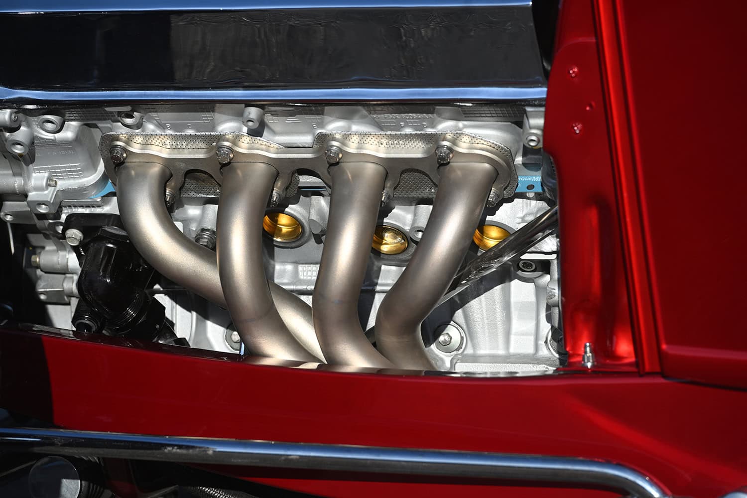 Il l’a conçu avec des commandes électroniques, intégrant une pompe à carburant Bosch, des injecteurs LS7, une bobine MSD, des fils Taylor, une batterie Optima (montée sous le capot derrière le tableau de bord), un arbre à cames Comp, une courroie MSD et une détente électronique. Le système d’échappement est une autre haut fait grâce aux mains habiles du constructeur Rod Sexton, utilisant des collecteurs en acier inoxydable de 1,5po et des silencieux sur mesure. Des accessoires moteurs supplémentaires comprennent une pompe à eau électrique Meziere cachée sous le siège, des ventilateurs électriques de FanMan, et un démarreur Powermaster… Ken Thurn a réutilisé un alternateur de chariot élévateur Toyota de 85 ampères, l’installant méticuleusement avec des supports personnalisés.