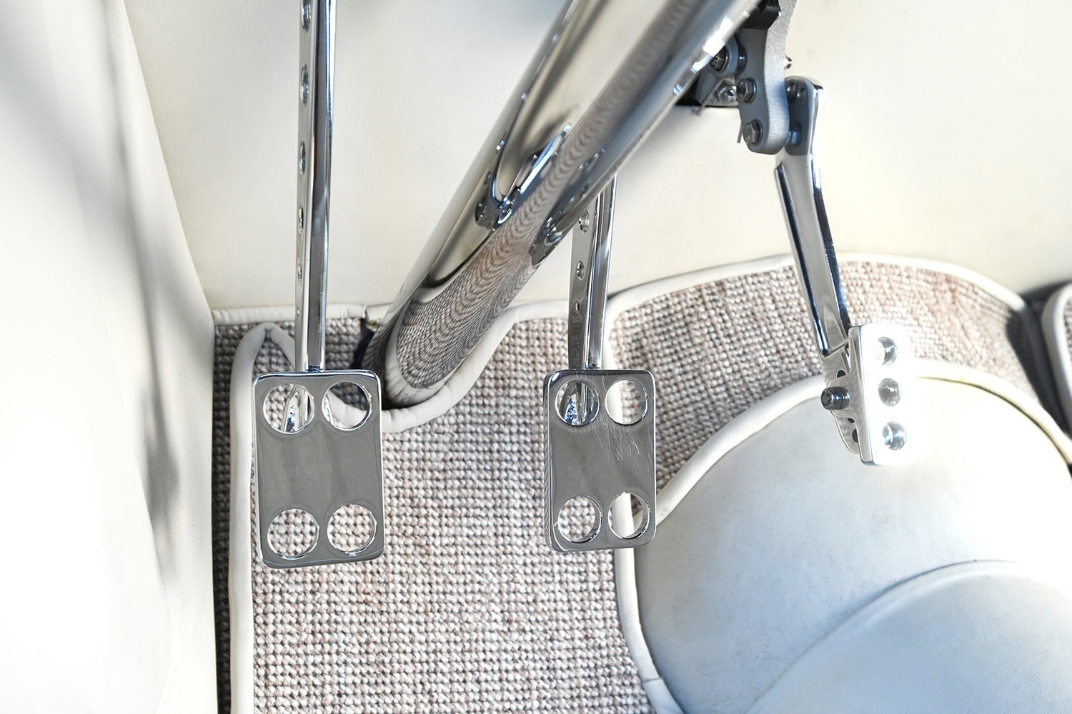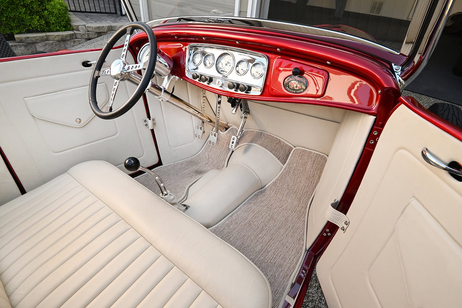 L’intérieur présente un tableau de bord Brookville qui abrite désormais des compteurs Stewart-Warner reposant sur un panneau chromé. La colonne de direction est artisanale “by Ken” et le compte-tours y est fixé avec un volant à quatre branches percées de style Sprint Car. Un panneau de fusibles Centech et un interrupteur d’extinction de batterie sont utilisés. Un chauffage a été installé sous les sièges/banquette. Du cuir blanc cassé Mercedes y est utilisé ainsi que sur les portes et panneaux. Il ne fait aucun doute que le sud de la Californie est le pays des Hot-Roadsters et des highboys qui se sentent particulièrement chez eux, parcourant des milliers de kilomètres de routes et d’autoroutes avec de nombreux sites pittoresques à admirer et des endroits où se faire un repas. Le Roadster dispose d’une capote et d’un Hard-Top pour les rares jours humides, au cas où….
