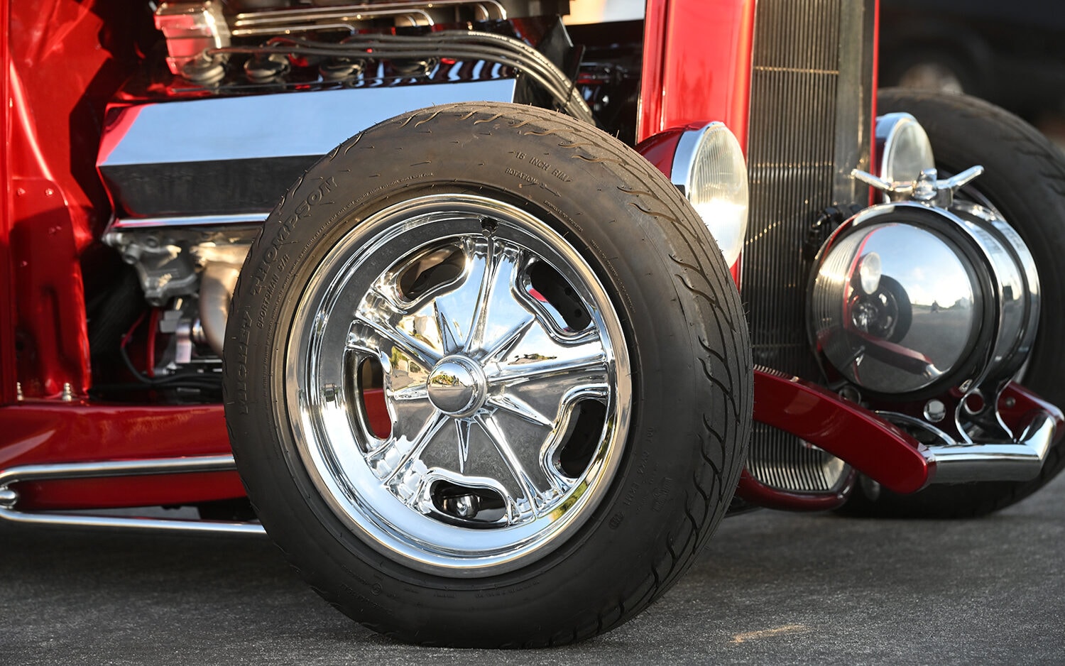 Ensemble, cette configuration produit une puissance impressionnante approchant les 500 chevaux ! Parmi les autres accessoires se découvrent les jantes Rebel Spindle en 15×5 AV et Mike Curtis 18×10 AR avec pneus Mickey Thompson 24×5,00 AV et 285/60R18 AR… L’essieu Magnum avant a été rétréci, percé et chromé. Des amortisseurs à tubes Bilstein chromés, une direction UniSteer à crémaillère et pignon, et le travail de Ken dans la barre stabilisatrice avant usinée complètent l’avant. Le réservoir Moon à l’avant sert de point de remplissage pour le réservoir d’essence situé dans le coffre juste derrière les sièges/banquette. Les rails de châssis de l’American Stamping Corporation, mettent en valeur le travail et l’artisanat de Ken. Il a relevé le châssis avant de 3po et l’arrière de 4 po, ensuite, il a raccourci l’empattement à 103po (contre 106po d’usine) et prélevé 1,5po à la fois sur la zone du capot et à l’arrière.